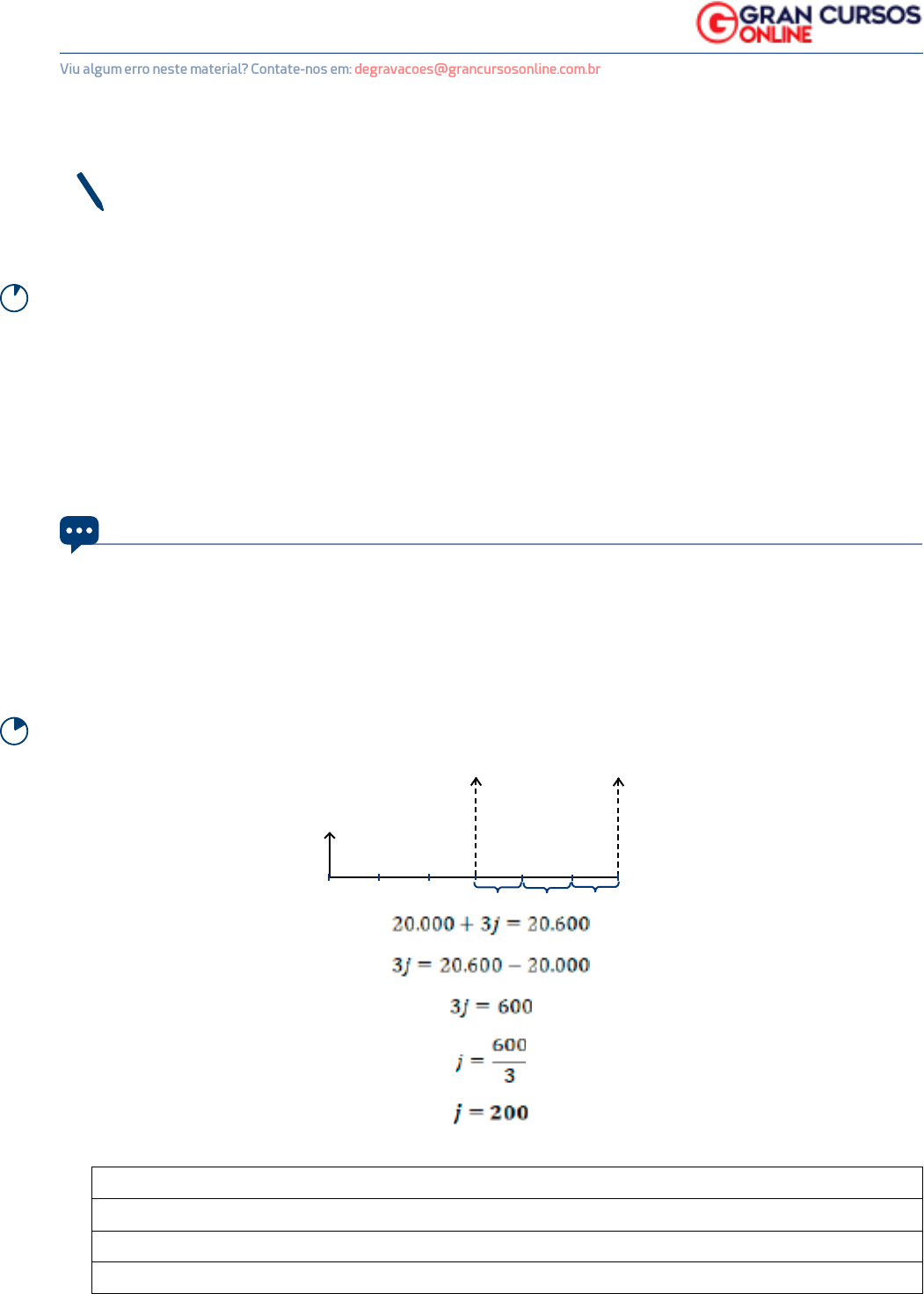 1 www.grancursosonline.com.br Viu algum erro neste material? Contate-nos em: degravacoes@grancursosonline.com.br Juros Simples – Resolução de Exercício de Fixação MATEMÁTICA FINANCEIRA A N O TA ÇÕ E S JUROS SIMPLES – RESOLUÇÃO DE EXERCÍCIO DE FIXAÇÃO EXERCÍCIOS DE FIXAÇÃO 1. Se José aplicar certo capital, juros simples, por cinco meses, obterá um montante de R$ 20.000,00. Entretanto, se deixar a mesma aplicação seguir por mais três meses, o montante então seria de R$ 20.600,00. Assim, o capital que José aplicou foi de: a. 17.000 b. 18.000 c. 19.000 d. 19.200 e. 19.600 COMENTÁRIO O enunciado da questão não trouxe algumas informações importantes, tais como o valor do capital, o valor de juros e a taxa da operação. Sabe-se apenas que se trata de uma operação de juros simples. Vale lembrar que, nas operações de juros simples, a cada período que se passa, a taxa volta a incidir sobre o valor do capital. Dessa forma, os juros produzidos em cada período é sempre o mesmo. Entre R$ 20.000,00 e R$ 20.600,00 existem três períodos. Assim: C 0 jjj 20.000 20.600 5m 10m 2 www.grancursosonline.com.br Viu algum erro neste material? Contate-nos em: degravacoes@grancursosonline.com.br Juros Simples – Resolução de Exercício de Fixação MATEMÁTICA FINANCEIRA A N O TA ÇÕ E S Ou seja, em cada mês dessa operação, os juros acumulados são de R$ 200,00. Isso terá acontecido desde o primeiro mês em que essa operação se iniciou. Logo: C 0 jjj 20.000 20.600 jjj Sabendo que o capital é de R$ 19.000,00, também é possível calcular a taxa e outros da- dos que a banca venha a solicitar. Considerando como exemplo a questão acima, tem-se o seguinte modelo: C 0 8m5m M' M'' Nesse caso, há um único capital, que aplicado por cinco meses chega a um determinado montante; há outro montante em oito meses de aplicação. No entanto, a banca examinadora poderia elaborar algumas variações sobre esse enun- ciado, conforme se observa a seguir. “Se José aplicar um capital por cinco meses, chegará a um montante de R$ 20.000,00. Contudo, se José fizer outra aplicação com o dobro do capital da primeira e mantê-la por oito meses, chegará a um montante de R$ 41.200,00. Ambas são operações de juros simples e foram realizadas a uma mesma taxa de juros. Qual é o valor do primeiro capital aplicado por José?" 15m 20m 3 www.grancursosonline.com.br Viu algum erro neste material? Contate-nos em: degravacoes@grancursosonline.com.br Juros Simples – Resolução de Exercício de Fixação MATEMÁTICA FINANCEIRA A N O TA ÇÕ E S C 0 5m 20.000 2C 0 8m 41200 Nesse caso, será necessário se valer da seguinte fórmula: É importante lembrar que, ao trabalhar a fórmula acima, como se trata de uma igualdade, tudo o que for feito em um lado da operação deve ser repetido com o outro. Ou seja, se o capital for dividido por dois, também será necessário dividir o mon- tante por dois: Assim, a ideia é fazer com que 2C se iguale a C. Para isso, é preciso dividir 2C por 2, sendo necessário dividir o montante de R$ 41.200,00 por 2. O resultado será: Como os capitais agora são iguais, então é possível colocá-los no mesmo desenho. 25m 4 www.grancursosonline.com.br Viu algum erro neste material? Contate-nos em: degravacoes@grancursosonline.com.br Juros Simples – Resolução de Exercício de Fixação MATEMÁTICA FINANCEIRA C 0 8m5m 20.000 20.600 Percebe-se que o novo desenho é igual ao da questão resolvida no início desta aula. Vale lembrar que tal modelo já foi cobrado em provas da banca FCC. GABARITO 1. c 30m ���������������Este material foi elaborado pela equipe pedagógica do Gran Cursos Online, de acordo com a aula preparada e ministrada pelo professor Sérgio Carvalho Filho. ��A presente degravação tem como objetivo auxiliar no acompanhamento e na revisão do conteúdo ministrado na videoaula. Não recomendamos a substituição do estudo em vídeo pela leitura exclu- siva deste material.