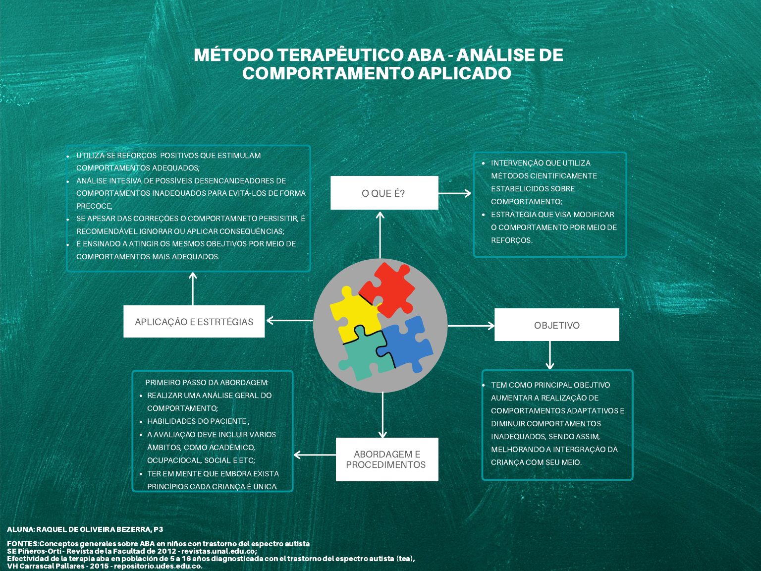 O QUE É? OBJETIVO ABORDAGEM E PROCEDIMENTOS MÉTODO TERAPÊUTICO ABA - ANÁLISE DE COMPORTAMENTO APLICADO INTERVENÇÃO QUE UTILIZA MÉTODOS CIENTIFICAMENTE ESTABELICIDOS SOBRE COMPORTAMENTO; ESTRATÉGIA QUE VISA MODIFICAR O COMPORTAMENTO POR MEIO DE REFORÇOS. TEM COMO PRINCIPAL OBEJTIVO AUMENTAR A REALIZAÇÃO DE COMPORTAMENTOS ADAPTATIVOS E DIMINUIR COMPORTAMENTOS INADEQUADOS, SENDO ASSIM, MELHORANDO A INTERGRAÇÃO DA CRIANÇA COM SEU MEIO. UTILIZA-SE REFORÇOS POSITIVOS QUE ESTIMULAM COMPORTAMENTOS ADEQUADOS; ANÁLISE INTESIVA DE POSSÍVEIS DESENCANDEADORES DE COMPORTAMENTOS INADEQUADOS PARA EVITÁ-LOS DE FORMA PRECOCE; SE APESAR DAS CORREÇÕES O COMPORTAMNETO PERSISITIR, É RECOMENDÁVEL IGNORAR OU APLICAR CONSEQUÊNCIAS; É ENSINADO A ATINGIR OS MESMOS OBEJTIVOS POR MEIO DE COMPORTAMENTOS MAIS ADEQUADOS. REALIZAR UMA ANÁLISE GERAL DO COMPORTAMENTO; HABILIDADES DO PACIENTE ; A AVALIAÇÃO DEVE INCLUIR VÁRIOS ÂMBITOS, COMO ACADÊMICO, OCUPACIOCAL, SOCIAL E ETC; TER EM MENTE QUE EMBORA EXISTA PRINCÍPIOS CADA CRIANÇA É ÚNICA. PRIMEIRO PASSO DA ABORDAGEM: APLICAÇÃO E ESTRTÉGIAS FONTES:Conceptos generales sobre ABA en niños con trastorno del espectro autista SE Piñeros-Orti - Revista de la Facultad de 2012 - revistas.unal.edu.co; Efectividad de la terapia aba en población de 5 a 16 años diagnosticada con el trastorno del espectro autista (tea), VH Carrascal Pallares - 2015 - repositorio.udes.edu.co. ALUNA: RAQUEL DE OLIVEIRA BEZERRA, P3 https://revistas.unal.edu.co/index.php/revfacmed/article/view/31237 https://repositorio.udes.edu.co/handle/001/2851 https://repositorio.udes.edu.co/handle/001/2851