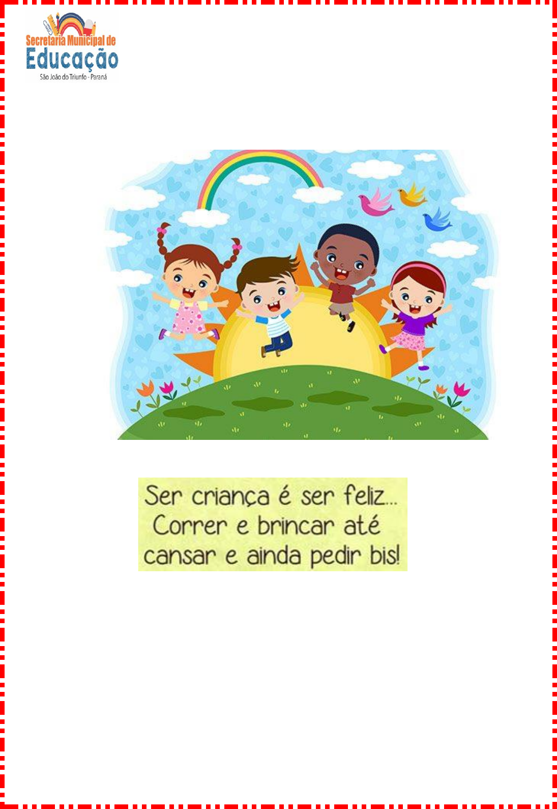 MATERNAL ATIVIDADE DIÁRIA NÃO PRESENCIAL - PARCERIA FAMÍLIA ESCOLA ATIVIDADES NÃO PRESENCIAIS REFERENTES AOS DIAS 12 DE ABRIL A 23 DE ABRIL DE 2021. CENTRO DE EDUCAÇÃO INFANTIL VÓ NAIR. PROFª ROSI MACHADO. TURMA: MATERNAL. NOME:_____________________________________ MATERNAL ATIVIDADE DIÁRIA NÃO PRESENCIAL - PARCERIA FAMÍLIA ESCOLA NOME___________________________DATA:12/04/2021 VAMOS IMITAR? COMO QUE A GALINHA FAZ? COCORICÓ E O PINTINHO? PIU PIU PIU PERFURAR PARA LEVAR A GALINHA PINTADINHA ATÉ SEU FILHOTE. USAR PALITO E PAPELÃO. ¨¨¨¨¨¨¨¨¨¨¨¨¨¨¨¨¨¨¨¨¨¨¨¨¨¨¨¨¨¨¨¨¨¨¨¨¨¨¨¨¨¨¨¨¨¨¨¨¨¨¨¨¨¨¨¨¨¨¨ ¨¨¨¨¨¨¨¨¨¨¨¨¨¨¨¨¨¨¨¨¨¨¨¨¨¨¨¨¨¨¨¨¨¨¨¨¨¨¨¨¨¨¨¨¨¨¨¨¨¨¨¨¨¨¨¨¨¨¨¨ ¨¨¨¨¨¨¨¨¨¨¨¨¨¨¨¨¨¨¨¨¨¨¨¨¨¨¨¨¨¨¨¨¨¨¨¨¨¨¨¨¨¨¨¨¨¨¨¨¨¨¨¨¨¨¨¨¨¨¨¨ MATERNAL ATIVIDADE DIÁRIA NÃO PRESENCIAL - PARCERIA FAMÍLIA ESCOLA NOME___________________________DATA:13/04/2021 : COLAR LÃS COLORIDAS E PALITO NO PIRULITO. MATERNAL ATIVIDADE DIÁRIA NÃO PRESENCIAL - PARCERIA FAMÍLIA ESCOLA NOME___________________________DATA:14/04/2021 # BRINCAR DE BOLA NO CESTO. #VAI PRECISAR DE UM CESTO DE LIXO E FOLHAS DE REVISTA. #AMASSAR AS FOLHAS FORMANDO UMA BOLINHA. #ACERTAR NO CESTO DE EM UMA CERTA DISTÂNCIA. #REGISTRE A BRINCADEIRA COLANDO BOLAS DE PAPEL. MATERNAL ATIVIDADE DIÁRIA NÃO PRESENCIAL - PARCERIA FAMÍLIA ESCOLA NOME___________________________DATA:15/04/2021 LEVAR O PASSÁRO ATÉ SEU NINHO JUNTANDO OS PONTINHOS COM LÁPIS DE COR AZUL. MATERNAL ATIVIDADE DIÁRIA NÃO PRESENCIAL - PARCERIA FAMÍLIA ESCOLA NOME___________________________DATA:16/04/2021 MONTEITO LOBATO NASCIDO EM TAUBATÊ, NO ESTADO DE SÃO PAULO, EM 18 EM ABRIL DE 1882. ELE É O PAI DA TURMINHA QUE VOCÊ VAI CONHECER ALÉM DE OUTROS PERSONAGENS DE HISTÓRIA INFANTIS. ELE CONTRIBUIU PARA DAR UM COLORIDO ESPECIAL À LITERATURA BRASILEIRA. MONTEIRO LOBATO ESCREVEU A HISTÓRIA DO SÍTIO DO PICA-PAU AMARELO. VAMOS ASSISTIR UM EPISÓDIO DO DESENHO, ASSIM VÃO CONHECER OS PERSONAGENS. MATERNAL ATIVIDADE DIÁRIA NÃO PRESENCIAL - PARCERIA FAMÍLIA ESCOLA NOME___________________________DATA:16/04/2021 SACI PERERÊ TEM UMA PERNA SÓ, USA GORRO VERMELHO E PITA UM CACHIMBO DE BARRO. FAZ TRAVESSURAS E VIVE AZUCRINANDO A VIDA DE TODOS DO SÍTIO DO PICA PAU AMARELO. # FAZER A TOUCA DO SACI COM TINTA VERMELHA. MATERNAL ATIVIDADE DIÁRIA NÃO PRESENCIAL - PARCERIA FAMÍLIA ESCOLA NOME___________________________DATA:19/04/2021 ASSISTIR O DESENHO INFANTIL “ O DIA DO ÍNDIO”-TURMA DO FOLCLORE. VAMOS BRINCAR FAMÍLIA? QUEM COMEÇAR DEVERÁ SEGURAR COM UMA MÃO E ARREMESSÁ- LA DEBAIXO PARA CIMA COM A OUTRA MÃO, LANÇANDO AOS OUTROS. O JOGADOR SEGUINTE DEVERÁ ARREMESAR A PETECA PASSANDO PARA O OUTRO SEM DEIXAR CAIR. PETECA BOA DIVERSÃO! MATERNAL ATIVIDADE DIÁRIA NÃO PRESENCIAL - PARCERIA FAMÍLIA ESCOLA NOME___________________________DATA:19/04/2021 COLAR NA OCA CAPIM, FIOS DE Là OU FARINHA DE MANDIOCA. MATERNAL ATIVIDADE DIÁRIA NÃO PRESENCIAL - PARCERIA FAMÍLIA ESCOLA NOME___________________________DATA:20/04/2021 VOCÊ JÁ CONHECE A HISTÓRIA DA CHAPEUZINHO VERMELHO. PARA MONTAR UM CENÁRIO PARA A HISTÓRIA VOCÊ PRECISA DE UMA CAIXA DE PAPELÃO E PEDAÇO DE TECIDO. COLOCAR AS FIGURAS EM PALITOS DE CHURRASCO PARA FACILITAR O MANUSEIO. MATERNAL ATIVIDADE DIÁRIA NÃO PRESENCIAL - PARCERIA FAMÍLIA ESCOLA MATERNAL ATIVIDADE DIÁRIA NÃO PRESENCIAL - PARCERIA FAMÍLIA ESCOLA NOME___________________________DATA:21/04/2021 TIRADENTES QUERIA LIBERTAR O BRASIL DE PORTUGAL. COLAR BOLINHAS DE PAPEL CREPOM VERDE E AMARELO NO MAPA DO NOSSO BRASIL. MATERNAL ATIVIDADE DIÁRIA NÃO PRESENCIAL - PARCERIA FAMÍLIA ESCOLA NOME___________________________DATA:22/04/2021 EM 1.500.HÁ MAIS DE 500 ANOS,PEDRO ÁLVARES CABRAL CHEGOU AO BRASIL COM UMA CARAVELA ENORME. CONFECCIONAR UMA CARAVELA COM UMA CAIXA DE OVOS,TINTA DA COR DA SUA PREFERÊNCIA,PEDAÇO DE CARTOLINA,DOIS PALITO DE CHURRASCO E BRINQUEDOS. MATERNAL ATIVIDADE DIÁRIA NÃO PRESENCIAL - PARCERIA FAMÍLIA ESCOLA NOME___________________________DATA:23/04/2021 FUTEBOL COM BALÃO VOCÊ VAI PRECISAR DE: BEXIGAS, VASSSOURA E LIXEIRA. USE A LIXEIRA PARA FAZER OS GOLS DO JOGO. UM DE CADA LADO DO CAMPO. ENCHA UM BALÃO E COLOQUE DO CAMPO. AS CRIANÇAS EMPURRAM A BEXIGA COM A VASSOURA NA LIXEIRA. VOCÊ PODE DEIXAR UMA CRIANÇA COM UM BALÃO SÓ PARA ELA OU FAZER UM JOGO DE TIMES COM A FAMÍLIA. BRINCAR DE BALÃO É MUITO DIVERTIDO.