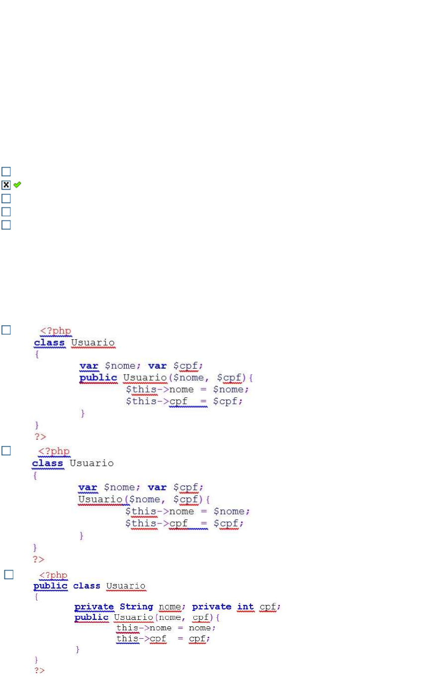 1 - Em relação à arquitetura de sistemas multicamadas, considere as assertivas abaixo. I. A estação cliente faz acesso direto ao servidor de banco de dados. II. Um conjunto de bibliotecas, localizadas no computador cliente, tem a função de viabilizar a comunicação entre ele e o servidor. III. As conexões no banco de dados são realizadas pelo servidor de aplicação. IV. O gargalo de I/O (Input/Output) é evitado, uma vez que é possível ter a mesma regra de negócio dividida entre vários servidores através do balanceamento de carga. Os itens I a IV referem-se, respectivamente, aos modelos de: 3, 3, 2 e 2 camadas. 2, 2, 3 e 3 camadas. 3, 3, 3 e 3 camadas. 2, 3, 2 e 3 camadas. 2, 2, 2 e 2 camadas. 2 - A implementação correta de uma classe chamada Usuário em PHP é (FADESP - 2017 - COSANPA - Analista de Sistema) 3 - Sobre as páginas dinâmicas, assinale a afirmativa incorreta: Para criação de uma página dinâmica são necessários apenas código HTML e um banco de dados. O acesso a um banco de dados para recuperação de dados e exibição no navegador precisa ser feito através de uma linguagem server side. Linguagens como Java ou PHP são necessárias para se criarem páginas dinâmicas. Uma das principais características das páginas dinâmicas é a utilização de um sistema gerenciador de conteúdo ou sistema de gestão de conteúdo ¿ conhecidos como CMS. Uma página dinâmica pode ser criada com a combinação de códigos HTML, CSS, Javascript e PHP. 4 - A < > é considerada a tag raiz de um documento HTML. Estamos falando de: < body > < html > < head > < header > < !DoctType html > 5 - Para aplicar um estilo CSS a um elemento específico, é necessário identificá-lo e apontar qual de suas propriedades queremos alterar e qual valor queremos atribuir-lhe. Qual sentença abaixo está incorreta? O seletor de classe é definido a partir da declaração do atributo class em um elemento HTML. Já o de identificação é definido com o atributo id. Uma declaração deve ser separada da declaração subsequente com a utilização do ponto-e-vírgula ";". A propriedade e seu valor devem ser separados por dois pontos. O conjunto de estilos aplicados a um seletor é delimitado por "{" para iniciar e "}" para fechar. CSS online implica em declarar o estilo CSS diretamente na tag, no código HTML. 6 - Segundo Flanagan (2011), JavaScript é a linguagem de programação da Web mais utilizada pelos sites. Além disso, todos os navegadores − estejam eles em desktops, jogos, consoles, tablets ou smartphones − incluem interpretadores JavaScript, fazendo desta a linguagem de programação mais onipresente da história. A incorporação do JavaScript a páginas HTML pode ser feita de quais formas: Códigos no corpo da página e Arquivos externos. Apenas no corpo de uma página em HTML. Arquivos externos, internos e inline. Somente arquivos externos. De forma inline e interno. 7 - Analise as proposições abaixo sobre formas de inserir comentários no código JavaScript e, em seguida, assinale a única alternativa correta: Para os comentários de apenas uma linha, utilizam-se as duas barras "//" Para os comentários de múltiplas linhas, utiliza-se "/*" (barra asterisco) para iniciar e "*/" (asterisco barra) para fechar . Para comentários em uma linha depois de um comando, utilizam-se "#" Se somente a afirmativa I estiver correta. Se somente a afirmativa III estiver correta. Todas as afirmativas estão corretas Se somente as afirmativas I e II estiverem corretas. Se somente a afirmativa II estiver correta. 8 - Qual alternativa abaixo define o que é contido em uma distribuição XAMPP? (COVEST- COPSET - 2019 - UFPE - Analista de Tecnologia da Informação - Sistemas) É uma distribuição de servidor disponível para várias plataformas que traz um servidor web Apache, uma base de dados MariaDB e os interpretadores para linguagem PHP. É uma distribuição de servidor Linux, que traz um servidor web Apache, uma base de dados MySQL e os interpretadores para linguagens Python e Perl. É uma distribuição de servidor disponível para várias plataformas que traz um servidor web Apache, uma base de dados MongoDB e os interpretadores para linguagens Python e PHP. É uma distribuição de servidor Linux, que traz um servidor web Apache, uma base de dados MongoDB e os interpretadores para linguagens PHP e Perl. É uma distribuição de servidor Unix, que traz um servidor web Apache, uma base de dados MariaDB e os interpretadores para linguagens Python e Perl. 9 - Qual é a forma correta de conectar o PHP a um banco de dados MySQL? (FUNDEP (Gestão de Concursos) - 2017 - CRM - MG - Analista de Sistema) $conecta = mysql_connect("HOST", "LOGIN", "SENHA") or print (error()); $conecta = new MySQL("HOST", "LOGIN", "SENHA") or die (Mysql->error()); $conecta = connect("HOST", "LOGIN", "SENHA") or print (error()); $conecta = mysql("HOST", "LOGIN", "SENHA") or print (mysql_error()); $conecta = mysql_connect("HOST", "LOGIN", "SENHA") or print (mysql_error()); 10 - Considere o fragmento de código PHP abaixo. (FCC - 2018 - DPE - AM - Assistente Técnico de Defensoria - Programador) A variável "$count" receberá o valor "false", caso o produto de nome caneta não esteja cadastrado. o número 1 se o registro foi excluído ou 0 se ocorrer algum erro na exclusão, mesmo que tenha mais de um produto de nome caneta. o número de linhas excluídas da tabela pelo comando DELETE. o valor "true", caso o produto seja excluído com sucesso. uma cópia do registro a ser excluído, para exibição e confirmação da ação pelo usuário.