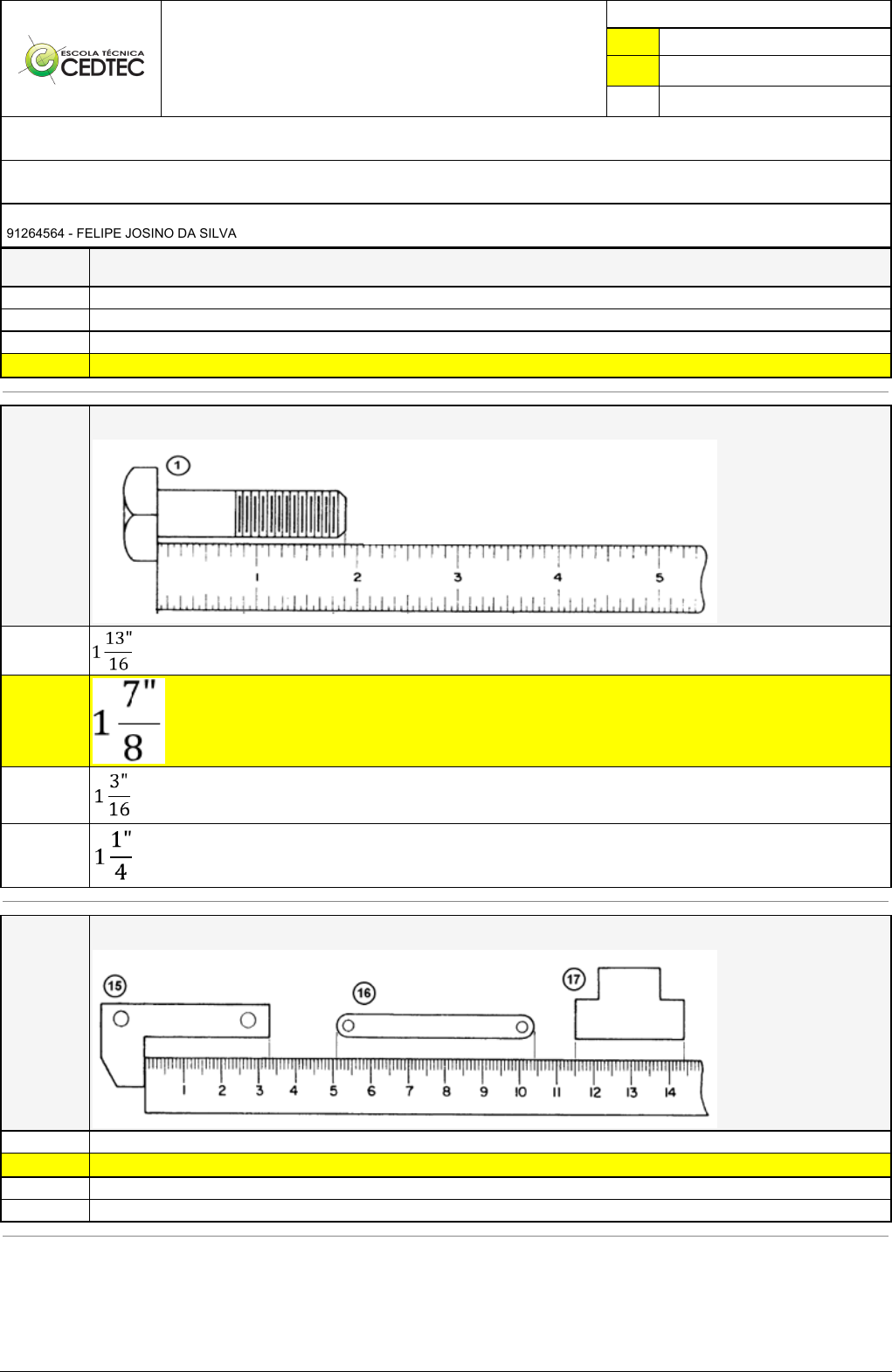Pincel Atômico - 31/01/2022 09:41:38 1/2 Exercício Caminho do Conhecimento - Etapa 4 (15343) Atividade finalizada em 22/11/2021 19:14:23 (tentativa: 1) LEGENDA Resposta correta na questão # Resposta correta - Questão Anulada X Resposta selecionada pelo Aluno Disciplina: METROLOGIA [capítulos - 102] - Avaliação com 4 questões, com o peso total de 6,50 pontos Turma: Curso Técnico: Mecânica - Grupo: EAD - NOVEMBRO/21 - EAD MEC [62080] Aluno(a): 91264564 - FELIPE JOSINO DA SILVA - Respondeu 4 questões corretas, obtendo um total de 6,50 pontos como nota Questão 001 As réguas de profundidade são utilizadas para: Apenas material ferroso. Peças cilindricas. Faces irregulares. X Medição de rasgos e furos. Questão 002 Dada a figura baixo, qual é a medida do objeto 1 em polegadas ? X Questão 003 Dada a figura abaixo, quais são as medidas dos objetos 15, 16 e 17 em centímetros? 3,4; 10,4; 14,4 X 3,3; 5,3; 2,9 3,2; 10,4; 14,5 3,5; 5,3; 2,8 Pincel Atômico - 31/01/2022 09:41:38 2/2 Questão 004 Qual tipo de régua deve ser aplicada na medição da figura abaixo: Régua de encosto externo. Régua universal. X Régua de encosto interno. Régua de profundidade.