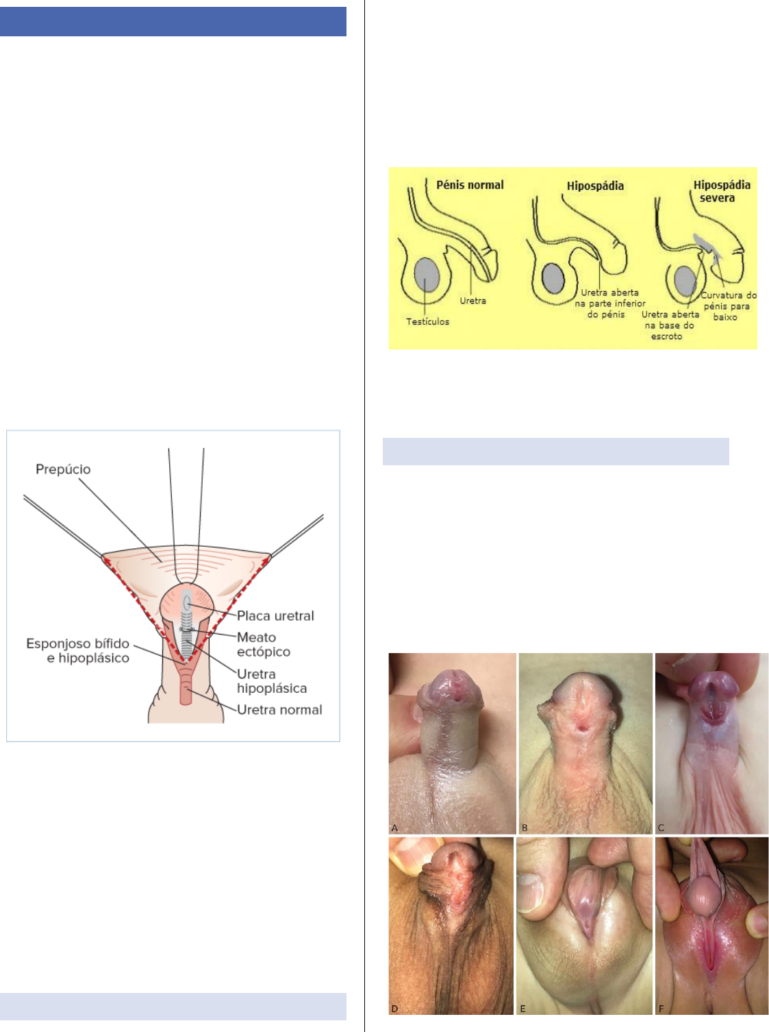 HIPOSPADIA HIPOSPADIA É a segunda malformação genital mais comum, resultante da não fusão ventral do tubérculo genital do pênis do feto. Consequentemente, ocorre desenvolvimento incompleto de porção distal da uretra, do corpo esponjoso, do prepúcio e, nos defeitos graves, até do corpo cavernoso e do escroto, resultando em vários defeitos genitais, tais como: ▪ Posicionamento mais proximal do meato uretral, na porção anterior do corpo do pênis. ▪ Glande aberta, bífida. ▪ Uretra distal aberta, como uma placa. ▪ Não fechamento do corpo esponjoso em sua porção distal, que fica bífido e hipoplásico. ▪ Não fechamento ventral do prepúcio, que fica aberto como um capuz. ▪ Déficit de pele na porção ventral do pênis. ▪ Encurvamento ventral do pênis. ▪ Alterações no escroto. ▪ Pode haver rotação lateral do pênis. Sua etiofisopatogenia estaria relacionada à alteração do metabolismo dos andrógenos do feto, que poderia ser secundário a fatores genéticos e ambientais, como exposição da mãe a disruptores endócrinos e uso de estrógenos pela mãe, durante a gravidez. Também ocorre com maior frequência em prematuros e em fetos com mães com insuficiência placentária. Existem ainda associações com hérnia inguinal, criptorquia, desordens do desenvolvimento sexual (DDS) e outras uropatias. DIAGNOSTICO ▪ Casos graves: pode suspeitar no pré-natal através da USG obstétrica ▪ RN: exame físico através da avaliação da genitália o Identificação da posição anômala do meato uretral, deve-se verificar a presença dos testículos, o tamanho do pênis, a presença e o grau de encurvamento peniano e a morfologia do escroto. Quanto mais proximal a posição do meato uretral, mais acentuado é o encurvamento peniano, pior a qualidade da placa uretral e do corpo esponjoso CLASSIFICAÇÃO A mais utilizada é a que se considera a posição do meato uretral: ▪ Glandar (na glande) ▪ Peniana distal ▪ Peniana média ▪ Peniana proximal ▪ Escrotal ▪ Perineal HIPOSPADIA Outra forma de classificar é de forma proximal ou distal, levando em consideração o grau de encurvamento peniano e à presença ou não de placa uretral rudimentar (avaliando a necessidade de substituir a uretra). ▪ Proximal – Quando o encurvamento peniano é acentuado (mais de 50º), e todos os casos em que o meato estiver em posição peniana proximal, escrotal ou perineal. ▪ Distal - meato em posição peniana distal e com encurvamento peniano ventral leve (30º a 40º) Exemplo: meato em posição peniana distal, porém associado a encurvamento peniano acentuado, com mais de 50º - caso proximal APRESENTAÇÃO ESPECIAL Um tipo menos comum de apresentação é a hipospádia peniana distal, porém com prepúcio normal (fechado) e sem encurvamento peniano. Nessa situação, o diagnóstico costuma ser mais tardio, feito apenas após a liberação das aderências balanoprepuciais, haja vista que a criança não costuma apresentar alteração do jato urinário. Outro tipo de hipospadia é a forma frustra: encurvamento peniano, alteração do prepúcio ou do esponjoso, isoladas ou associadas, porém com meato uretral em posição tópica na glande Outro tipo de hipospádia a considerar seriam os casos reoperados várias vezes, em que há muita fibrose cicatricial (seta) na região anterior do pênis, e ausência de prepúcio dorsal → hipospadia cripple DIAGNOSTICO DIFERENCIAL Os principais diagnósticos diferenciais são com os diversos tipos de distúrbios da diferenciação sexual (DDS). Deve-se aventar a possibilidade de DDS quando: ▪ Em um caso de hipospádia, mesmo que distal, em que não se palpa uma ou as duas gônadas. ▪ Nos casos de hipospádia escrotal ou perineal, mesmo com as gônadas palpáveis. ▪ Casos com falus pequeno, associado ou não a anomalias escrotais, e independentemente da presença das gônadas TRATAMENTO É sempre feito de forma cirúrgica → Os únicos casos em que o tratamento cirúrgico não seria requisitado são nas hipospadias glandulares, sem encurvamento peniano e com jato urinário adequado, a não ser que o paciente queira fazer por motivos estéticos. A idade da correção é motivo de controvérsia. A maioria dos autores recomenda a intervenção entre os 6-12 meses de vida. Caso haja necessidade de reintervenção, deve ser feita após 6 meses. → Há recomendação de que não se realize qualquer tipo de intervenção na genitália na fase genital freudiana, que vai dos 18 meses até os 4 anos de vida, isso para minimizar possíveis sequelas psicológicas. Existem mais de 300 técnicas cirúrgicas, sendo que o objetivo final da cirurgia é: reconstruir a uretra, com o meato tópico em forma de fenda, glande cônica e sem encurvamento peniano. Para isso, divide-se a correção em vários tempos operatórios: ▪ Correção do encurvamento peniano. ▪ Uretroplastia ▪ Esponjosoplastia ▪ Cobertura da sutura da uretroplastia, com retalho de tecidos adjacentes ou a distância ▪ Glanduloplastia. ▪ Prepucioplastia. ▪ Escrotoplastia. HIPOSPADIA CORREÇÃO DO ENCURVAMENTO PENIANO ▪ Casos leves (< 30º) Usualmente, apenas é necessário a liberação da pele do pênis e a secção de aderências no corpo cavernoso ▪ Encurvamentos moderados (até 30º a 50º) Dorsoplicaturas → podem ser realizadas na linha média e única ou bilateral (às 10 e às 14 horas) Linha média ▪ Acentuados (mais de 50º) Pode-se necessitar seccionar a placa uretral (serve como parede uretral dorsal e um retalho vascular onlay do tecido do prepúcio interno cria a uretra ventral), além de realizar dorsoplicatura → Entretanto, se a placa uretral for de boa qualidade e não contribuir para o encurvamento, pode-se manter a placa uretral e realizar também dorsoplicaturas no pênis. Uma alternativa à dorsoplicatura nesses casos seriam técnicas de alongamento ventral do pênis, como realizar secções ventrais transversais na fáscia