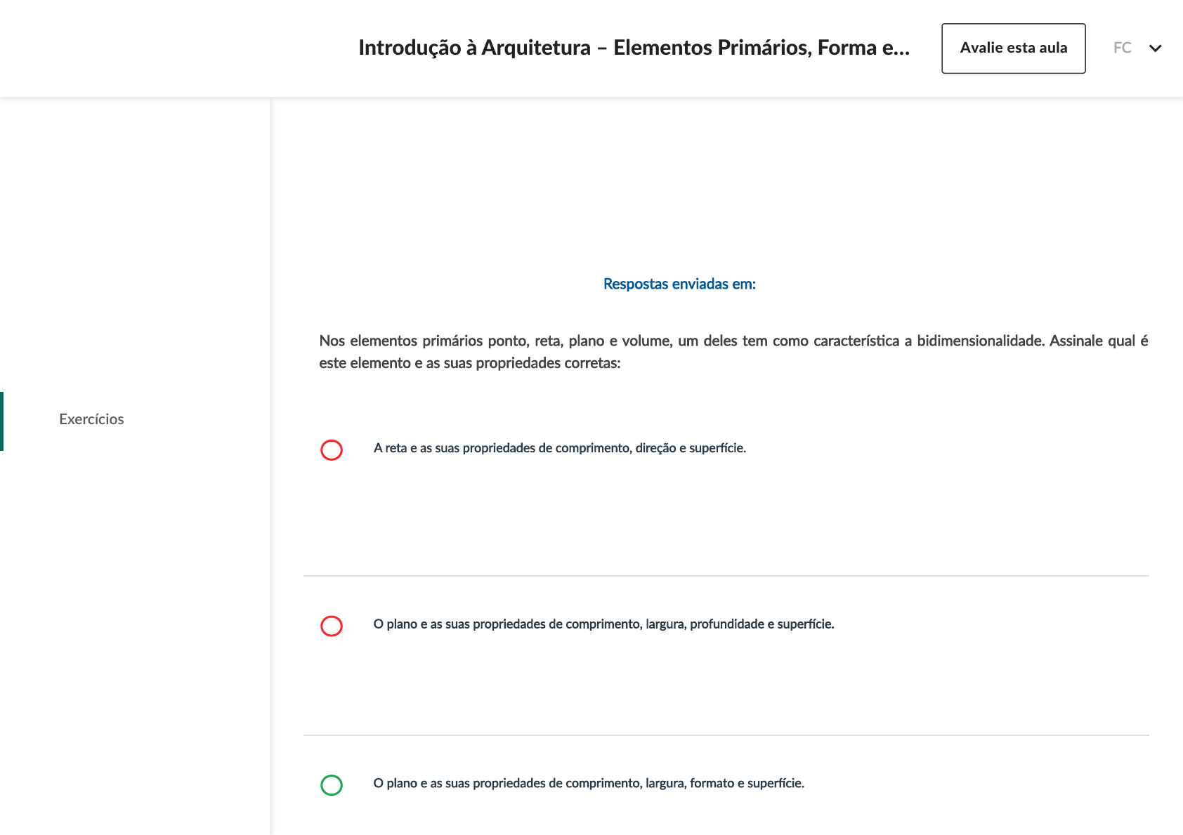Exercícios Respostas enviadas em: 03/02/2022 12:26 1. Nos elementos primários ponto, reta, plano e volume, um deles tem como caracterís�ca a bidimensionalidade. Assinale qual é este elemento e as suas propriedades corretas: Você não acertou! A. A reta e as suas propriedades de comprimento, direção e super�cie. A reta é um elemento unidimensional e a super�cie não é uma propriedade da reta. Resposta incorreta. B. O plano e as suas propriedades de comprimento, largura, profundidade e super�cie. O plano é bidimensional, porém a profundidade não é uma propriedade dos planos. Resposta correta. C. O plano e as suas propriedades de comprimento, largura, formato e super�cie. Anterior Dica do Professor Próximo Na prá�ca Apresentação Desafio Infográfico Conteúdo do Livro Dica do Professor Exercícios Na prá�ca Saiba mais Introdução à Arquitetura – Elementos Primários, Forma e… Avalie esta aula FC O comprimento, a largura e o formato são propriedades dos planos. Resposta incorreta. D. O volume e as suas propriedades de comprimento, largura, profundidade, forma e super�cie. As propriedades estão corretas, porém o volume é um elemento tridimensional. Resposta incorreta. E. O volume e as suas propriedades de comprimento, largura, profundidade, formato e super�cie. O formato não é propriedade do volume, além de ele ser tridimensional. 1 de 5 perguntas Próximo Anterior Dica do Professor Próximo Na prá�ca Apresentação Desafio Infográfico Conteúdo do Livro Dica do Professor Exercícios Na prá�ca Saiba mais Introdução à Arquitetura – Elementos Primários, Forma e… Avalie esta aula FC