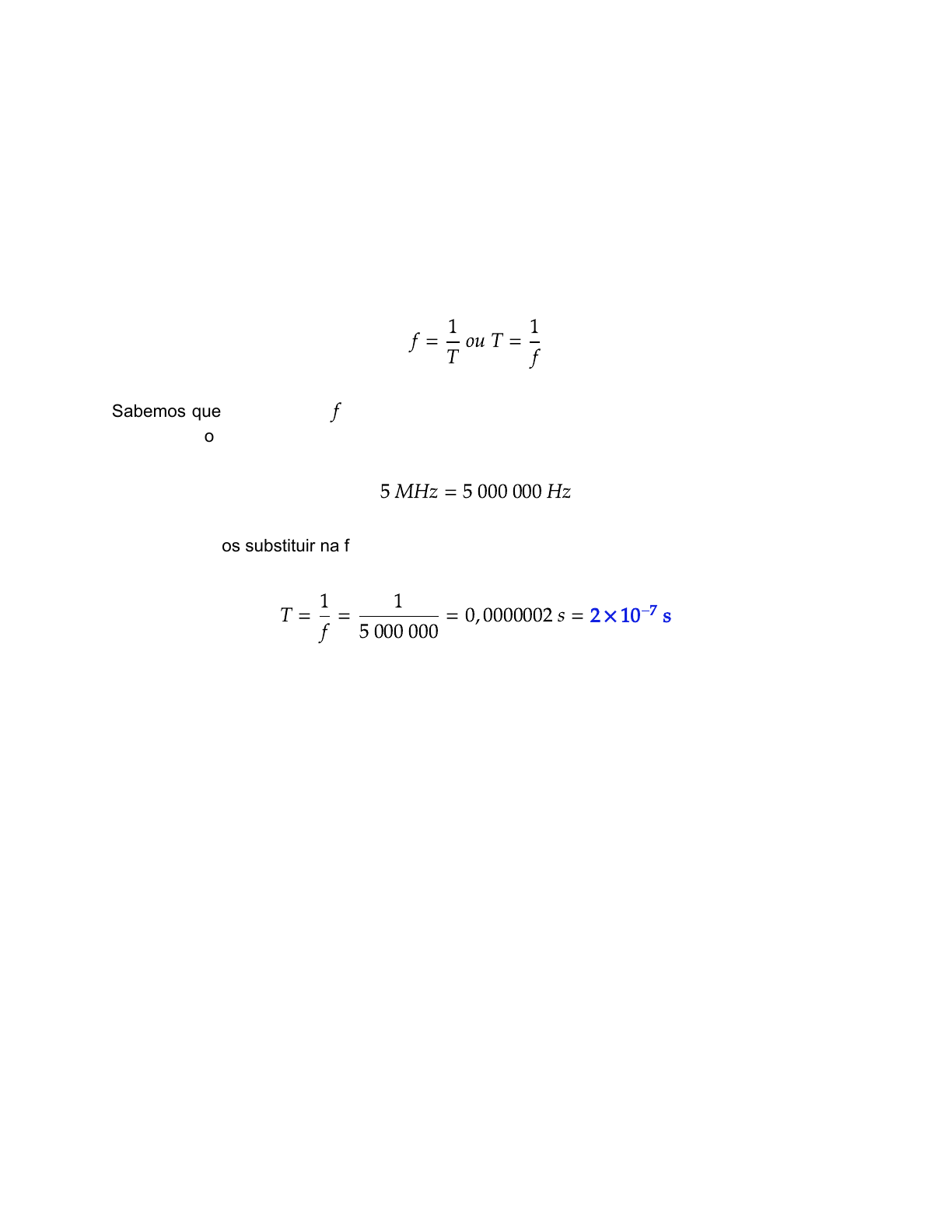 Tiago Lima - Instagram: @professor_disciplinas_exatas • Um alto falante oscila com frequência de 5 MHz. O seu período de oscilação será? Resolução: A relação entre período e freqência é dada por; f = ou T = 1 T 1 f Sabemos que a frequência é 5 MHz, essa frequência de oscilação deve ser transformada f para Hz, isso é multiplicando o valor em MHz por 1000 000; 5 MHz = 5 000 000 Hz Agora, podemos substituir na fórmula e achar o período de oscilação do alto falante: T = = = 0, 0000002 s = 2× 10 s 1 f 1 5 000 000 -7