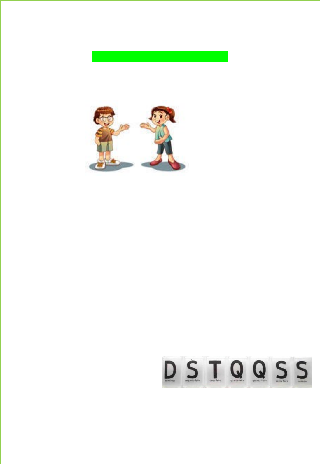 ESCOLA MUNICIPAL OLAVO BILAC ALUNO(A): ______________________________________________________ 7º ANO PROFESSORA: JOYCE DATA: 29/03/2021 DISCIPLINA: INGLÊS AVALIAÇÃO DO 1º BIMESTRE Leia o diálogo entre Maria e Júlio: Mary: Hi ! Julius : Hi ! Maria : How are you? Julius : I am fine ! Julius : And you ? Maria : Too! Julius : See you later ! Maria : See you ! Julius : Bye ! Maria : Bye ! 1ª) O texto acima é (A) poetry (B) fable. (C) phone call (D) greetings. 2ª) Releia o texto e traduza as seguintes frases (PESO 02): a) “How are you!” _______________________________________________________________________________________ b) “See you later!” ________________________________________________________________________________________ c) “Bye!” _________________________________________________________________________________ d) “Hi!” _________________________________________________________________________________ 3ª) Associe corretamente os dias da semana em inglês: (A) Domingo ( ) Saturday (B) Segunda-feira ( ) Thursday (C) Terça-feira ( ) Wednesday (D) Quarta-feira ( ) Monday (E) Quinta-feira ( ) Sunday (F) Sexta-feira ( ) Tuesday (G) Sábado ( ) Friday 4ª) Associe: (A) Bom dia ( ) good evening (B) Boa tarde ( ) Good Morning (C) Boa noite (Chegada) ( ) Good night (D) Boa noite (Despedida) ( ) good afternoon 5ª) Complete com os nomes dos numerais em inglês que estão faltando: 01 02 03 04 05 06 07 08 09 10 two four eight Observe e leia o texto abaixo. 6ª) O texto é característico do Gênero Textual (A) “Cartaz”. (B) “Cardápio”. (C) “Panfleto”. (D) “Pôster”. Veja a cena. 7ª) O que está acontecendo? ________________________________________________________________________________________________ 8ª) O último número chamado pelo marcador foi (A) 12. (B) 23. (C) 44. (D) 72. 9ª) Associe os meses do ano: (1) Janeiro ( ) February (2) Fevereiro ( ) June (3)Março ( ) May (4) Abril ( )July (5) Maio ( ) December (6) Junho ( ) October (7) Julho ( ) January (8) Agosto ( ) March (9) Setembro ( ) August (10) Outubro ( ) September (11) Novembro ( ) April (12) Dezembro ( ) November