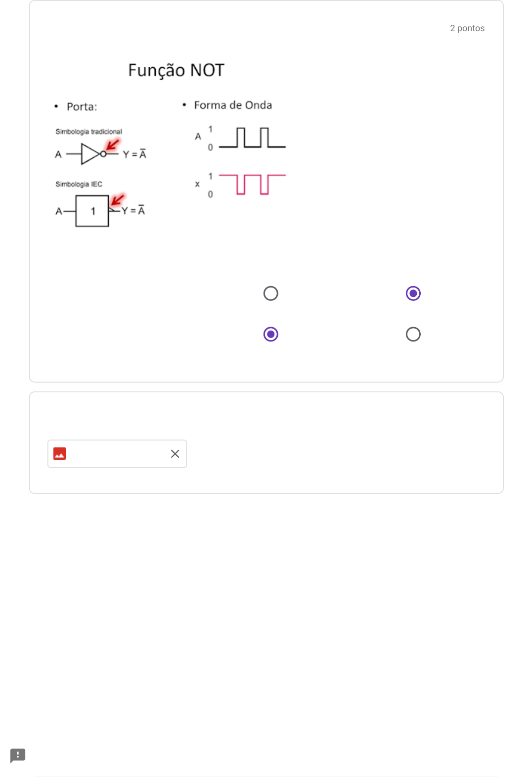 2 pontos Função lógica N… 1) Função lógica NOT - CI7404 * 0 1 A = 0 A = 1 A = 0 A = 1 Enviar uma foto com o circuito implementado no Tinkercad. * 4 pontos Função lógica A… 2) Função lógica AND - 7408 * 0 1 A = 0, B = 0 A = 0, B = 1 A = 1, B = 0 A = 1, B = 1 A = 0, B = 0 A = 0, B = 1 A = 1, B = 0 A = 1, B = 1 Enviar uma foto com o circuito implementado no Tinkercad. * 4 pontos Função lógica O… 3) Função lógica OR - CI7432 * 0 1 A = 0, B = 0 A = 0, B = 1 A = 1, B = 0 A = 1, B = 1 A = 0, B = 0 A = 0, B = 1 A = 1, B = 0 A = 1, B = 1 Enviar uma foto com o circuito implementado no Tinkercad. * 4 pontos Função lógica N… 4) Função lógica NAND - CI7400 * 0 1 A = 0, B = 0 A = 0, B = 1 A = 1, B = 0 A = 1, B = 1 A = 0, B = 0 A = 0, B = 1 A = 1, B = 0 A = 1, B = 1 Enviar uma foto com o circuito implementado no Tinkercad. * 4 pontos Função lógica N… 5) Função lógica NOR - CI7402 * 0 1 A = 0, B = 0 A = 0, B = 1 A = 1, B = 0 A = 1, B = 1 A = 0, B = 0 A = 0, B = 1 A = 1, B = 0 A = 1, B = 1 Enviar uma foto com o circuito implementado no Tinkercad. * 4 pontos Função lógica X… 6) Função lógica XOR - CI7486 * 0 1 A = 0, B = 0 A = 0, B = 1 A = 1, B = 0 A = 1, B = 1 A = 0, B = 0 A = 0, B = 1 A = 1, B = 0 A = 1, B = 1 Enviar uma foto com o circuito implementado no Tinkercad. * 4 pontos Função lógica N… Nunca envie senhas pelo Formulários Google. Este conteúdo não foi criado nem aprovado pelo Google. Denunciar abuso - Termos de Serviço - Política de Privacidade 7) Implemente a função abaixo usando apenas portas AND (CI7408), OR (CI7432) e NOT (CI7404). * 0 1 A = 0, B = 0 A = 0, B = 1 A = 1, B = 0 A = 1, B = 1 A = 0, B = 0 A = 0, B = 1 A = 1, B = 0 A = 1, B = 1 Enviar uma foto com o circuito implementado no Tinkercad. * Enviar Limpar formulário Formulários https://docs.google.com/forms/u/0/d/e/1FAIpQLSdipXH4JKQbPJZnn3b7HmP1NyNIqLV9haxjtHWpcaaY8lOXTw/reportabuse?source=https://docs.google.com/forms/d/e/1FAIpQLSdipXH4JKQbPJZnn3b7HmP1NyNIqLV9haxjtHWpcaaY8lOXTw/viewform?hr_submission%3DChgI9KmBkhkSEAjKgp28uw0SBwizgp28uw0QAA https://policies.google.com/terms https://policies.google.com/privacy https://www.google.com/forms/about/?utm_source=product&utm_medium=forms_logo&utm_campaign=forms