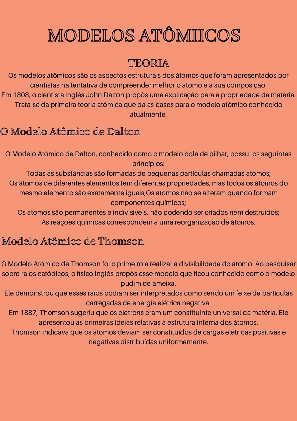 MODELOS ATÔMIICOS Os modelos atômicos são os aspectos estruturais dos átomos que foram apresentados por cientistas na tentativa de compreender melhor o átomo e a sua composição. Em 1808, o cientista inglês John Dalton propôs uma explicação para a propriedade da matéria. Trata-se da primeira teoria atômica que dá as bases para o modelo atômico conhecido atualmente. TEORIA O Modelo Atômico de Dalton O Modelo Atômico de Dalton, conhecido como o modelo bola de bilhar, possui os seguintes princípios: Todas as substâncias são formadas de pequenas partículas chamadas átomos; Os átomos de diferentes elementos têm diferentes propriedades, mas todos os átomos do mesmo elemento são exatamente iguais;Os átomos não se alteram quando formam componentes químicos; Os átomos são permanentes e indivisíveis, não podendo ser criados nem destruídos; As reações químicas correspondem a uma reorganização de átomos. Modelo Atômico de Thomson O Modelo Atômico de Thomson foi o primeiro a realizar a divisibilidade do átomo. Ao pesquisar sobre raios catódicos, o físico inglês propôs esse modelo que ficou conhecido como o modelo pudim de ameixa. Ele demonstrou que esses raios podiam ser interpretados como sendo um feixe de partículas carregadas de energia elétrica negativa. Em 1887, Thomson sugeriu que os elétrons eram um constituinte universal da matéria. Ele apresentou as primeiras ideias relativas à estrutura interna dos átomos. Thomson indicava que os átomos deviam ser constituídos de cargas elétricas positivas e negativas distribuídas uniformemente. Modelo de Rutherford – Bohr O modelo apresentado por Rutherford foi aperfeiçoado por Bohr. Por esse motivo, o aspecto da estrutura atômica de Bohr também é chamada de Modelo Atômico de Bohr ou Modelo Atômico de Rutherford-Bohr. A teoria do físico dinamarquês Niels Bohr estabeleceu as seguintes concepções atômicas: Os elétrons que giram ao redor do núcleo não giram ao acaso, mas descrevem órbitas determinadas.O átomo é incrivelmente pequeno, mesmo assim a maior parte do átomo é espaço vazio. O diâmetro do núcleo atômico é cerca de cem mil vezes menor que o átomo todo. Os elétrons giram tão depressa que parecem tomar todo o espaço. Quando a eletricidade passa através do átomo, o elétron pula para a órbita maior e seguinte, voltando depois à sua órbita usual. Quando os elétrons saltam de uma órbita para a outra resulta luz. Bohr conseguiu prever os comprimentos de onda a partir da constituição do átomo e do salto dos elétrons de uma órbita para a outra.