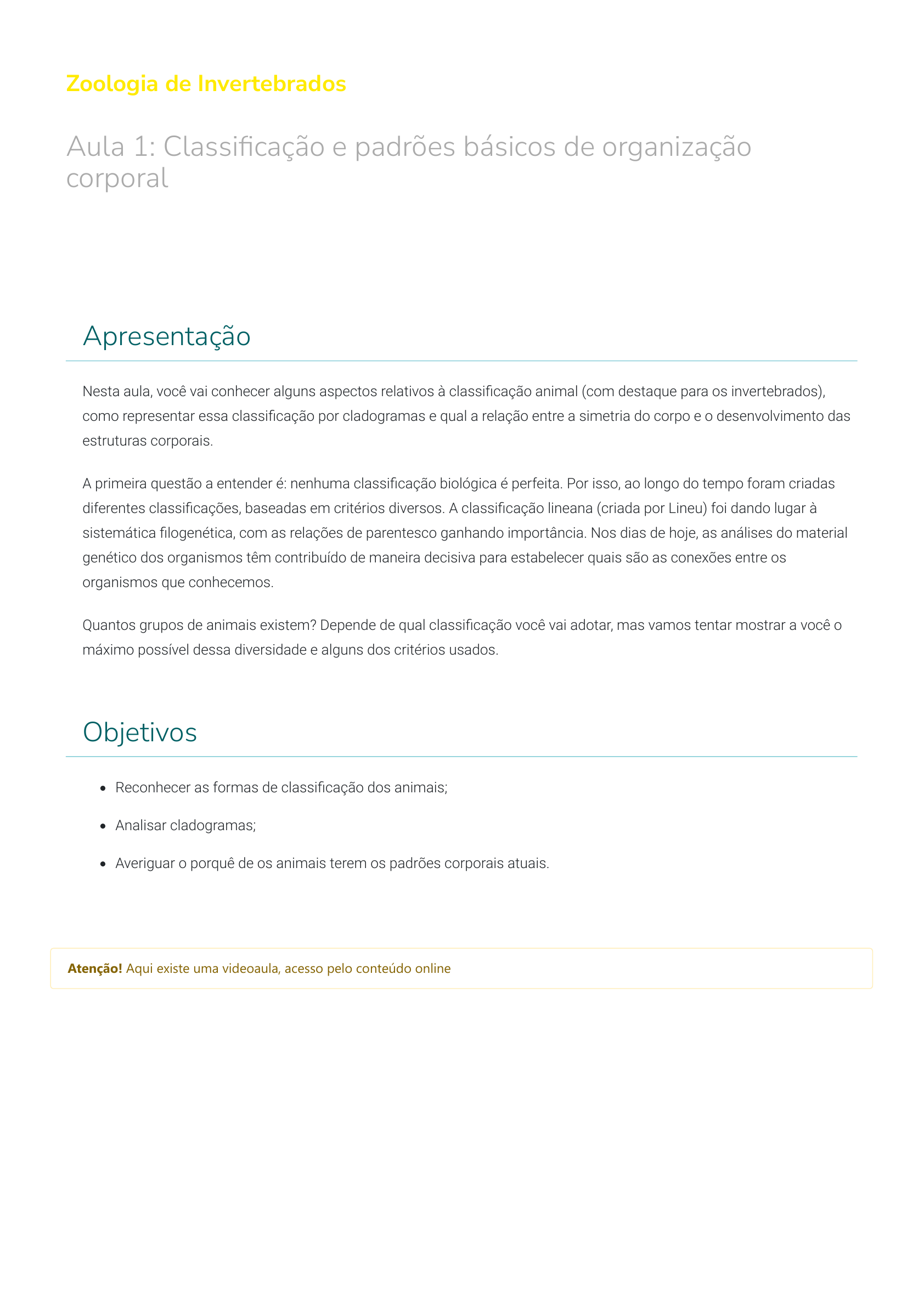 Zoologia de Invertebrados Aula 1: Classi�cação e padrões básicos de organização corporal Apresentação Nesta aula, você vai conhecer alguns aspectos relativos à classi�cação animal (com destaque para os invertebrados), como representar essa classi�cação por cladogramas e qual a relação entre a simetria do corpo e o desenvolvimento das estruturas corporais. A primeira questão a entender é: nenhuma classi�cação biológica é perfeita. Por isso, ao longo do tempo foram criadas diferentes classi�cações, baseadas em critérios diversos. A classi�cação lineana (criada por Lineu) foi dando lugar à sistemática �logenética, com as relações de parentesco ganhando importância. Nos dias de hoje, as análises do material genético dos organismos têm contribuído de maneira decisiva para estabelecer quais são as conexões entre os organismos que conhecemos. Quantos grupos de animais existem? Depende de qual classi�cação você vai adotar, mas vamos tentar mostrar a você o máximo possível dessa diversidade e alguns dos critérios usados. Objetivos Reconhecer as formas de classi�cação dos animais; Analisar cladogramas; Averiguar o porquê de os animais terem os padrões corporais atuais. Atenção! Aqui existe uma videoaula, acesso pelo conteúdo online Características embrionárias O desenvolvimento dos embriões de animais pode ocorrer de três maneiras. Em todas, após a fecundação (união dos gametas masculino e feminino) vai se formar um agregado de células chamado de mórula, que absorve líquidos e gera um espaço interno, transformando-se em uma blástula, que tem apenas uma camada de células. Esta é a característica distintiva dos animais (uma apomor�a), pois os embriões dos outros organismos não formam blástulas. As blástulas sofrem uma invaginação, transformando-se em uma estrutura com duas camadas de células (os dois primeiros folhetos germinativos ou embrionários - ectoderma e endoderma), uma abertura (o blastóporo) e uma cavidade (o arquêntero). Nas esponjas (�lo Porifera), os embriões desenvolvem-se a partir de uma blástula que não vai gerar uma gástrula e, consequentemente, não formará os folhetos germinativos. Os cnidários (�lo Cnidaria) têm uma gástrula com dois folhetos germinativos e, por isso, são chamados de animais diblásticos (ou diploblásticos). A partir dos ctenóforos (�lo Ctenophora), todos os animais têm embriões com três folhetos (ectoderma, mesoderma e endoderma), sendo chamados de animais triblásticos (ou triploblásticos). Gástrula tridérmica Uma gástrula tridérmica (com ectoderma, mesoderma e endoderma) pode se desenvolver de três maneiras. Na primeira, típica dos platelmintos (�lo Platyhelminthes), os embriões não deixam espaços entre os três folhetos ao longo do seu desenvolvimento, gerando animais com o corpo maciço, cuja única cavidade corporal é a do sistema digestório. Tais animais são classi�cados como acelomados (sem celoma ou cavidade geral do corpo). Na segunda, encontrada nos nematódeos (�lo Nematoda) e outros asquelmintos, existe um espaço entre o mesoderma e o endoderma, chamado de pseudoceloma (falso celoma). Tais animais são classi�cados como pseudocelomados. Na terceira maneira, a gástrula forma um embrião com um espaço (o celoma verdadeiro) limitado apenas pelo mesoderma. Esta é a gástrula dos demais �los animais, chamados de celomados. A formação do mesoderma e do celoma pode ocorrer a partir do blastóporo (celoma esquizocélico, do grego schizos, dividido) ou a partir de bolsas que surgem na endoderme a partir do arquêntero (celoma enterocélico, do grego enteron, intestino). Moluscos (�lo Mollusca), anelídeos (�lo Annelida) e artrópodos (�lo Arthropoda) são esquizocelomados, enquanto os equinodermos (Echinodermata) e cordados (Chordata) são enterocelomados. O blastóporo é um orifício de comunicação do sistema digestório com o meio externo. Ele pode dar origem à boca (protostomia, do grego protos, primeiro, primitivo, e stoma, boca) ou ao ânus (deuterostomia, do grego deuteros, segundo). Moluscos, anelídeos e artrópodes são protostomados, enquanto equinodermos e cordados são deuterostomados. Atenção! Aqui existe uma videoaula, acesso pelo conteúdo online Simetria corporal Clique nos botões para ver as informações. Nessa categoria, enquadram-se os poríferos. Sua organização corporal, na maior parte dos casos, não mostra qualquer padrão de simetria, especialmente nas chamadas esponjas incrustantes. Assimétricos Nessa categoria, estão os cnidários e ctenóforos. Neles, apenas cortes longitudinais como os raios de uma circunferência poderão gerar partes do corpo simétricas. Simetria radial Nessa categoria, se enquadram os demais grupos de animais, nos quais um eixo corporal longitudinal gera as metades direita e esquerda do corpo. Simetria bilateral Em equinodermos ocorre algo curioso: a simetria bilateral está presente apenas nas larvas, com os adultos tendo a chamada simetria radial secundária. Mas o que a simetria corporal in�uencia na estrutura e desenvolvimento do organismo? Nos animais de simetria bilateral, encontramos uma cabeça, que acumula estruturas sensoriais, como olhos, nariz e ouvidos. Isso não existe nos animais assimétricos ou de simetria radial. Além disso, vemos o desenvolvimento gradual do encéfalo, gerando cérebros cada vez mais complexos à medida que os grupos foram surgindo. Ou seja, a simetria bilateral está associada ao processo de cefalização. Organização corporal As animais apresentam quatro níveis de organização: celular, celular-tissular, tissular-orgânico e orgânico-sistêmico. Clique nos botões para ver as informações. A organização celular é encontrada nos poríferos, que são, basicamente, agregados de células funcionalmente diferenciadas. Elas apresentam divisão de funções, com algumas trabalhando, por exemplo, com a alime