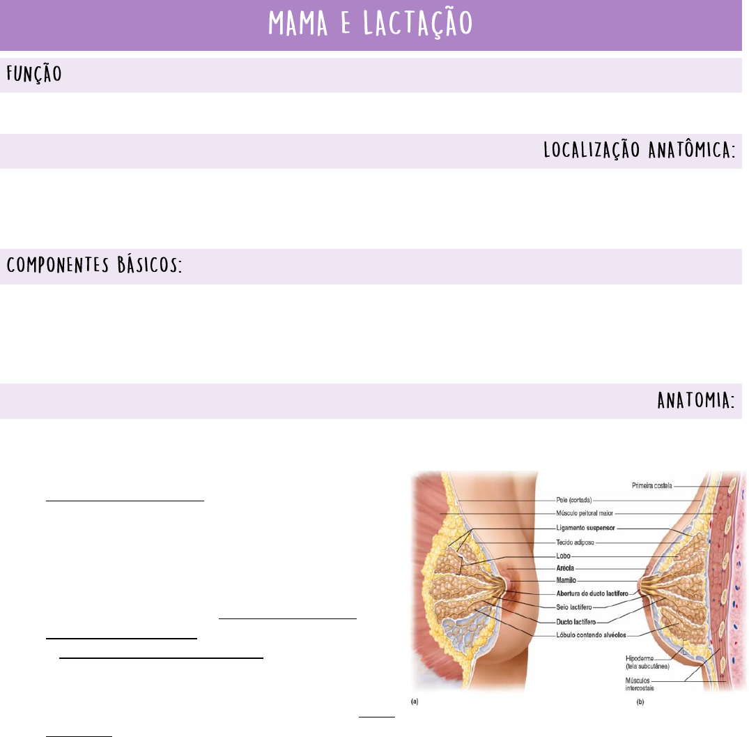 Catharina Moura e Isis Agra, 1º semestre – Medicina | UNIDOM. Produzir leite para o RN. • Situam-se entre as 2ª, 6ª e 7ª costelas, no eixo vertical e entre a borda do esterno e a linha axilar média no eixo horizontal. • Músculos peitoral maior e menor, serrátil anterior e espaço retromamário. • Lobos: glândulas produtoras de leite; • Ductos: pequenos tubos que transportam o leite dos lobos aos mamilos; • Estroma: tecido adiposo + tecido conjuntivo que envolve os ductos e lobos, vasos sanguíneos e linfáticos. INTERNA: ▪ Alvéolos: unidade funcional, onde se encontra as céls produtoras de leite; ▪ Lóbulos: conjunto de vários alvéolos; ▪ Lobos: conjunto de vários lóbulos; 15 a 20 lobos secretores por mama, por ligamentos suspensores; ▪ Ductos: vasos que conectam os alvéolos de um lóbulo até a ampola; ▪ Ampola ou seio lactífero: reservatório de leite; ▪ Ligamento de Cooper: tecido fibroso que promove a sustentação das gls mamárias. ▪ Papila mamária: exteriorizam-se 15 a 20 orifícios ductais, que correspondem as vias de drenagem das unidades funcionantes, que são os lobos mamários. EXTERNA: ▪ Mamilo: ▪ Pequeno corpo cilíndrico ou cônico; ▪ Localizado pouco abaixo de cada mama e aproximadamente ao nível 4º nível intercostal; ▪ Contém ductos provenientes das gls secretoras; ▪ A pele é pigmentada, enrugada e áspera. ▪ Aréola: ▪ Área pigmentada que circunda o mamilo; ▪ Pode variar de tamanho e cor; Catharina Moura e Isis Agra, 1º semestre – Medicina | UNIDOM. ▪ Possui gls sudoríparas (manter a temp da pele), gls sebáceas (manter os mamilos lubrificados e limpos) e o folículo piloso (localizado ao redor da aréola e forma pequenas proeminências – gls areolares de Montgomery). ▪ Pele: ▪ Composta por tec de sustentação e revestimento que protege a gl mamária. ▪ Glândulas Areolares (Tubérculos ou gls de Montgomery): ▪ Gls sebáceas e sudoríparas localizadas nas aréolas mamárias e em torno dos mamilos; ▪ Função: proteção da pele; ▪ Substâncias voláteis nas secreções podem servir de estímulos olfativos para o apetite dos RN; ▪ Altera o pH da pele. TIPOS DE MAMILO ▪ Normal; ▪ Invertido; ▪ Pseudo-invertido; ▪ Hipertrófico (comprido); ▪ Pequeno/plano. CLASSIFICAÇÃO: ▪ Fibroglandular: ▪ 15 a 30 anos; ▪ Mulheres nulíparas > 30ª; ▪ Gestantes ou lactantes; ▪ Densa: muito pouca gordura. ▪ Fibroadiposa: ▪ 30 a 50 anos; ▪ Mulheres jovens 3 gestações; ▪ Densidade média: 50%gordura e 50% fibroglandular. ▪ Adiposa: ▪ 50 anos; ▪ Pós menopausa; ▪ Densidade mínima; ▪ Mamas de criança e homens; ▪ Não tem tec glandular. Catharina Moura e Isis Agra, 1º semestre – Medicina | UNIDOM. Glândulas mamárias: ▪ Glândulass tubuloalveolares; ▪ Sofre alteração de hormônios sexuais; ▪ Glândula mamária adulta inativa é composta de 15-20 lobos irregulares. ▪ Características gerais: ▪ Parênquima: ▪ Parte funcional; ▪ Ductos; ▪ Unidades secretoras; ▪ Céls mioepiteliais ao redor dos alvéolos com capacidade contráctil. ▪ Estroma: ▪ Parte de sustentação; ▪ Tec conjuntivo denso não modelado; ▪ Tec conjuntivo frouxo; ▪ Tec adiposo unilocular. *Obs.: o parênquima e o estroma glandular podem ser alterados durante o ciclo menstrual e, principalmente, durante a gravidez e lactação. ▪ A glândula mamária começa a se desenvolver na puberdade por ação hormonal; Telarca: surgimento dos brotos mamários na puberdade. ▪ O estrogênio e a progesterona dos ciclos sexuais promovem o desenvolvimento mamário; ▪ Progesterona e estrógeno: ▪ Crescimento físico das mamas; ▪ Crescimento ductal; ▪ Formação de glândulas rudimentares. ▪ Estrogênio: ▪ ↑ deposição de tecido adiposo na mama. ▪ Progesterona: ▪ Desenvolvimento final das mamas: crescimento dos lóbulos e multiplicação dos alvéolos. ▪ Dopamina: ▪ Regulador da secreção de prolactina; ▪ Inibe PRL; ▪ Evita a lactação em não gestantes! Durante a gestação: É o período no qual a mama alcança o maior estágio de desenvolvimento! Na gestação existem as maiores cc de estrogênio e progesterona possíveis, devido a atividade placentária. ▪ Crescimento parenquimatoso: ▪ Desenvolvimento lóbulo-alvéolar e ramificação ductal extensa; ▪ Degradação do estroma: Catharina Moura e Isis Agra, 1º semestre – Medicina | UNIDOM. ▪ Dar espaço para o aumento das estruturas funcionais. ▪ Ação da PRL é inibida pela presença de estrogênio e progesterona (placentários). Após o parto, com a saída da placenta: ↓ estrogênio e progesterona e ↑ PRL. Gestação = remodelamento mamário! ↓ do estroma e ↑ das glândulas mamárias. É em função dessa diminuição de tecido de sustentação que a mama, após a gestação, tende a cair! Hormônios envolvidos no processo da lactação: ▪ Estrógeno; ▪ Progesterona; ▪ Prolactina; ▪ Lactogenio placentário humano – desenvolvimento físico das mamas; ▪ GH; ▪ Glicocorticóides adrenais; ▪ Insulina; ▪ Paratormônio. Estão envolvidos no recrutamento de aminoácidos, ácidos graxos, glicose, sais minerais, cálcio e outras substancias para a formação do leite materno. Histofisiologia: ▪ As estruturas lóbulo alveolares produzem o leite! ▪ A lactogênese e a manutenção da produção de leite requer a secreção de PRL pela adeno hipófise. ▪ Células epiteliais secretoras de leite: ▪ Células alvo da PRL; ▪ Estimula a produção de leite. ▪ Células mioepiteliais: ▪ Células alvo da OCITOCINA; ▪ Estimula a ejeção do leite através da contração dessas células; ▪ A ocitocina é estimulada pela sucção mamária e fatores psicológicos. Na mama existem mecanorreceptores que captam os estímulos de sucção, sinalizam o hipotálamo que responde diminuindo a cc de dopamina e aumentando PRL. Ou seja, sinais neurais são enviados do mamilo para o