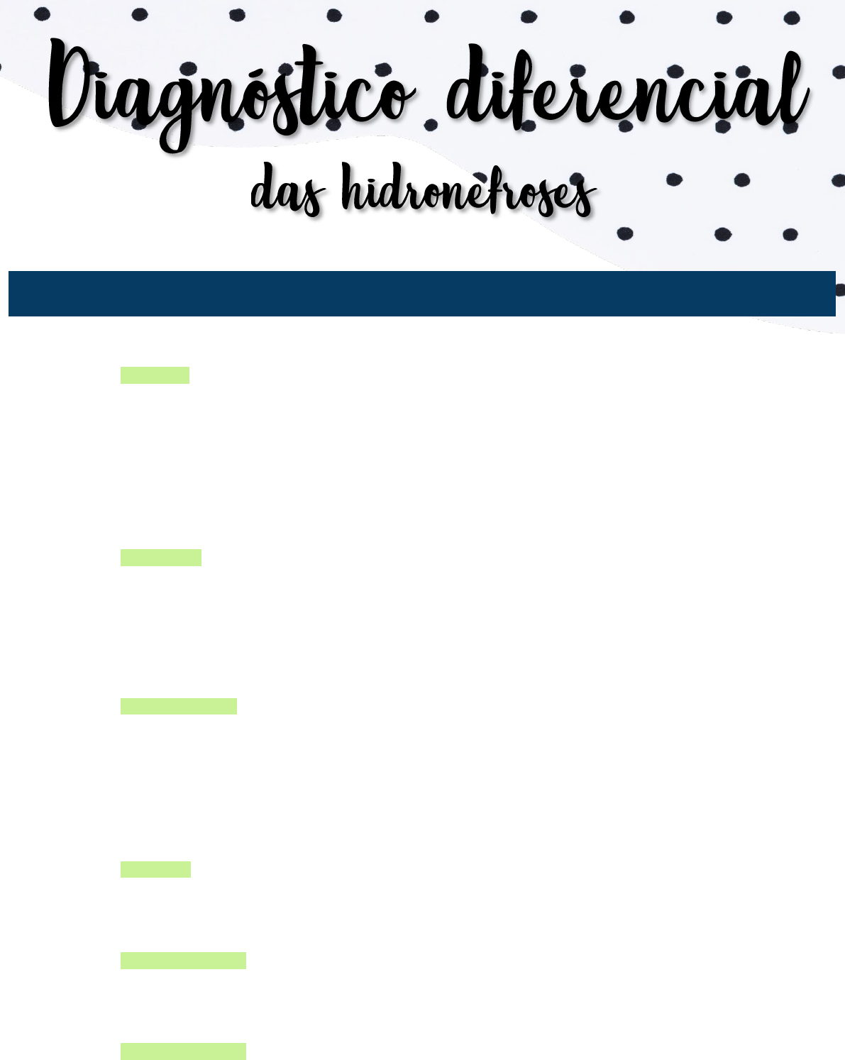• Classificação estrutural: de número, migração, forma e fusão, rotação, vascularização e sistema coletor o Número: os rins são formados na pelve e vão ascendendo para a fossa renal. Com isso, o indivíduo pode nascer com uma anagesia, com mais de dois rins. ▪ O mais comum é a agenesia renal, podendo ser uni ou bilateral, caracteriza-se pelo fracasso do desenvolvimento dos metanefros ou agenesia do broto ureteral • Sd. Potter: fascies patognomônica, predisposição genética elevada, determinada pelo rastreamento dos pais e irmãos ▪ Rins suprenumerários: é um órgão acessório, com suprimento sanguíneo e sistema coletor próprios. Surgem por evaginação secundária do ducto mesonéfrico ou por uma ramificação do broto ureteral primário, seguido da divisão do blastema metanéfrico. É raro e de incidência desconhecida o Migração: ▪ Rins ectópicos podem se localizar pélvicamente, fossa ilíaca, abdominal, torácica e contralateral ou cruzada • Ectopia renal simples: falha na ascensão do rim da região sacral para a fossa renal → 50% são rins hidronefróticos, principalmente por OJUP • Ectopia renal cefálica: rim mais cranial que o habitual, relacionado com onfalocele, sendo comumente assintomático (achado de exame) • Rim torácico: 5% das ectopias renais, raro e normalmente assintomático o Forma e fusão: ▪ Ectopia renal cruzada com ou sem fusão: rim contralateral à inserção do seu ureter na bexiga. 90% dos casos são de fusão do rim ectópico com o ipsilateral, normalmente são assintomáticos ▪ Rim em ferradura: anomalia de fusão mais comum, apresenta duas massas renais distintas, interligadas pelos polos inferiores, sendo que essa interligação pode ser fibrosa ou parenquimatosa. O rim em ferradura fica em uma localização mais baixa, pois a artéria mesentérica superior impede que ele suba. Os polos superiores são mais afastados do que os inferiores o Rotação: ▪ Após atingirem sua posição anatômica definitiva, os cálices ficam orientados lateralmente e a pelve medialmente. Quando não há esse alinhamento, há a má- rotação renal. Normalmente é acompanhada por outras anomalias como rim em ferradura e as ectopias com ou sem fusão o Vascularização: ▪ Vascularização múltipla: ramificações da artéria renal antes de adentrar o parênquima renal ou por ramos diretos da aorta ▪ Vaso anômalo: ramos que não se originam da aorta ou da artéria renal principal ▪ Vaso acessório: dois ou mais ramos arteriais suprindo o mesmo segmento renal o Sistema coletor: ▪ Estenose de JUP (junção ureteropiélica) Anomalias do trato urinário superior Obstrução congênita da junção ureteropiélica Caracteriza-se pela restrição ao fluxo urinário de pelve renal em direção ao ureter que, se não for tratada, pode provocar deterioração progressiva da função renal Hidronefrose fetal: • 48% das resoluções são espontâneas • 15% dilatação sem obstrução (pelve extra-renal) • 11% estenose de JUP • A estenose de JUP é a causa mais comum de hidrofonese antenatal Patogênese: obstrução do fluxo urinário através da JUP, com dilatação a montante e deterioração renal progressiva pela atrofia isquêmica. A hidronefrose nem sempre progride, pode se estabelecer em um equilíbrio até ter melhora progressiva Fatores fisiológicos de progressão ou estabilização: débito e fluxo urinário durante a diurese, anatomia e o grau de obstrução, função glomerular e tubular e alterações da complacência da pelve renal Etiologias: • Intrínseca ou congênita: é a mais frequente o Segmento estreitado fica ao nível da JUP, mas prévio o Por interrupção no desenvolvimento da musculatura circular da JUP o Por alteração na composição das fibras colágenas entre e ao redor das células musculares • Extrínseca: em geral decorre da ramificação anômala ou precoce do vaso que nutre o polo inferior, causando obstrução mecânica ao passar anteriormente a JUP • OJUP secundária: associada ao RVU grave em 10% dos casos. Uma dobra se forma na região da JUP e, por ser uma área de relativa fixação, pode causar obstrução secundária. Quando necessária a correção da JUP, esta deve preceder a correção do RVU • OJUP do polo inferior: é mais rara, ocorrem más duplicações renais incompletas, podendo existir obstrução da unidade inferior • Anomalias associadas: OJUP de rim contralateral, displasia renal, rim multicístico Quadro clínico: • Período antenatal e neonatal: o Antes do USG pré-natal → diagnóstico com palpação de massa abdominal, sendo geralmente assintomáticos o Em casos de rim único ou com OJUP bilateral pode ocorrer oligodrâmnio (líquido amniótico é basicamente urina fetal, então se há uma diminuição nessa quantidade, tem que ser pesquisado se não há OJUP), azotemia, distúrbio hidroeletrolítico ou oligoanúria o Urosepsis pode ser a manifestação inicial, com menos frequência • Crianças em fase pré-escola, adolescentes e adultos: o Dor abdominal ou lombar episódica o Dor desencadeada ou agravada por ingesta hídrica abundante, acompanhada de náuseas e vômitos o Hematúria pode ser observada após trauma, possivelmente por ruptura de pequenos vasos da mucosa da via excretora Diagnóstico: • USG pré-natal, cintilografia renal, uretrocistografia miccional, urografia excretora, pielografia ascendente, estudo fluxo/pressão de Whitaker, urorressonância e biomarcadores o USG pré-natal: o rim pode ser visualizado entre as 16-18ª semanas quando quase todo o líquido amniótico é urina. A partir da 28ª semana o USG fica mais sensível para detecção de alterações do trato urinário. Em função da oligúria transitória nos 3 primeiros dias de vida do RN, a hidrofonese pode estar subestimada. O USG consegue diagnosticar se há dilatação piélica e calicial, sendo classificado conforme a Society of Fetal Urology (SFU) o grau de hid