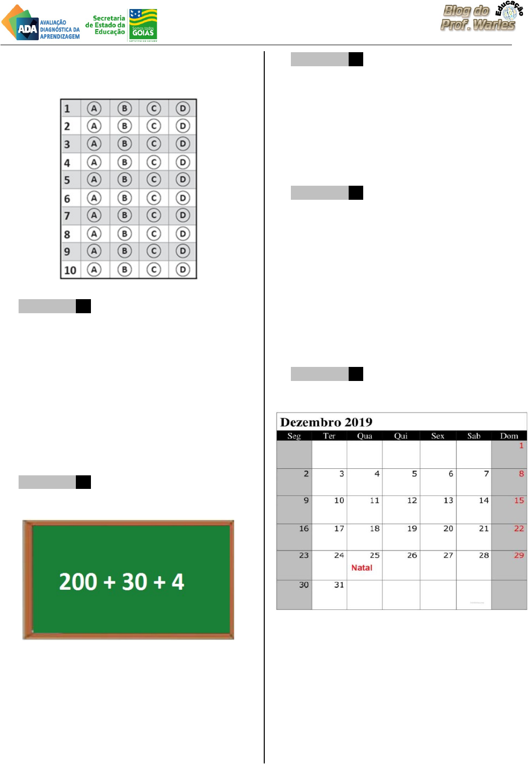 1ª Prova Diagnóstica – 2020 – 3º Ano SEDUCE-GO – Matemática ESCOLA: ________________________ Prof.:____________________________ Nome: ___________________________ D Questão 1 –––––––––––––––––––––––––––◊ Miguel quer juntar até o final do mês de fevereiro 68 bolinhas de gude. Miguel já tem 23 bolinhas de gude. Ele ainda precisa juntar (A) 40 bolinhas de gude. (B) 45 bolinhas de gude. (C) 90 bolinhas de gude. (D) 91 bolinhas de gude. D Questão 2 –––––––––––––––––––––––––––◊ Veja a seguir a decomposição de um número no quadro. O número escrito no quadro é o (A) 234. (B) 2304. (C) 20034. (D) 200304. D Questão 3 –––––––––––––––––––––––––––◊ Na sala de aula de Pedro há 5 fileiras de cadeiras. Em cada fileira há 7 cadeiras. Quantos cadeiras há na sala de aula de Pedro? (A) 12 (B) 25 (C) 35 (D) 49 D Questão 4 –––––––––––––––––––––––––––◊ Em uma gincana escolar a equipe verde fez 24 pontos. A equipe amarela fez metade dos pontos da equipe verde. Quantos pontos a equipe amarela marcou na gincana? (A) 12 pontos (B) 22 pontos (C) 26 pontos (D) 48 pontos D Questão 5 –––––––––––––––––––––––––––◊ Observe o calendário do mês de dezembro de 2019. Disponível em: https://tinyurl.com/Dispon-vel-em-https-cdna-p. Acesso em: 17 de jan de 2020. O dia da semana que se comemorou o Natal no ano de 2019 foi (A) domingo. (B) terça-feira. (C) quarta-feira. (D) quinta-feira. D Questão 6 –––––––––––––––––––––––––––◊ Observe a seguir o desenho feito com peças geométricas. Qual dessas peças é um triângulo? (A) Peça 1 (B) Peça 2 (C) Peça 3 (D) Peça 4 D Questão 7 –––––––––––––––––––––––––––◊ Observe o relógio a seguir. A hora marcada nesse relógio é (A) cinco horas e oito minutos. (B) oito horas. (C) oito horas e cinco minutos. (D) oito horas e cinquenta minutos. D Questão 8 –––––––––––––––––––––––––––◊ Observe a sequência numérica a seguir. Os números que completam a sequência na ordem crescente são (A) 20, 29, 38. (B) 21, 30, 39. (C) 22, 31, 40. (D) 23, 32, 41. D Questão 9 –––––––––––––––––––––––––––◊ Observe a subtração a seguir. O resultado dessa subtração é (A) 17. (B) 23. (C) 27. (D) 91. D Questão 10 –––––––––––––––––––––––––◊ Observe as moedas que Laura ganhou da sua mãe, representadas na figura a seguir. Essas moedas podem ser trocadas por uma nota de (A) (B) (C) (D) 1