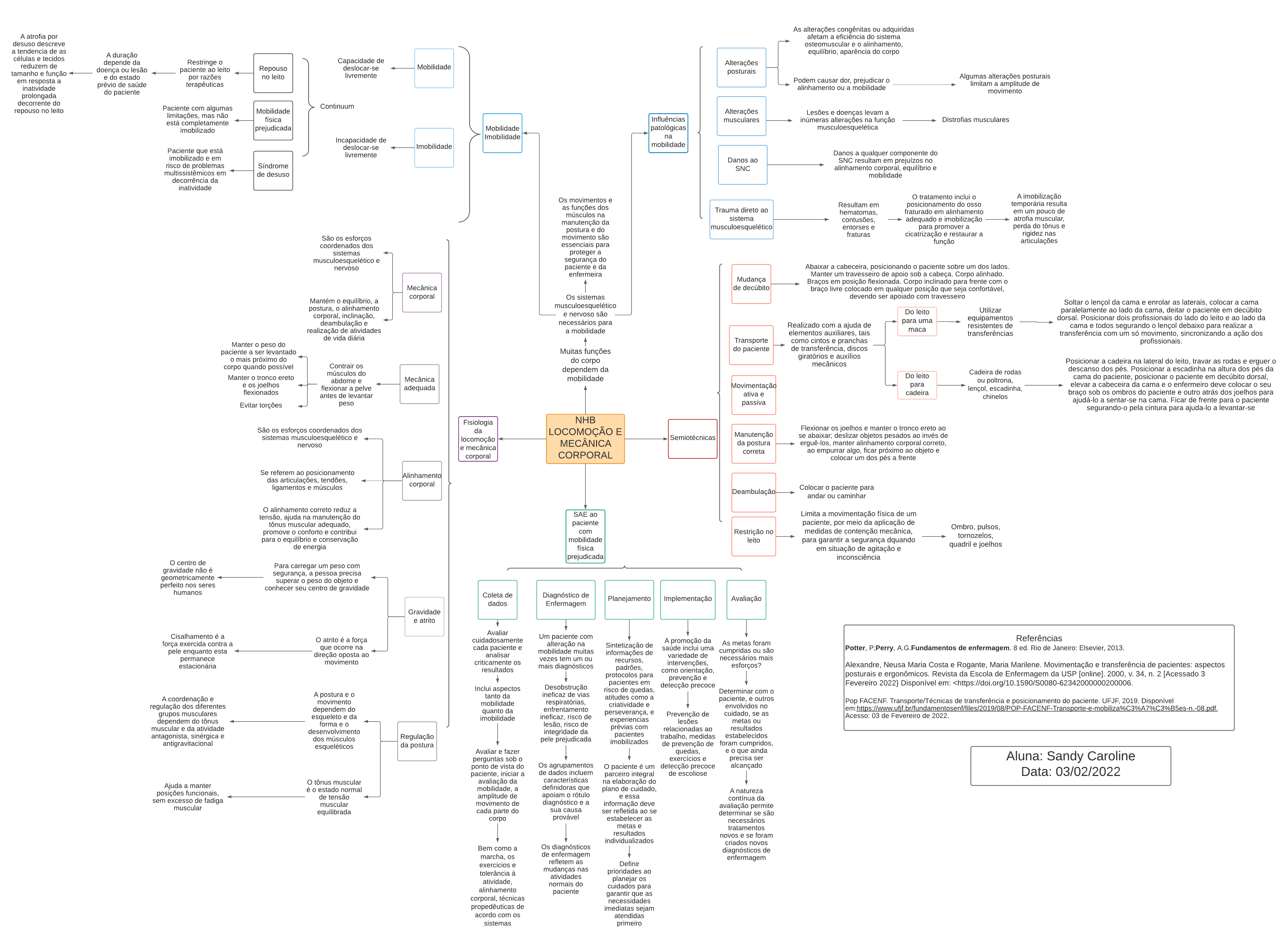 NHB LOCOMOÇÃO E MECÂNICA CORPORAL Fisiologia da locomoção e mecânica corporal SAE ao paciente com mobilidade física prejudicada Semiotécnicas Mecânica corporal Mecânica adequada Alinhamento corporal Muitas funções do corpo dependem da mobilidade Os sistemas musculoesquelético e nervoso são necessários para a mobilidade Os movimentos e as funções dos músculos na manutenção da postura e do movimento são essenciais para proteger a segurança do paciente e da enfermeira São os esforços coordenados dos sistemas musculoesquelético e nervoso Mantém o equilíbrio, a postura, o alinhamento corporal, inclinação, deambulação e realização de atividades de vida diária São os esforços coordenados dos sistemas musculoesquelético e nervoso Se referem ao posicionamento das articulações, tendões, ligamentos e músculos O alinhamento correto reduz a tensão, ajuda na manutenção do tônus muscular adequado, promove o conforto e contribui para o equilíbrio e conservação de energia Gravidade e atrito O atrito é a força que ocorre na direção oposta ao movimento Cisalhamento é a força exercida contra a pele enquanto esta permanece estacionária Para carregar um peso com segurança, a pessoa precisa superar o peso do objeto e conhecer seu centro de gravidade O centro de gravidade não é geometricamente perfeito nos seres humanos Contrair os músculos do abdome e flexionar a pelve antes de levantar peso Manter o peso do paciente a ser levantado o mais próximo do corpo quando possível Manter o tronco ereto e os joelhos flexionados Evitar torções Regulação da postura A postura e o movimento dependem do esqueleto e da forma e o desenvolvimento dos músculos esqueléticos A coordenação e regulação dos diferentes grupos musculares dependem do tônus muscular e da atividade antagonista, sinérgica e antigravitacional O tônus muscular é o estado normal de tensão muscular equilibrada Ajuda a manter posições funcionais, sem excesso de fadiga muscular Influências patológicas na mobilidade Alterações posturais Alterações musculares Danos ao SNC Trauma direto ao sistema musculoesquelético As alterações congênitas ou adquiridas afetam a eficiência do sistema osteomuscular e o alinhamento, equilíbrio, aparência do corpo Podem causar dor, prejudicar o alinhamento ou a mobilidade Algumas alterações posturais limitam a amplitude de movimento Lesões e doenças levam a inúmeras alterações na função musculoesquelética Danos a qualquer componente do SNC resultam em prejuízos no alinhamento corporal, equilíbrio e mobilidade Resultam em hematomas, contusões, entorses e fraturas O tratamento inclui o posicionamento do osso fraturado em alinhamento adequado e imobilização para promover a cicatrização e restaurar a função A imobilização temporária resulta em um pouco de atrofia muscular, perda do tônus e rigidez nas articulações Distrofias musculares Mobilidade Imobilidade Mobilidade Imobilidade Capacidade de deslocar-se livremente Incapacidade de deslocar-se livremente Continuum Repouso no leito Mobilidade física prejudicada Restringe o paciente ao leito por razões terapêuticas A duração depende da doença ou lesão e do estado prévio de saúde do paciente A atrofia por desuso descreve a tendencia de as células e tecidos reduzem de tamanho e função em resposta a inatividade prolongada decorrente do repouso no leito Paciente com algumas limitações, mas não está completamente imobilizado Síndrome de desuso Paciente que está imobilizado e em risco de problemas multissistêmicos em decorrência da inatividade Coleta de dados Diagnóstico de Enfermagem Planejamento Implementação Avaliação Avaliar cuidadosamente cada paciente e analisar criticamente os resultados Inclui aspectos tanto da mobilidade quanto da imobilidade Avaliar e fazer perguntas sob o ponto de vista do paciente, iniciar a avaliação da mobilidade, a amplitude de movimento de cada parte do corpo Bem como a marcha, os exercicios e tolerância à atividade, alinhamento corporal, técnicas propedêuticas de acordo com os sistemas Um paciente com alteração na mobilidade muitas vezes tem um ou mais diagnósticos Desobstrução ineficaz de vias respiratórias, enfrentamento ineficaz, risco de lesão, risco de integridade da pele prejudicada Os agrupamentos de dados incluem características definidoras que apoiam o rótulo diagnóstico e a sua causa provável Os diagnósticos de enfermagem refletem as mudanças nas atividades normais do paciente Sintetização de informações de recursos, padrões, protocolos para pacientes em risco de quedas, atitudes como a criatividade e perseverança, e experiencias prévias com pacientes imobilizados O paciente é um parceiro integral na elaboração do plano de cuidado, e essa informação deve ser refletida ao se estabelecer as metas e resultados individualizados Definir prioridades ao planejar os cuidados para garantir que as necessidades imediatas sejam atendidas primeiro A promoção da saúde inclui uma variedade de intervenções, como orientação, prevenção e detecção precoce Prevenção de lesões relacionadas ao trabalho, medidas de prevenção de quedas, exercícios e detecção precoce de escoliose As metas foram cumpridas ou são necessários mais esforços? Determinar com o paciente, e outros envolvidos no cuidado, se as metas ou resultados estabelecidos foram cumpridos, e o que ainda precisa ser alcançado A natureza contínua da avaliação permite determinar se são necessários tratamentos novos e se foram criados novos diagnósticos de enfermagem Mudança de decúbito Transporte do paciente Movimentação ativa e passiva Manutenção da postura correta Restrição no leito Deambulação Realizado com a ajuda de elementos auxiliares, tais como cintos e pranchas de transferência, discos giratórios e auxílios mecânicos Do leito para uma maca Utilizar equipamentos resistentes de transferências Solta