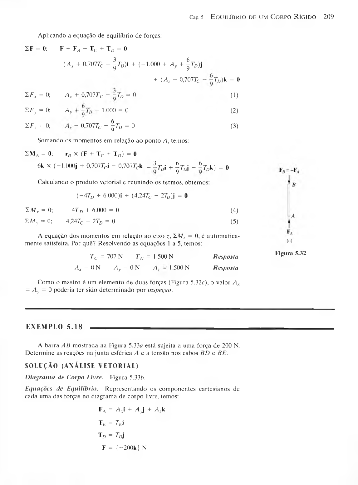Cap. 5 E q u i l í b r i o d e u m C o r p o R í g i d o 2 0 9 2 F = 0: F + F^ + Tc + T D = 0 (A x + 0,707rc - ^ T d )i + (-1 .000 + A y + ^ T D)j Aplicando a equação de equilíbrio de forças: 2 F X = 0; A x + 0,707T c - - T D = 0 S F y = 0; ^ - 1.000 = 0 2 F Z = 0; - 0,707Tc ~ \ td = 0 + (A z - 0,707rc - - 7 D)k = 0 O ) (2) (3) Somando os momentos em relação ao ponto A , temos: 2 M „ = 0: rB X (F + Tc + T D) = # 6k X ( —l.OOOj + 0,707rc i - 0.707Tc k _ l T[)i + | r Dj _ l r£)k) = 0 Calculando o produto vetorial e reunindo os termos, obtemos: ( - 4 Td + 6.000)i + (4,247c - 2TD)\ = 0 SM * = 0; - 4 T d + 6.000 = 0 (4) 'ZMy = 0; 4,24rc - 2TD = 0 (5) A equação dos momentos em relação ao eixo z, XM Z = 0, é autom atica m ente satisfeita. Por quê? Resolvendo as equações 1 a 5, temos: T c = 707 N T d = 1.500 N Resposta A x = 0 N A y = 0 N A z — 1.500 N Resposta Como o mastro é um elem ento de duas forças (Figura 5.32c), o valor A x = A v = 0 poderia ter sido determ inado por inspeção. (c) Figura 5.32 EXEMPLO 5 . 1 8 A barra A B mostrada na Figura 5.33a está sujeita a uma força de 200 N. Determine as reações na junta esférica A e a tensão nos cabos BD e BE. SOLUÇÃO (ANÁLISE VETORIAL) D iagram a de Corpo Livre. Figura 5.336. Equações de Equilíbrio. Representando os componentes cartesianos de cada uma das forças no diagrama de corpo livre, temos: ¥ a = A xi + A yj + A zk T f = TEi Td = 7))j F = {—200k} N 2 1 0 E s t á t ic a Figura 5.33 Aplicando a equação de equilíbrio de forças: 2 F = 0; ¥ a + Te + Td + F - 0 (A x + Te )i + ( A y + TD)j + (A z - 200)k = 0 2 F , = 0; A x + T e = 0 ZFy = 0; Ay + T d = 0 1 F Z = 0; A z - 200 = 0 O som atório dos m om entos em relação ao ponto A fornece: 2 M a = 0: rc X F + rB X (T £ + T D) = 0 Como rc = \ tb, então: (0,5i + lj - lk ) X (-200k) + (li + 2j - 2k) X (TEi + TDj) = 0 Expandindo e rearranjando os termos, obtemos: (2Td - 200)i + ( - 2 Te + 100)j + (Td - 2TE)k = 0 = 0 ; 2TD - 200 = 0 2 M y = 0; —2T £ + 100 = 0 (1) (2) (3) 2 M . = 0; T n - 2 T F = 0 (4) (5) (6) R esolvendo as equações 1 a 6, obtemos: Td — 100 N = 50 N A x = - 5 0 N Resposta Resposta Resposta Cap. 5 E q u i l í b r i o d e u m C o r p o R í g i d o 2 1 1 A y 100 N Resposta A z — 200 N Resposta Os sinais negativos indicam que A x e A v têm sentidos opostos aos mos trados no diagrama de corpo livre, na Figura 5.336. EXEMPLO 5 . 1 9 ________________________________________________ A barra dobrada da Figura 5.34a está apoiada em A por um mancai sim ples, em D por uma junta esférica e em B por meio de um cabo BC. Utilizando apenas uma equação de equilíbrio, obtenha uma solução direta para a força no cabo BC. O mancai em A é capaz de exercer componentes de forças apenas na direção z, y , uma vez que ele está corretamente alinhado no eixo. Figura 5.34 S O L U Ç Ã O ( A N Á L I S E V E T O R I A L ) D iagram a de Corpo Livre. Como m ostrado na Figura 5.346, há seis incóg nitas: três com ponentes de força originados na junta esférica, dois causados pelo mancai e um causado pelo cabo. Equações de Equilíbrio. A força de tração no cabo J B pode ser obtida direta mente pelo somatório dos momentos em relação a um eixo passando pelos pontos D e A. Por quê? A direção do eixo é definida por um vetor unitário u, onde: _ r DA _ ___1 _ . _____ 1 _ . ‘ rDA ~ V 2 1 V 2 J = -0,707i - 0,707j Conseqüentem ente, a soma dos momentos em relação a esse eixo será zero, contanto que: = u* 2 ( r X F) = 0 Nessa equação, r representa um vetor posição com origem em qualquer ponto sobre o eixo DA e extremidade em qualquer ponto sobre a linha de ação da força F (veja a Equação 4.11). Em relação à Figura 5.346, podemos escrever: