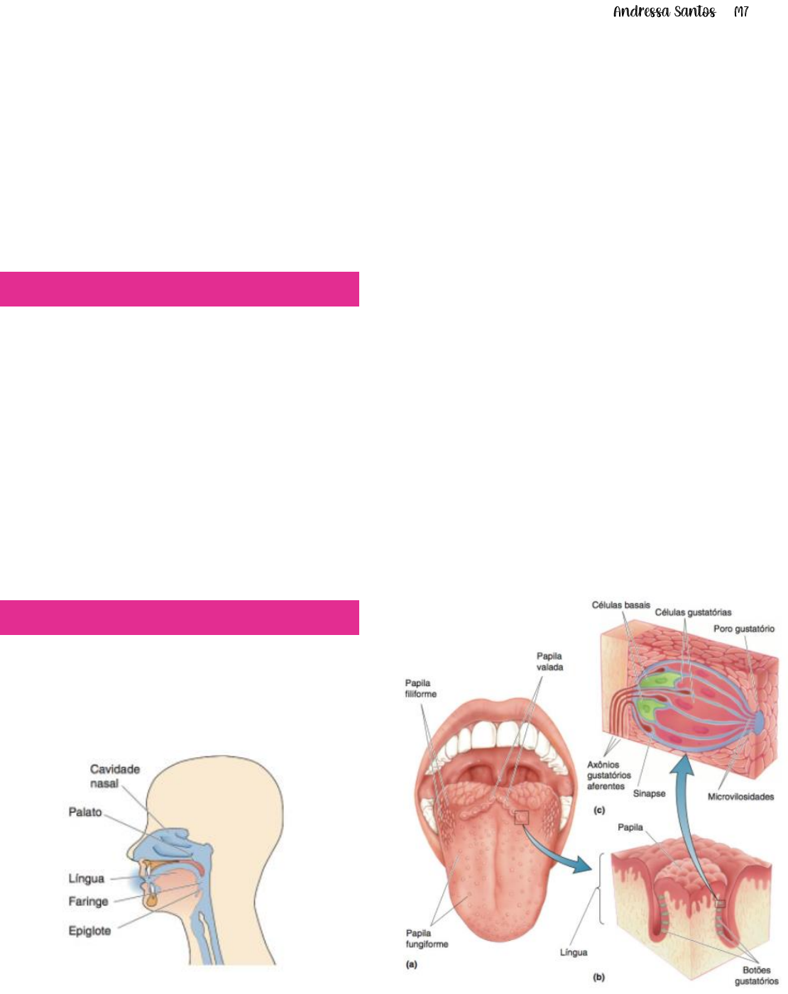 – Sentidos Químicos: Gustação SABORES BÁSICOS: 1. salgado 2. azedo (ácido) 3. doce 4. amargo 5. umami “delicioso”, definido pelo gosto saboroso do aminoácido glutamato; glutamato monossódico (GMS) Cada alimento ativa uma diferente combinação de sabores básicos ajudando-o a torná-lo único. Para distinguir o sabor único de um alimento, nosso cérebro combina informações sensoriais acerca de seu sabor, aroma e tato. ÓRGÃOS DA GUSTAÇÃO: A boca, palato, faringe e a epiglote estão envolvidas na experiência gustativa. Os aromas do alimentos que consumimos também passam pela faringe rumo à cavidade nasal, onde podem ser detectados pelos receptores olfatórios. Espalhadas sobre a superfície da língua, estão pequenas projeções, denominadas de PAPILAS, que podem ter formas de: 1. Cristas = Foliadas 2. Espinhas = Valadas 3. Cogumelos = Fungiformes Cada papila tem um a várias centenas de BOTÕES GUSTATÓRIOS, visíveis apenas ao microscópio. Cada botão tem de 50 a 150 CÉLULAS RECEPTORAS GUSTATÓRIAS, arranjadas como os gomos de uma laranja. As células gustatórias compreendem apenas 1% do epitélio da língua. Os botões gustatórios possuem ainda células basais que envolvem as células gustatórias, e mais um conjunto de axônios aferentes gustatórias. Uma pessoa normalmente possui de 2 mil a 5 mil papilas gustatórias, embora em casos excepcionais possa apresentar bem menos, em torno de 500, ou muito mais, na ordem de 20 mil. Concentrações muito baixas não serão percebidas, mas em uma concentração crítica, o estímulo evocará a percepção de sabor; esta é o limiar de concentração. – Em concentrações imediatamente acima do limiar, a maioria das papilas tende a ser sensível a apenas um sabor básico: há papilas sensíveis ao azedo (ácido) e papilas sensíveis ao doce, por exemplo. Entretanto, quando as concentrações dos estímulos gustatórios aumentam, a maioria das papilas torna-se menos seletiva. LOGO: Cada papila tem vários tipos de células receptoras gustatórias e cada tipo de receptor é especializado para uma categoria diferente de sabor. CÉLULAS RECEPTORAS GUSTATÓRIAS A parte quimicamente sensível de uma célula receptora é a sua pequena região de membrana, chamada de extremidade apical, próxima da superfície da língua. As extremidades apicais têm extensões finas, chamadas de microvilosidades, que se projetam para o PORO GUSTATÓRIO, uma pequena abertura na superfície da língua, onde a célula gustatória é exposta ao conteúdo da boca. De acordo com critérios histológicos padrão, as células receptoras gustatórias não são neurônios. Entretanto, elas fazem sinapses com os terminais axonais gustatórios aferentes, na base dos botões gustatórios. As células receptoras gustatórias também estabelecem sinapses químicas e elétricas com algumas células basais; algumas células basais fazem sinapses com axônios sensoriais, e estes podem formar um circuito simples de processamento de informação dentro de cada botão gustatório. As células do botão gustatório sofrem um constante ciclo de crescimento, morte e regeneração; a vida média de uma célula gustatória é de cerca de 2 semanas. Esse processo depende da influência do nervo sensorial, uma vez que, se o nervo for cortado, o botão gustatório degenera. Quando um composto químico apropriado ativa uma célula receptora gustatória, seu potencial de membrana se altera, geralmente por despolarização. Essa mudança na voltagem é denominada potencial do receptor. Se o potencial do receptor é despolarizante e suficientemente grande, alguns receptores gustatórios, assim como os neurônios, podem disparar potenciais de ação. De qualquer modo, a despolarização da membrana do receptor promove a abertura de canais de cálcio dependentes de voltagem; o íon Ca2+ entra no citoplasma e desencadeia a liberação do transmissor. Essa é a transmissão sináptica básica, de um receptor gustatório para um axônio sensorial. O transmissor liberado depende do tipo de célula receptora gustatória. As células gustatórias para os estímulos azedo (ácido) e salgado liberam serotonina em axônios gustatórios, ao passo que as células para os estímulos doce, amargo e umami liberam trifosfato de adenosina (ATP) como transmissor primário. Em ambos os casos, o transmissor do receptor gustatório excita o axônio sensorial pós- sináptico, que dispara potenciais de ação comunicando o sinal gustatório para o tronco encefálico. As células gustatórias também podem usar outros transmissores, incluindo acetilcolina, GABA e glutamato, mas suas funções ainda são desconhecidas. – Cada axônio gustatório é influenciado por vários dos sabores básicos, mas cada um apresenta uma clara preferência. MECANISMOS DE TRANSDUÇÃO GUSTATÓRIA: É o processo pelo qual um estímulo ambiental causa uma resposta elétrica em uma célula receptora sensorial. A natureza do mecanismo de transdução determina a sensibilidade específica de um sistema sensorial. Alguns sistemas sensoriais possuem um único tipo básico de célula receptora que utiliza um mecanismo de transdução (p. ex., o sistema auditivo). Entretanto, a transdução gustatória envolve diversos processos diferentes, e cada sabor básico pode usar um ou mais desses mecanismos. Os estímulos gustatórios podem: (1) passar diretamente através de canais iônicos (salgado e ácido); (2) ligar-se a e bloquear canais iônicos (ácido) (3) ligar-se a receptores de membrana acoplados a proteínas G, que ativam sistemas de segundos mensageiros, que, por sua vez, abrem canais iônicos (doce, amargo e umami). - SABOR SALGADO: O protótipo da substância química salgada é o sal de mesa (NaCl). O sal é considerado incomum, pois concentrações relativamente baixas (10-150 mM) têm sabor agradável, ao passo que as concentrações mais elevadas tendem a ser desagradáveis e repulsivas. O sabor do sal é pri