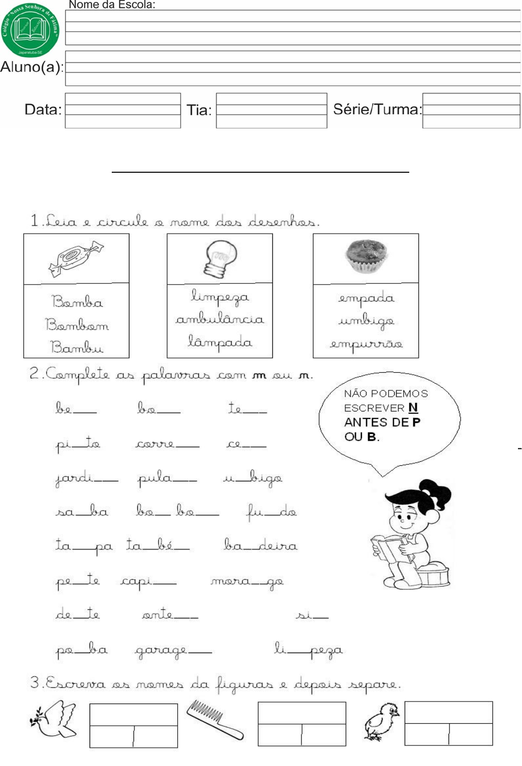 Atividade de Língua Portuguesa – Sala 1-Complete as frases, escrevendo as palavras conforme a legenda. as palavras: Atividade de Língua Portuguesa – Sala 1- Leia poema e responda: 2-Complete as frases usando os enigmas. 4- Complete as palavras com M ou N depois escreva as palavras: 5- Use a palavra adequada para completar cada frase: Atividade de Ensino Religioso – Sala 1.Os valore são ensinamentos que recebemos desde pequenos e são passados por nossos pais para que possamos crescer sabendo o certo e o errado. A imagem está demostrando o que? Um ato de respeito com o colega. Um ato de afeto e respeito. Um ato de desrespeito e falta de amor. Um ato de amor. 2. Pinte os corações que indica como devemos tratar nossos colegas e amigos.
