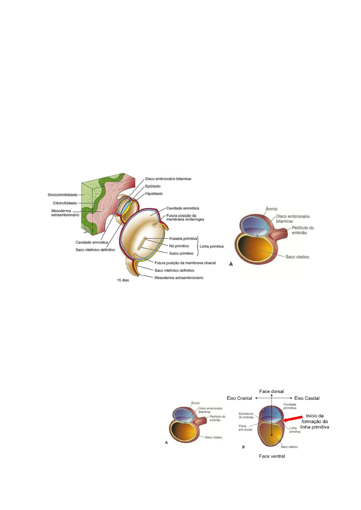 3 semana do desenvolvimento embrionário Eventos importantes 1. Gastrulação 2. Neurulação 3. Formação de sonetos e do celoma embrionário 4. Desenvolvimento do sistema cardiovascular primitivo A terceira semana de desenvolvimento ocorre durante a primeira semana sem menstruação. A ausência da menstruação é, normalmente, a 1ª indicação de uma possível gravidez. Aproximadamente cinco semanas após o último período regular menstrual, uma gravidez saudável pode ser decretada pela USG. O disco bilaminar é composto por epiblasto na parte de cima e pra baixo é o hipoblasto. Dessa forma na 3 semana temos dois tecidos, epiblasto e hipoblasto. A partir do disco bilaminar se inicia a gastrulação. A gastrulação é o momento em que o embrião passa por diversa modificações, a principal sendo a mudança do disco bilaminar para o trilaminar (as 3 camadas embrionárias. Ectoderma, mesoderma e endoderma). As modificações são: 1. Formação da linha primitiva 2. Formação das camadas germinativas (bilaminar -> trilaminar) 3. Desenvolvimento da notocorda. INÍCIO DA GASTRULAÇÃO A formação da linha primitiva vai anunciar a gastrulação e o início da formação dos eixos embrionários - cranial e caudal- dorsal e ventral. O sentido de crescimento da linha primitiva SEMPRE vai ser o cranial. As células do epiblasto começam a se dividir e movem-se em direção ao plano mediano do disco embrionário - formando uma elevação (parte mais gordinha) do epiblasto originando o polo caudal do embrião. LINHA PRIMITIVA É formada por sulco primitivo, nó primitivo e fosseta primitiva. Sulco: é a região mais profunda (como se fosse um vale) Nó: fica na ponta, formando como se fosse um lago Fosseta: é como se fosse um buraco que atravessa o tecido, que vai do epiblasto até o hipoblasto. É a comunicação entre os dois tecidos. A fosseta acontece para que entre os dois tecidos comece a se formar o 3º tecido, o mesênquima que é formado por células mesenquimais. Quando o mesênquima estiver cheio de células mesenquimais, os tecidos mudam de nome, o que era epiblasto, mesênquima e hipoblasto, se torna respectivamente ectoderma, mesoderma e endoderma. No final da terceira/quarta semana do desenvolvimento, a linha primitiva começa a regredir gradativamente até desaparecer na neurulação. - O não desaparecimento da linha primitiva normalmente na 4ª semana, pode originar um grande tumor conhecido como teratoma sacrococcígeo. O tumor tem tecidos das 3 camadas em etapas incompletas de diferenciação. O tratamento é cirúrgico e tem um prognóstico bom. Incidência: 1/27.000 recém nascidos. Mesmo sendo visto nos USG, os médicos esperam para ver após o nascimento qual/se alguma estrutura foi danificada. PROCESSO NOTOCORDAL A fosseta se torna uma passagem agora do ectoderma para o mesoderma, e dessa comunicação vai começar a se formar um “túnel” que vai se aprofundar somente na região do mesoderma embaixo da linha primitiva e formar o canal/processo notocordal. Dentro desse canal vai se formar a placa notocordal. A placa notocordal vai ser rígida (porém não tanto quanto um osso), para que ela possa se dobrar e formar a notocorda. A notocorda forma o eixo primitivo do embrião em torno do qual se constituirá o esqueleto axial. No final da gastrulação então temos a notocorda formada, a formação dos 3 folhetos germinativos e início da neurulação. GASTRULAÇÃO ANORMAL A gastrulação anormal pode levar à disgenia ou displasia caudal. É caracterizada por graus variáveis. Caracterizados por defeitos nas vértebras lombares, ânus imperfurados e alterações nas formações da estruturas genitais. Em casos extremos, a deficiência no desenvolvimento caudal leva à fusão dos brotos dos membros inferiores durante o desenvolvimento inicial, resultando em um aspecto semelhante a sereia -> sirenomelia, incidência 1/70.000 NEURULAÇÃO Processos envolvidos na formação da placa neural e pregas neurais e fechamento dessa pregas para formar o tubo neural. A notocorda induz a formação da placa neural. A partir do momento que começa o processo de neurulação a gástrula é nomeada de nêurula. Placa neural é espessamento na linha média do ectoderma embrionário, somente em cima da parte da notocorda, em posição cefálica ao nó primitivo. A notocorda manda sinais para o ectoderma, par que ele se diferencie em placa neural que vai sofrer um envaginamento formando dois picos formando as pregas neurais e no meio é o sulco neural. Com a junção das pregas se forma um tubo oco, esse tudo oco é o tubo neural que é o primórdio do sistema nervoso central. Depois da formação do tubo neural, vão crescendo prolongamentos por dentro chamados crista neural que vai dar origem ao sistema nervoso periférico. NEURULAÇÃO ANORMAL Distúrbios de neurulação podem resultar em anormalidades graves do cérebro e da medula espinal. Defeitos do tubo neural (DTN) estão entre as anomalias congênitas mais comuns. A meroencefalia (anencefalia) ou ausência parcial do cérebro é deficiência mais grave. Teratógenos- alteração no neuroectoderma que são falhas na fusão das dobras neurais e na formação do tubo neural na região cerebral resultam em anencefalia e na região lombar em espinha bífida cística. FORMAÇÃO DOS SOMITOS Mesoderma de cada lado da notocorda se espessa para formar as colunas longitudinais mesoderma paraxial (MP) No final da 3ª semana o MP começa a se dividir formando os somitos que vão originar a maior parte do esqueleto axial e músculos associados (ao esqueleto) e derme da pele adjacente, Par de somitos são usados para a estimativa da idade do embrião: 44 pares - 5 semanas FORMAÇÃO DO CELOMA INTRA-EMBRIONÁRIO O celoma intra-embrionário surge como espaços isolados no mesoderma lateral e no mesoderma cardiogênico (forma o coração) Estes espaços celômicos coalescem (unem) em seguida para formar irmã cavidade única e dará o