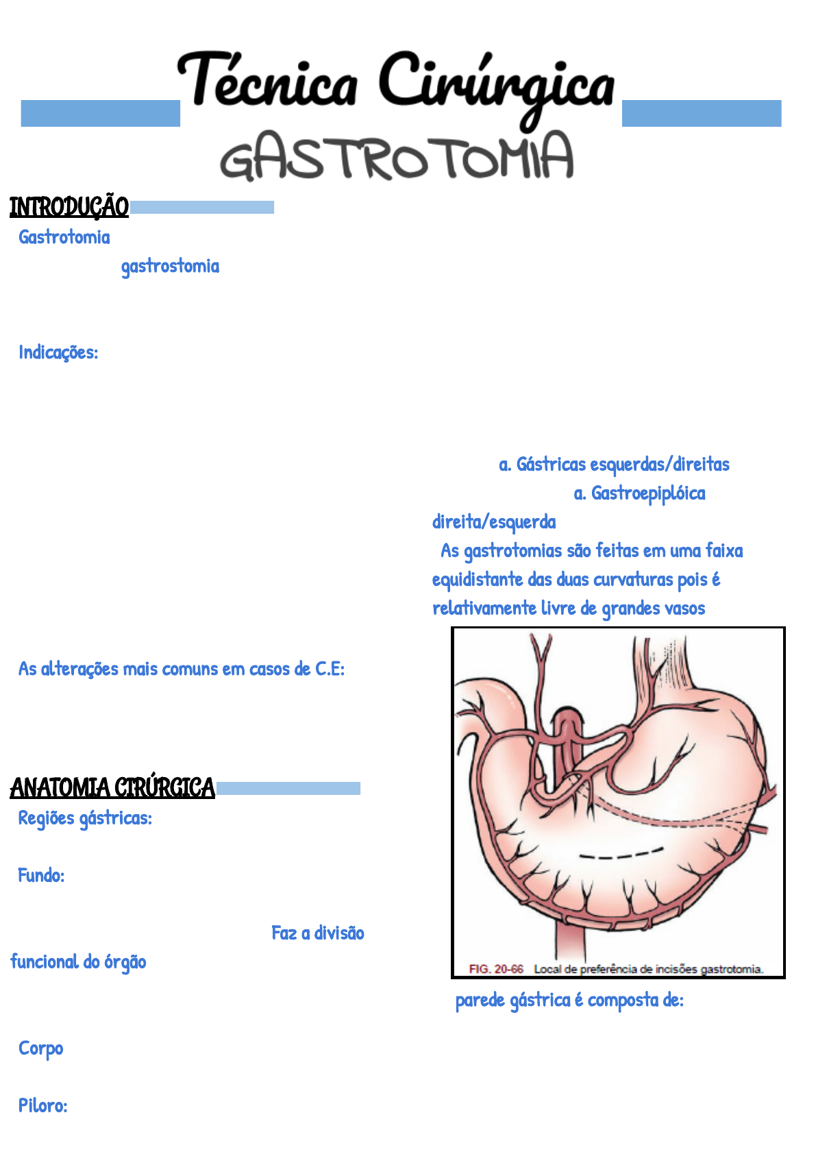 INTRODUÇÃO →Gastrotomia: Abertura do estômago (não confundir com gastrostomia que é a abertura arti�cial/de comunicação com o meio externo, do estômago) →Indicações: Retirada de corpos estranhos, obtenção de material para biópsia, esvaziamento gástrico, inspeção da mucosa gástrica p/buscar por úlceras/neoplasias, dentre outros →Se C.E estiver localizado no antro pilórico é observado vômito re�exo →Se o C.E se depositar na porção pilórica do estômago o esvaziamento gástrico tende a diminuir →Geralmente não é relatado vômito se o C.E estiver na região de fundo →As alterações mais comuns em casos de C.E: Desidratação, acidose metabólica, alcalose hipocalêmica ANATOMIA CIRÚRGICA →Regiões gástricas: Cárdia, fundo, corpo, piloro (antro, canal e esfíncter pilórico) →Fundo: Sua superfície cranial empurra o lado esquerdo do diafragma, tipicamente preenchido por gás (fácil visualização no RX) →Faz a divisão funcional do órgão (controla o enchimento de líquidos e a parte + distal tritura, mistura o suco gástrico e retém sólidos) →Corpo: Empurrado contra o lobo esquerdo do fígado e é sucedido pela parte pilórica →Piloro: Está ventralmente, à direita e ao redor do antro pilórico. Ele se abre dentro de um canal que termina no óstio pilórico (orifício dentro do duodeno) →A curvatura menor se liga ao fígado através do omento menor →O omento maior se origina na curvatura maior (ele aumenta a área de superfície serosa p/prod e absorção de �uidos e previne que os intestinos �quem presos entre o estômago e o fígado) →As artérias que irrigam o estômago derivam da a. Celíaca →a. Gástricas esquerdas/direitas �cam na curvatura menor e a. Gastroepiplóica direita/esquerda �cam na curvatura maior →As gastrotomias são feitas em uma faixa equidistante das duas curvaturas pois é relativamente livre de grandes vasos →A parede gástrica é composta de: Mucosa, submucosa (bem desenv e vascularizada), muscular e serosa PRÉ–OPERATÓRIO →Exame físico completo + Exames complementares (RX, US, Endoscopia) →Avaliar equilíbrio hidroeletrolítico →Corrigir antes da cirurgia!! →Pode ser necessário realizar uma antibioticoterapia pro�lática TÉCNICA OPERATÓRIA →Decúbito dorsal →Celiotomia pré-umbilical ou pré-retro-umbilical (em alguns casos) →Exposição e isolamento do órgão com 2 suturas de apoio equidistantes ou utilizando pinças Babcock na área menos vascularizada →Rotacionar o estômago a 90º p/incisão �car paralela a parede abdominal →Incisão paralela e equidistante em duas etapas: 1- Iniciar na camada seromuscular e aprofundar até a mucosa com o bisturi 2- Fazer uma incisão na mucosa com lâmina de bisturi, ampliando com a tesoura em direção às pinças →Inspecionar o órgão/retirar o C.E →Trocar luvas e todo o material antes de suturar (contaminado) →A sutura pode ser realizada de algumas maneiras: 1- Plano único: Causa menor inversão e melhor aposição das bordas da ferida →Usa-se o padrão simples interrompido perfurantes totais ou não perfurante total (bom pois o �o não �ca na mucosa, evitando o atrito) 2- Dois planos: 1º padrão= Cushing (�o absorvível sintético 3-0 ou 4-0), onde a sutura começa na serosa, penetra mas não atravessa a mucosa. O 2º padrão é feito com ponto simples separado, tipo Lembert (�o absorvível sintético 2-0 ou 3-0), passando a agulha em ângulo reto na incisão, através da seromuscular →A omentalização é feita com dois pontos simples separados →Fio absorvível sintético 2-0 ou 3-0 PÓS–OPERATÓRIO →Deve-se continuar a �uidoterapia até que o animal volte a ingerir água normalmente →Se o animal aceitar a água, a alimentação pastosa e em pequenas porções pode ser iniciada 24-48h após a cirurgia →Aumentar a consistência e quantidade do alimento até o 4º dia de pós-operatório, até que a alimentação normal seja restabelecida