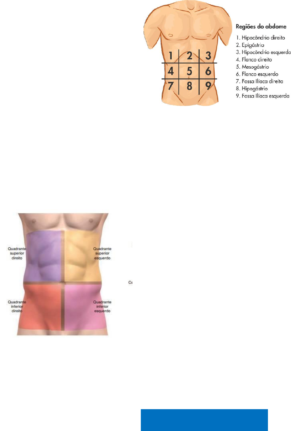 EXAME FÍSICO – ABDÔMEN Introdução: DIVISÃO DO ABDÔMEN É comum ao profissional utilizar o método dos quatro quadrantes para uma avaliação mais exata da região abdominal, que consiste na divisão do abdômen em quatro regiões iguais, usando duas linhas perpendiculares que se cruzam na linha umbilical. Localizar órgãos; Saber se estão aumentados; Palpação, percussão e ausculta. O método das nove regiões também pode ser utilizado contribuindo com mais detalhes ao exame físico e diagnóstico. O “jogo da velha”. 1 – HIPOCÔNDRIO DIREITO – lobo hepático e vesícula biliar 2 – EPIGÁSTRIO – extremidade pilórica do estomago, duodeno, pâncreas, porção do fígado 3 – HIPOCONDRIO ESQUERDO – estomago, cauda do pâncreas e flexura esplênica do cólon 4 – FLANCO DIREITO – cólon ascendente e porções do duodeno e jejuno 5 – MESOGÁSTRICO – omento, mesentérico, parte inferior do duodeno, jejuno e íleo 6 – FLANCO ESQUERDO – cólon descendente, porções do jejuno e íleo 7 – FOSSA ILÍACA DIREITA – ceco, apêndice e extremidade inferior do íleo 8 – HIPOGÁSTRIO – íleo 9 – FOSSA ILÍACA ESQUERDA – cólon sigmoide. INSPEÇÃO: Contorno do abdômen – plano, globoso, escafoide e saliente; Simetria – abaulamentos, massas, hérnias; -> Peça para o paciente respirar profundamente e depois sentar sem usar as mãos. Umbigo – linha média e invertido, evertido ou gravidez, ascite, hérnia umbilical; ((Sinal de Cullen (equimose azulada, roxa); na região umbilical devido à hemorragia retroperitoneal. Associada à ruptura de gravidez ectópica, mas também pode ser pancreatite aguda.)) Pele – lisa e uniforme, coloração homogênea (normal); Se estiver “brilhosa” pode ser ascite (liquido na cavidade peritoneal); Cicatrizes (regiões identificadas por quadrantes); Veias – visíveis pode ser hipertensão portal, cirosse, ascite e obstrução veia cava; Pulsação ou movimento – artéria aorta abdominal. ((Síndrome de Cushing – estrias, mudança da face – aumento da secreção de hormônio cortisol.)) AUSCULTA A ORDEM MUDA NESSE EXAME!!! Inicie no quadrante inferior direito (QID), sempre no sentido horário; Ruídos hidroaéreos “cachoeira”; Sons agudos, gorgolejantes, em cascata e irregular; Frequência de 5 – 30 min (< 5 hipoativo e >30 hiperativos); ((Em caso de pacientes com diarreia, os ruídos hidroaéreos vão estar bastante hiperativos.)) Ruídos vasculares (aorta, artérias renais, ilíacas e femorais); PERCURSSÃO Raciocínio clinico de acordo com o que percutiu; Densidade; Localizar órgãos; Avaliar presença de líquidos; Percuta os 4 quadrantes, sentido horário igual ausculta. Sons: timpânicos (normal), maciços (bexiga distendida, tecido adiposo, liquido e massas), hipertimpânicos são ocos (distensão gasosa). O tamanho do fígado pode ser medido pela percussão. Para isso percuta a linha hemiclavicular percutindo a região do tórax (som claro pulmonar) a partir do momento que você encontrar som maciço marque com um pincel. Depois, você inicia na parte inferior percutindo o abdômen até escutar novamente um som maciço e marca de novo. O tamanho vai variar de 6- 12 cm, se for > 12 é hepatomegalia. Já no baço, a percussão é na linha hemiaxilar (9º-11º espaço intercostal). O tamanho é em torno de 7 cm. Não é pra auscultar nessa região, se isso ocorrer, significa que tem uma esplenomegalia (som é de macicez esplênica). Procedimentos especiais: Teste do Piparote positivo (sentir onda de água do outro lado da mão) significa que o paciente está com ascite. PALPAÇÃO Exemplo: paciente está com dor no QID, então, se começa palpar no QSD. Avalie o tamanho; Localização; Consistência e sensibilidade; Superficial e Profunda. Superficial: com os 4 dedos comprima a pele cerca de 1cm, sempre em sentido horário e localizando os dolorosos por último. Profunda: com os 4 dedos comprima a pele cerca de 5-8cm; sentido horário e locais dolorosos por último. Identificação de massas: localização, tamanho, formato, consistência, mobilidade e sensibilidade. Fígado: posicione a mão (espalmada), peça para o paciente respirar profundamente (na expiração sente o fígado). Mão em garra, contra o paciente e palpe da mesma forma que a espalmada. Baço: normalmente impalpável. Procedimentos especiais: Sinal de Blumberg – pressione o ponto médio da cicatriz umbilical e da crista ilíaca anterossuperior e pressione. Ao retirar (rapidamente) se o paciente gritar de dor é indicação de inflamação peritoneal, sugestivo de apêndice. Sinal de Rosving – pressione o QIE, se o paciente sentir dor no QID pode ser sugestivo de apêndice. EXAME FÍSICO NORMAL DO ABDÔMEN: PLANO, FLÁCIDO, RHA (RUÍDOS HIDROAÉREOS PRESENTE), INDOLOR A PALPAÇAO E SEM MASSAS PALPÁVEIS.