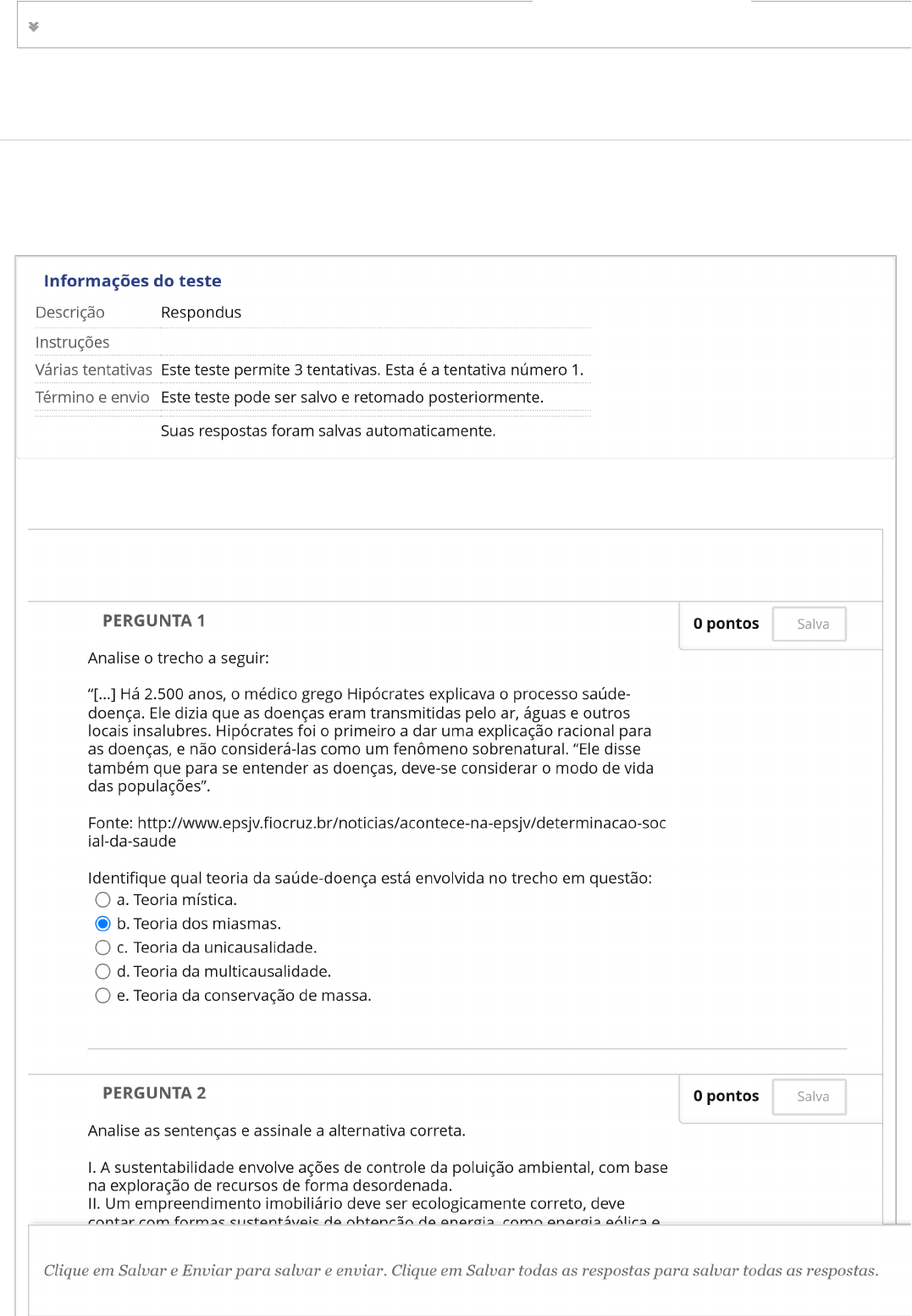 16/02/22, 15:47 Fazer teste: ATIVIDADE TELEAULA I – SAUDE AMBIENTAL / ... Estado de Conclusão da Pergunta : UNIP EA D BIBLIOTECA S MURAL DO ALUN O TUTORIAI S CONTEÚDOS ACADÊMICO S ? SAUDE AMBIENTAL / VIGILANCIA SANITARIA 7499-60_44701_R_F1_20221 CONTEÚDO Fazer teste: ATIVIDADE TELEAULA I https://ava.ead.unip.br/webapps/assessment/take/launch.jsp?course_assessment_id=_930591_1&course_id=_205907_1&content_id=_2532403… 1/2 16/02/22, 15:47 Fazer teste: ATIVIDADE TELEAULA I – SAUDE AMBIENTAL / ... conseguiremos usufruir o su ciente sem comprometer a obtenção dos mesmosa. b. c. d. e. recursos em gerações futuras. Somente a sentença I está correta. Somente a sentença II está correta. Somente a sentença III está correta. Somente as sentenças I e II estão corretas. Somente as sentenças II e III estão corretas. a. b. c. d. e. PERGUNTA 3 De acordo com o Código Sanitário do Município de São Paulo (Lei 13.725, de 9 de janeiro de 2004) as ações de vigilância sanitária abrangem o conjunto de medidas capazes de eliminar, diminuir ou prevenir riscos à saúde e de intervir nos problemas sanitários decorrentes do meio ambiente, inclusive o do trabalho, da produção e circulação de bens e da prestação de serviços de interesse da saúde. As diretrizes gerais e competências do Sistema Nacional de Vigilância Sanitária são exercidas pelo(a): Assinale a alternativa correta: Ministério da Saúde. Sistema Único de Saúde. Fundação Nacional de Saúde. Agência Nacional de Vigilância Sanitária. Comissão interna de prevenção de acidentes. pontos 0 Salva a. b. c. d. e. PERGUNTA 4 O Sistema Único de Saúde (SUS) foi criado em 1988 pela Constituição Federal Brasileira, que determina que é dever do Estado garantir saúde a toda a população brasileira. Sendo assim, qual princípio do (SUS) é baseado na superação das desigualdades sociais em saúde e implica redistribuição da oferta de ações, independentemente de cor, raça ou posição social? Assinale a alternativa correta. Universalidade. Equidade. Integralidade. Maioridade. Parcialidade. 0 pontos Salva Estado de Conclusão da Pergunta: Clique em Salvar e Enviar para salvar e enviar. Clique em Salvar todas as respostas para salvar todas as respostas. https://ava.ead.unip.br/webapps/assessment/take/launch.jsp?course_assessment_id=_930591_1&course_id=_205907_1&content_id=_2532403… 2/2