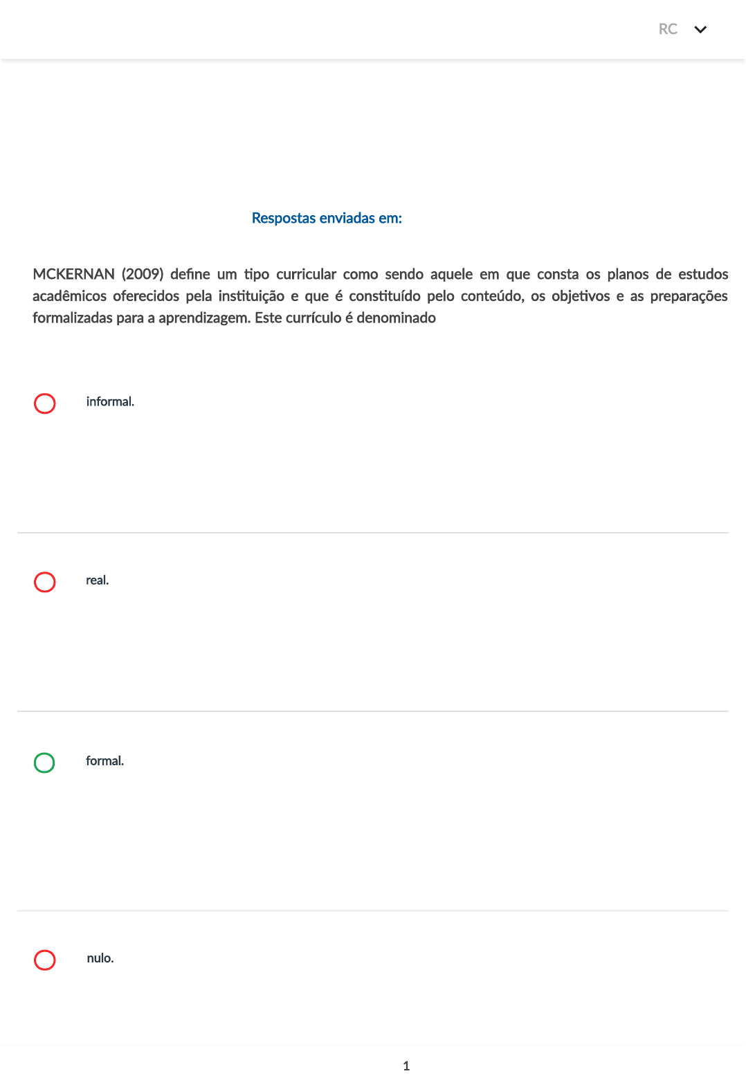 Exercícios Respostas enviadas em: 03/11/2021 16:23 1. MCKERNAN (2009) define um �po curricular como sendo aquele em que consta os planos de estudos acadêmicos oferecidos pela ins�tuição e que é cons�tuído pelo conteúdo, os obje�vos e as preparações formalizadas para a aprendizagem. Este currículo é denominado Resposta incorreta. A. informal. O currículo informal é composto pelas a�vidades extracurriculares que são organizadas ao redor do currículo formal. Resposta incorreta. B. real. Esse é o currículo que realmente é implementado e seguido e que pode não apresentar fidelidade no plano formal para o currículo. Você acertou! C. formal. É o currículo imposto pelo sistema de ensino, como as Leis de Diretrizes e Bases e Projetos Polí�cos Pedagógicos. Resposta incorreta. D. nulo. Esse é o currículo que as escolas não ensinam, mas que talvez seja tão importante quanto o currículo formal. São todas as manifestações em ambiente escolar; tudo aquilo que não está expresso formalmente no papel. 1 de 5 perguntas Anterior Próximo RC Resposta incorreta. E. oculto. É o currículo que está latente ou escondido, mas presente na cultura escolar. São todas as manifestações em ambiente escolar, as simbologias que formam o ambiente escolar. Próximo 1 de 5 perguntas Anterior Próximo RC Exercícios Respostas enviadas em: 03/11/2021 16:23 2. MCKERNAN (2009) aponta um currículo que se originou da ideia de currículo nuclear. Este currículo é denominado Você acertou! A. nacional. O currículo nacional nuclear comum foi adotado como uma ideia de se ter núcleo obrigatório de disciplinas comum em todas as ins�tuições escolares de determinados países, dando às autoridades centrais grande controle sobre a reforma do currículo e os exames. Resposta incorreta. B. informal. Pode se configurar como nuclear se for concebido unicamente na ideia de uma base curricular nacional comum, no entanto, este currículo vai além deste único �po, podendo ser proposta de ensino e o próprio projeto polí�co pedagógico. Resposta incorreta. C. oculto. Este �po de currículo não se encontra definido explicitamente numa proposta curricular. Resposta incorreta. D. aberto. A centralização desta proposta curricular é bastante visível. Cabe às escolas apenas a adaptação de um conjunto de obje�vos, conteúdos e procedimentos didá�cos já elencados à sua realidade. 2 de 5 perguntas Anterior Próximo RC Resposta incorreta. E. nulo. MCKERNAN (2009) cita Eisner (2002, p. 97) para definir o currículo nulo como o que possui uma dimensão importante que são os processos intelectuais que as escolas enfa�zam e então negligenciam sua implementação, e a disciplina que está ausente de um currículo formal. Voltar Próximo 2 de 5 perguntas Anterior Próximo RC Exercícios Respostas enviadas em: 03/11/2021 16:23 3. Aplle (2006) aponta um determinado �po de currículo como sendo o ensino tácito de normas, valores e inclinações aos alunos. E que este ensino permanece pelo simples fato de os alunos viverem e lidarem com as expecta�vas ins�tucionais e ro�nas das escolas todos os dias durante vários anos. Este �po de currículo é entendido como sendo o currículo: Resposta incorreta. A. nuclear. Este currículo é compreendido como a noção de uma série central de conhecimentos e áreas de experiência essenciais aos alunos que são equivalentes a um currículo nacional básico. Resposta incorreta. B. nacional. Oriundo da ideia de currículo nuclear a fim de se configurar uma base curricular nacional comum para todas as ins�tuições escolares de um país. Resposta incorreta. C. informal. Compreendido como as a�vidades extracurriculares que são organizadas ao redor do currículo formal como sociedades, clubes espor�vos e jogos. Resposta incorreta. D. formal. Compreendido como os planos de estudo acadêmicos oferecidos pela ins�tuição; o conteúdo, os obje�vos e as preparações formalizadas para a aprendizagem. 3 de 5 perguntas Anterior Próximo RC Você acertou! E. oculto. Compreendido por este autor como sendo o que aborda as normas e os valores que são implicitamente, mas eficazmente, ensinados nas escolas e sobre os quais o professor em geral não fala nas declarações de metas e obje�vos. Voltar Próximo 3 de 5 perguntas Anterior Próximo RC Exercícios Respostas enviadas em: 03/11/2021 16:23 4. MCKERNAN (2009) aponta três aspectos relacionados aos diversos �pos de currículos, um deles refere-se às transações ou às experiências que acontecem enquanto o currículo está sendo implementado. Este currículo é denominado: Resposta incorreta. A. aberto. É o currículo cuja seleção e a incorporação da tradição atuam no nível do conhecimento aberto, de maneira que determinados significados e prá�cas são enfa�zados (geralmente por um segmento da classe média),1 e outros são negligenciados, excluídos, diluídos. Você acertou! B. vivido. É o currículo idealizado pela prá�ca do professor, ou seja, o plano de ensino. Resposta incorreta. C. oculto. É o currículo mediado por meio de envolvimento, e não por ensino direto, e está impregnado na cultura da escola. Resposta incorreta. D. nulo. Currículo que as escolas não ensinam, mas que talvez seja tão importante quanto o currículo formal. 4 de 5 perguntas Anterior Próximo RC Resposta incorreta. E. nuclear. Currículo cuja ideia é a existência de um núcleo obrigatório para todas as ins�tuições escolares de um país. Voltar Próximo 4 de 5 perguntas Anterior Próximo RC Exercícios Respostas enviadas em: 03/11/2021 16:23 5. Apple (2006) afirma que pode-se aprender um pouco sobre a importância de um determinado �po de currículo a par�r da literatura sobre a socialização polí�ca. Para ele, fica claro que a aprendizagem incidental contribui mais para a socialização polí�ca de um aluno do que aulas de civismo ou outras formas de ensin
