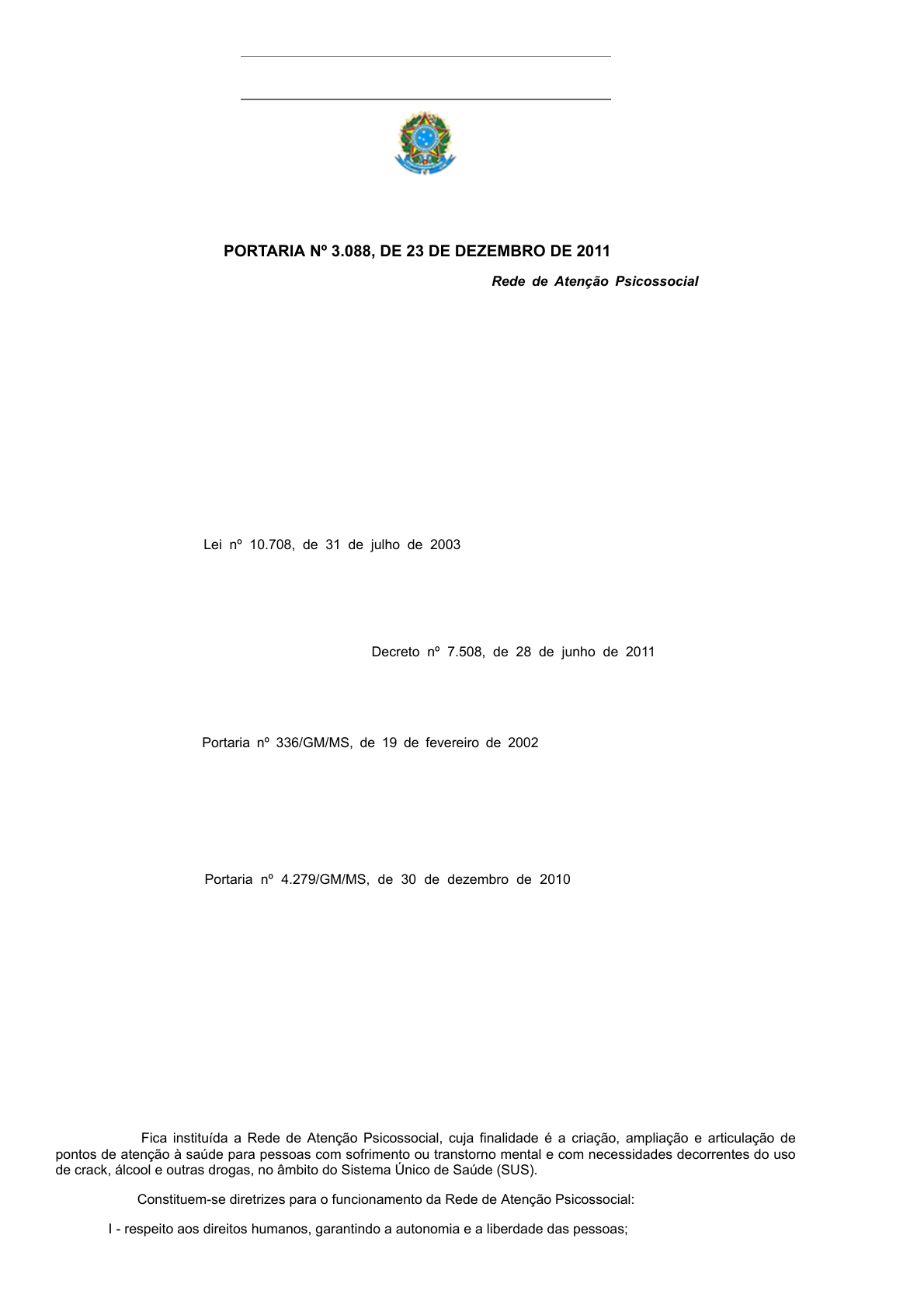 16/09/21, 19:59 Minist�rio da Sa�de https://bvsms.saude.gov.br/bvs/saudelegis/gm/2011/prt3088_23_12_2011_rep.html 1/9 ADVERTÊNCIA Este texto n�o substitui o publicado no Diário Oficial da União Minist�rio da Sa�de Gabinete do Ministro PORTARIA Nº 3.088, DE 23 DE DEZEMBRO DE 2011(*) Institui a Rede de Atenção Psicossocial para pessoas com sofrimento ou transtorno mental e com necessidades decorrentes do uso de crack, álcool e outras drogas, no âmbito do Sistema Único de Saúde (SUS). O MINISTRO DE ESTADO DA SAÚDE, no uso das atribuições que lhe conferem os incisos I e II do parágrafo único do art. 87 da Constituição, e Considerando a Lei nº 8.069, de 13 de julho de 1990, que dispõe sobre o Estatuto da Criança e do Adolescente e dá outras providências; Considerando as determinações da Lei nº 10.216, de 6 de abril de 2001, que dispõe sobre a proteção e os direitos das pessoas portadoras de transtornos mentais e redireciona o modelo assistencial em saúde mental; Considerando a Lei nº 10.708, de 31 de julho de 2003, que institui o auxílio-reabilitação psicossocial para pacientes acometidos de transtornos mentais egressos de internações; Considerando o Decreto nº 7.179, de 20 de maio de 2010, que institui o Plano Integrado de Enfrentamento ao Crack e outras Drogas; Considerando as disposições contidas no Decreto nº 7.508, de 28 de junho de 2011, que dispõe sobre a organização do Sistema Único de Saúde (SUS), o planejamento da saúde, a assistência à saúde e a articulação interfederativa; Considerando a Política Nacional a Atenção Integral a Usuários de Álcool e outras Drogas, de 2003; Considerando a Portaria nº 336/GM/MS, de 19 de fevereiro de 2002, que regulamenta o funcionamento dos Centros de Atenção Psicossocial (CAPS); Considerando a Portaria nº 816/GM/MS, de 30 de abril de 2002, que institui, no âmbito do SUS, o Programa Nacional de Atenção Comunitária Integrada a Usuários de Álcool e outras Drogas; Considerando as diretrizes previstas na Portaria nº 1.190/GM/MS, 4 de junho de 2009, que institui Plano Emergencial de ampliação do Acesso ao Tratamento e Prevenção em Álcool e outras Drogas (PEAD); Considerando a Portaria nº 4.279/GM/MS, de 30 de dezembro de 2010, que estabelece diretrizes para a organização da Rede de Atenção à Saúde no âmbito do SUS; Considerando a ?Portaria, nº 1.600/GM/MS, de 7 de julho de 2011, que reformula a Política Nacional de Atenção às Urgências e institui a Rede de Atenção às Urgências SUS; Considerando as recomendações contidas no Relatório Final da IV Conferência Nacional de Saúde Mental Intersetorial, realizada em 2010; Considerando a necessidade de que o SUS ofereça uma rede de serviços de saúde mental integrada, articulada e efetiva nos diferentes pontos de atenção para atender as pessoas com demandas decorrentes do consumo de álcool, crack e outras drogas; e Considerando a necessidade de ampliar e diversificar os serviços do SUS para a atenção às pessoas com necessidades decorrentes do consumo de álcool, crack e outras drogas e suas famílias, resolve: Art. 1º Fica instituída a Rede de Atenção Psicossocial, cuja finalidade é a criação, ampliação e articulação de pontos de atenção à saúde para pessoas com sofrimento ou transtorno mental e com necessidades decorrentes do uso de crack, álcool e outras drogas, no âmbito do Sistema Único de Saúde (SUS). Art. 2º Constituem-se diretrizes para o funcionamento da Rede de Atenção Psicossocial: I - respeito aos direitos humanos, garantindo a autonomia e a liberdade das pessoas; Maycon Pereira Realce Maycon Pereira Realce Maycon Pereira Realce Maycon Pereira Realce Maycon Pereira Realce Maycon Pereira Realce Maycon Pereira Realce Maycon Pereira Realce 16/09/21, 19:59 Minist�rio da Sa�de https://bvsms.saude.gov.br/bvs/saudelegis/gm/2011/prt3088_23_12_2011_rep.html 2/9 II - promoção da equidade, reconhecendo os determinantes sociais da saúde; III - combate a estigmas e preconceitos; IV - garantia do acesso e da qualidade dos serviços, ofertando cuidado integral e assistência multiprofissional, sob a lógica interdisciplinar; V - atenção humanizada e centrada nas necessidades das pessoas; VI - diversificação das estratégias de cuidado; VII - desenvolvimento de atividades no território, que favoreça a inclusão social com vistas à promoção de autonomia e ao exercício da cidadania; VIII - desenvolvimento de estratégias de Redução de Danos; IX - ênfase em serviços de base territorial e comunitária, com participação e controle social dos usuários e de seus familiares; X - organização dos serviços em rede de atenção à saúde regionalizada, com estabelecimento de ações intersetoriais para garantir a integralidade do cuidado; XI - promoção de estratégias de educação permanente; e XII - desenvolvimento da lógica do cuidado para pessoas com transtornos mentais e com necessidades decorrentes do uso de crack, álcool e outras drogas, tendo como eixo central a construção do projeto terapêutico singular. Art. 3º São objetivos gerais da Rede de Atenção Psicossocial: I - ampliar o acesso à atenção psicossocial da população em geral; II - promover o acesso das pessoas com transtornos mentais e com necessidades decorrentes do uso de crack, álcool e outras drogas e suas famílias aos pontos de atenção; e III - garantir a articulação e integração dos pontos de atenção das redes de saúde no território, qualificando o cuidado por meio do acolhimento, do acompanhamento contínuo e da atenção às urgências. Art. 4º São objetivos específicos da Rede de Atenção Psicossocial: I - promover cuidados em saúde especialmente para grupos mais vulneráveis (criança, adolescente, jovens, pessoas em situação de rua e populações indígenas); II - prevenir o consumo e a dependência de crack, álcool e outras drogas; III - reduzir danos provocados