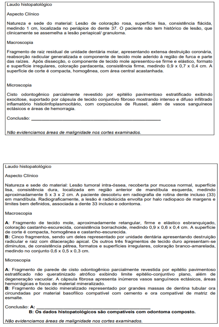 Laudo Aula 1 – Cisto e Granuloma Periapical Aluna: Barbara Albuquerque Azevedo Mat.: 20.2.000269 Turma: PE manhã 01. Conclusão: cisto periapical. 02. Conclusão A: cisto dentígero (laudo surpresa). 03. Conclusão A: granuloma periapical. Conclusão B: granuloma periapical.