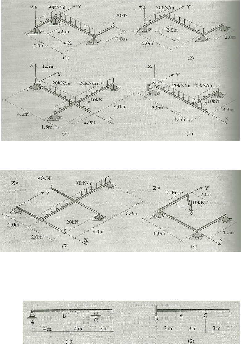 4ª Lista de exercícios de Análise Estrutural I 1. Trace os diagramas dos esforços seccionais para as grelhas representados na figura seguinte: 2. Idem para as grelhas da figura abaixo 3. Determine as linhas de influência das reações de apoio e dos esforços das seções A, B e C, indicadas nas vigas esquematizadas na próxima figura: 4. Para a estrutura a seguir, obter as envoltórias de momento fletor e esforço cortante, cotando-as nas seções indicadas: São dados: a) Carga permanente: g = 25kN/m b) Carga móvel: c) Estrutura 5. Para seção S da viga percorrida pelo trem tipo indicado (que pode se deslocar nos dois sentidos) obter Mmax: a) Carga móvel b) Estrutura