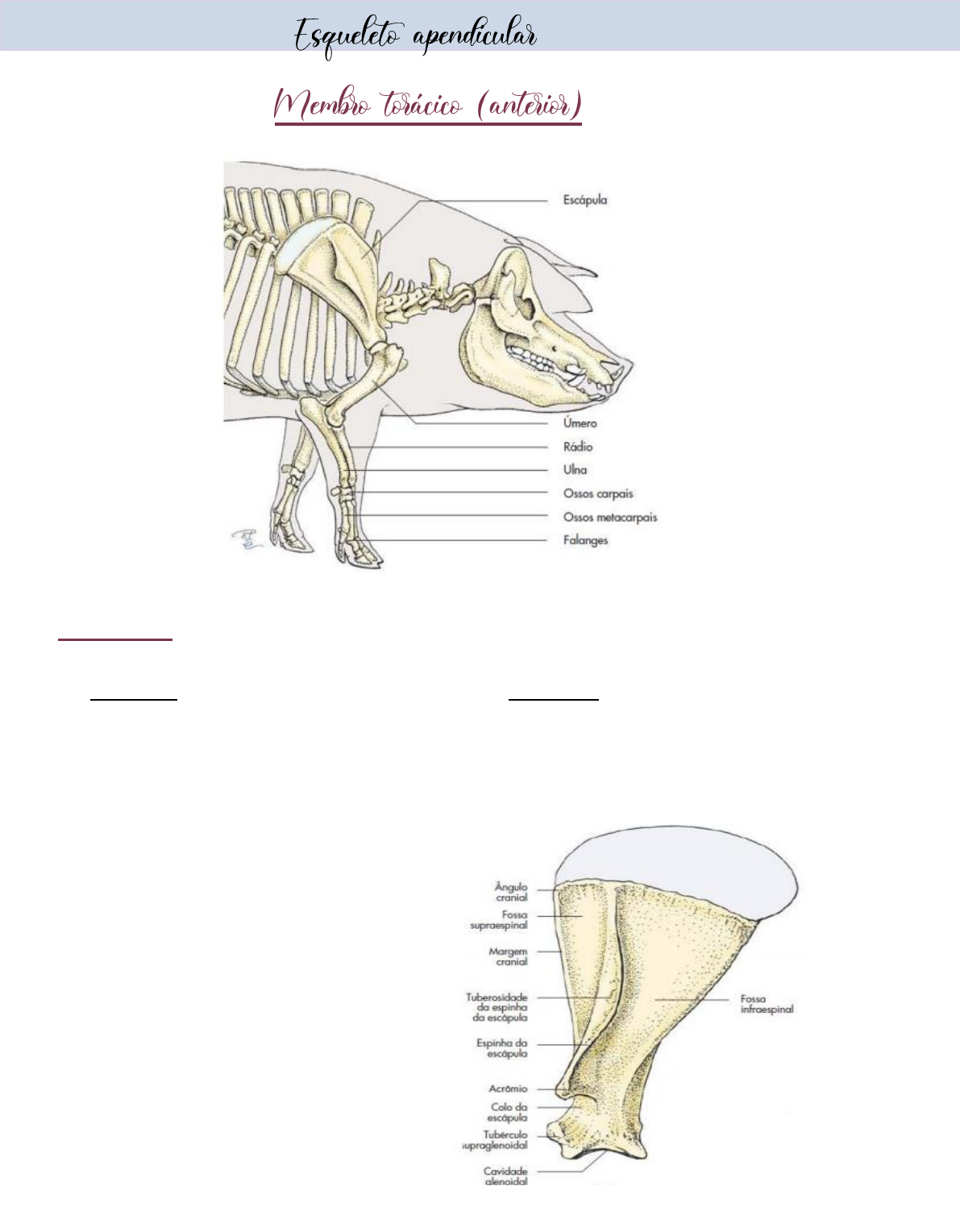 Thamyres Maria de Almeida Oliveira Escápula: 1. Vista lateral: 2. Vista medial: Fossa supra espinhal; Face serrata; Margem cranial: Fossa subescapular; Ângulo cranial; Processo coracóide; Fossa infra espinhal; Margem caudal; Ângulo caudal; Espinha da escápula; Túber da espinha da escápula; Acrômio (ruminantes e carnívoros); Tubérculo supra glenóide; Cavidade glenóide; Incisura glenóide; Colo da escápula; Thamyres Maria de Almeida Oliveira Úmero: 1. Vista caudal: Cabeça; Colo; Corpo; Fossa do olécrano; 2. Vista cranial: Tubérculo maior; Tubérculo menor; Sulco inter tubercular; Fossa radial; 3. Vista lateral: Tuberosidade deltoide; Crista; Sulco do músculo braquial; Epicôndilo lateral; 4. Vista medial: Tuberosidade redonda maior; Epicôndilo medial; Thamyres Maria de Almeida Oliveira Rádio e ulna: 1. Vista lateral: Corpo da ulna; Olécrano; Túber do olécrano; Processo ancôneo; Incisura troclear; Espaço inter ósseo ante braquial; Fóvea da cabeça do rádio; Circunferência articular; Tuberosidade radial; Colo do rádio; Corpo do rádio; Sulco para passagem do tendão extensor digital lateral; Sulco para passagem do tendão do músculo extensor digital comum; Sulco para passagem do tendão do músculo extensor carpo radial; Sulco para passagem do tendão do músculo extensor oblíquo do carpo; Face articular cárpica; Tróclea; Thamyres Maria de Almeida Oliveira Ossos do carpo (mão): Osso carporradial; Osso carpo intermédio; Osso carpoulnar; Osso carpo acessório; Osso cárpico II; Osso cárpico III; Osso cárpico IV: Osso metacárpico II; Osso metacárpico III; Osso metacárpico IV; Ossos sesamóides proximais; Falange proximal; Falange média; Osso sesamóide distal; Falange distal (margem solear, processo extensório, face articular, face solear, forame solear, linha semilunar, face flexora). Membros pélvicos (posterior) Thamyres Maria de Almeida Oliveira Coxal (quadril) Osso ílio; Osso púbis; Osso ilíaco; 1. Vista dorsal: Túber coxal; Túber sacral; Crista isquiática; Linha glútea; Asa do ílio; Corpo do ílio; Túber isquiático; Espinha isquiática; Incisura isquiática maior; Incusura isquiática menor; Arco isquiático; Sínfise pélvica; Forame obturado; 2. Vista ventral: Face sacropelvina; Face ilíaca; Face auricular; Tubérculo do músculo psoas menor; Eminencia ílio-púbica; Pécten do osso púbis; Tubérculo púbico; Acetábulo; Margem do acetábulo; Face lunata; Fossa do acetábulo; Sulco para o ligamento acessório do osso femoral (somente em equinos); Incisura do acetábulo; Thamyres Maria de Almeida Oliveira Fêmur: 1. Vista cranial: Cabeça; Colo; Corpo; Trocanter maior (parte caudal e parte cranial); Terceiro trocanter; Trocanter menor; Tróclea; 2. Vista caudal: Fossa trocantérica; Forame para artéria nutrícia; Fossa supra condilar; Fossa intercondilar; Côndilo lateral; Côndilo medial; Epicôndilo lateral; Epicôndilo medial; Thamyres Maria de Almeida Oliveira Tíbia: 1. Vista caudal: Côndilo lateral; Côndilo medial; Eminencia intercondilar; Incisura poplítea; Linhas do músculo poplíteo; Sulco maleolar; 2. Vista cranial: Sulco para passagem do ligamento patelar intermédio; Tuberosidade da tíbia; Sulco extensor; Maléolo medial; Maléolo lateral; Tarso e metatarso (pé): Calcâneo; Osso társico IV: Tálus; Osso tarso central; Osso társico III; 1. Vista medial: Osso társico I e II (fusionados); Osso metatársico II; Osso metatársico III; Osso metatársico IV; Ossos sesamóides proximais; Falange proximal; Falange média; Osso sesamóide distal; Falange distal;