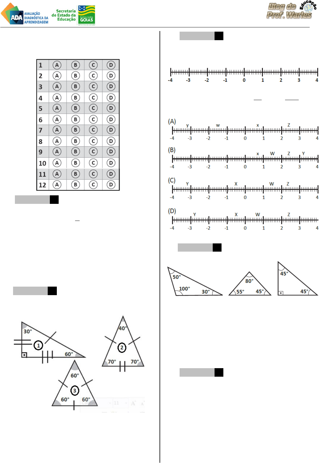 1ª Prova Diagnóstica – 2019 – 8º Ano SEDUCE-GO – Matemática ESCOLA: ________________________ Prof.:____________________________ Nome: ___________________________ D17 Questão 1 –––––––––––––––––––––––––––◊ Observe a seguinte fração. O número decimal correspondente a essa fração é (A) 1,6. (B) 1,25. (C) 0,625. (D) 0,435. D3 Questão 2 –––––––––––––––––––––––––––◊ Observe os triângulos 1, 2 e 3 a seguir, e classifique cada um deles de acordo com os lados. Os triângulos 1, 2 e 3 são, respectivamente, triângulos (A) escaleno, isósceles e equilátero. (B) escaleno, equilátero e isósceles. (C) isósceles, escaleno e equilátero. (D) equilátero, isósceles e escaleno. D17 Questão 3 –––––––––––––––––––––––––––◊ Observe a reta numérica a seguir, onde cada intervalo entre dois números inteiros foi dividido em dez intervalos de mesmo comprimento. Assinale a opção que apresenta a ordenação dos pontos X = 0,7; Y = - 3,2; e nessa reta. D3 Questão 4 –––––––––––––––––––––––––––◊ Observe os triângulos a seguir: De acordo com seus ângulos, o nome desses triângulos, respectivamente, é: (A) acutângulo, obtusângulo e retângulo. (B) obtusângulo, acutângulo e retângulo. (C) acutângulo, retângulo e obtusângulo. (D) obtusângulo, retângulo e acutângulo. D26 Questão 5 –––––––––––––––––––––––––––◊ Para fazer uma viagem, Alice abasteceu 25,5 litros de gasolina no tanque do carro. Sabendo que o litro de gasolina no dia custava R$ 4,96. O preço total pago por Alice foi um valor (A) menor do que R$ 125,30. (B) entre R$ 125,30 e R$ 127,45. (C) que corresponde ao quádruplo de R$ 25,50. (D) maior do que R$ 200. D26 Questão 6 –––––––––––––––––––––––––––◊ A tabela de numeração de aliança é definida conforme o quadro a seguir: Sabe-se que para determinar o número da aliança é necessário dividir o comprimento por 3,14; determinando, assim, o seu diâmetro. O tamanho da aliança cujo comprimento é igual a 61,23 milímetros é (A) 21. (B) 22. (C) 23. (D) 24. D3 Questão 7 –––––––––––––––––––––––––––◊ Observe as figuras seguintes: A figura cujas medidas dos ângulos internos satisfazem a condição de existência de um triângulo é o (A) triângulo 1. (B) triângulo 2. (C) triângulo 3. (D) triângulo 4. D4 Questão 8 –––––––––––––––––––––––––––◊ Leia as afirmações sobre quadriláteros a seguir. I – Um paralelogramo é um quadrilátero que possui apenas 2 lados paralelos. II – Todo paralelogramo é um quadrilátero que possui lados congruentes. III – Um paralelogramo não é um quadrilátero. IV – Um trapézio é um quadrilátero que possui dois lados opostos paralelos. A única alternativa correta corresponde ao algarismo romano (A) IV. (B) III. (C) II. (D) I. D17 Questão 9 –––––––––––––––––––––––––––◊ Observe a reta numérica a seguir: O número indicado pela seta é (A) 1,2. (B) 1,4. (C) 1,8. (D) 2,4. D26 Questão 10 –––––––––––––––––––––––––◊ Carlos é operário e seu salário é de R$ 960 por mês. Esse mês ele gastou com aluguel, com alimentação da sua família e com despesas extras com remédios. Depois de fazer os cálculos, Carlos percebeu que para quitar as despesas, o valor total de seu salário (A) Não foi o suficiente, faltando R$ 24. (B) Foi o suficiente e sobrou R$ 24. (C) Foi exatamente o valor da despesa. (D) Não foi o suficiente, faltando R$ 34. D4 Questão 11 –––––––––––––––––––––––––◊ São chamados de quadriláteros os polígonos que possuem quatro lados. Assinale a alternativa que apresenta o nome do quadrilátero que possui somente ângulos retos. (A) losango. (B) paralelogramo. (C) trapézio. (D) retângulo. D26 Questão 12 –––––––––––––––––––––––––◊ Para pagar a conta de sua família em uma lanchonete, Fernando levou uma nota de cem reais. Nesse dia, a família de Fernando consumiu 2 hambúrgueres cujo valor unitário era de R$ 18,90, uma batata grande cujo valor era de R$ 15,50 e três sucos cujo valor era de R$ 11,50 a unidade. Sobre a quantia do troco que ele recebeu, sabe-se que é um valor (A) suficiente para comprar outro hambúrguer. (B) suficiente para comprar outra batata. (C) suficiente para comprar outro suco. (D) inferior ao valor do suco. 3