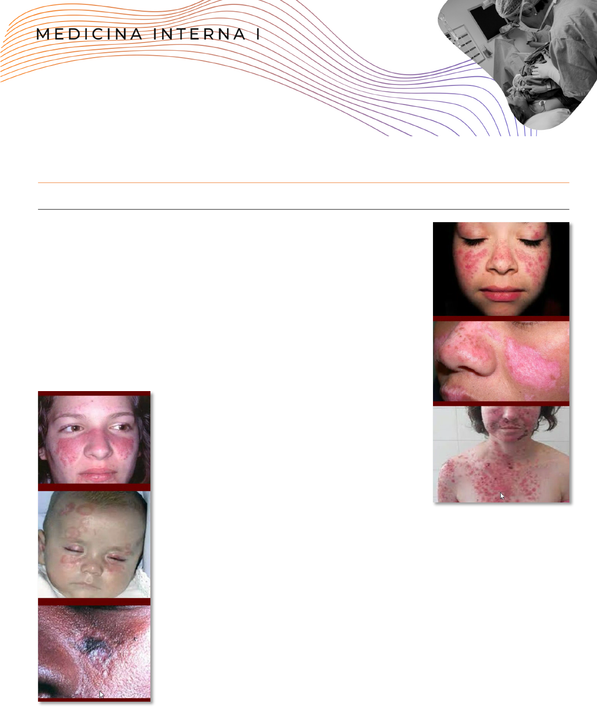 1 MANIFESTAÇÕES CUTÂNEAS DAS COLAGENOSES LUPUS ERITEMATOSO Doença autoimmune do tecido conectivo que afeta a pele e o Sistema vascular de forma localizada ou disseminada (acomete diversos órgãos) A pele é acometida em cerca de 85% dos casos, usualmente em áreas expostas à radiação solar UV (RUV), que é responsável pela indução e agravamento das lesões. O acometimento cutâneo pode ser exclusivo, mas também pode haver envolvimento multissistêmico (pulmonar, cardíaco, renal, neurológico, articular), com sintomas gerais, além de alterações imunopatologicas com presença de autoanticorpos circulantes de diferentes especificidades e imunocomplexos, durante os periodos de atividade inflamatória. A doença sistêmica (LES) é mais comum entre mulheres jovens (de 20 a 40 anos) mas pode afetar crianças e neonatos – em raras ocasiões, os anticorpos maternos atravessam a placenta e podem ocasionar síndromes neonatais associadas aos anticorpos anti-Ro; enquanto a forma cutânea exclusiva – lúpus eritamatoso discoide (LED), é mais comum entre mulheres a partir dos 40 anos, sendo muito rara na infância. Há ainda quadros semelhantes ao lúpus eritematoso induzidos por fármacos, e doenças mistas do tecido conjuntivo, em que os sintomas de lúpus estão associados a manifestações de esclerodermia e/ou polimiosite. 2 As lesões cutâneas do lúpus eritematoso podem ser especificas ou inespecíficas. As especificas permitem considerar três quadros clínicos cutâneos, que podem evoluir com ou sem comprometimento sistêmico: Þ Lúpus eritematoso cutâneo crônico (LECC) Þ Lúpus eritematoso cutâneo subagudo (LECSA) Þ Lúpus eritematoso cutâneo agudo (LECA) As lesões não especificas encontradas no LE compreendem fotossensibilidade, ulceras orais, alopecia, urticaria, urticaria vasculite, lesões vesicobolhosas, alterações acrais, mucinose e calcinose cutânea. Obs: A fotossensibilidade não é exclusiva do lúpus. Lupus eritematoso cutâneo crônico (LECC) ou discoide (LED) Constitui a variante clinica mais comum da doença, mais frequente em mulheres acima dos 40 anos. As lesões cutâneas são desencadeadas ou agravadas pela exposição à radiação ultravioleta, frio ou drogas e exibem evolução crônica e insidiosa. As lesões discoides são hiperestésicas, e caracterizam-se por placas arredondadas eritematosas, violáceas ou hiperpigmentares, com atrofia central e descamação e com espiculas córneas aderidas, sempre localizadas em áreas de fotoexposição da face, especialmente as regiões malares e o dorso do nariz, pavilhões auriculares, couro cabeludo, lábios, mucosas. Com menor frequência, surgem no V do decote, nos antebraços e nas mãos, especialmente em quadros disseminados. O comprometimento do couro cabeludo gera áreas de alopecia cicatricial, com discrimias e teleangiectasias. Em alguns quadros pode ocorrer acromia. 3 Obs: as espículas córneas fazer o diagnostico diferencial (como na primeira imagem). Na ultima imagem, há lúpus comedônico, que se assemelha a um nevo comedônico. O LEC pode desenvolver formas: Þ Verrucosas (LECC hipertrófico): acentuação do componente queratótico com maior evidencia dos óstios foliculares e aparecimento de lesões hipertróficas e verrucosas – em 50% dos casos, cursa com comprometimento sistêmico. Deve ser diferenciado de outras dermatoses verrucosas, inclusive do carcinoma espinocelular, que pode surgir em lesões crônicas de LED. Þ Subcutâneas (LE profundo, ou paniculite lúpica): são nódulos subcutâneos firmes, de limites nítidos, pouco dolorosos, que ao regredirem, deixam cicatrizes deprimidas e são encimados ou não por lesões do tipo discoides, localizadas na face, no dorso, nos membros superiores e nas nadegas. Þ Mucosas (LE oral ou conjuntival). Þ Túmidas (LE túmido): as lesões discoides podem exibir infiltração, sem a característica de atrofia e descamação, constituindo o quadro clinico de lúpus eritematoso túmido, que deve ser diferenciado da erupção polimorfa à luz e do pseudolinfoma. Doentes com LED, pela exposição prolongada ao frio, podem apresentar acrocianose e lesões papulonodulares acharadas, eritêmato-violáceas nas mãos, no nariz e na orelha. Constitui o quadro clinico de perniose lúpica, que deve ser diferenciado do liquen plano, da sarcoidose e do eritema pérnio. Nas formas localizadas de LED, em que as lesões são restritas ao segmento cefálico, os sintomas gerais são raros. Nas formas disseminadas, pode haver febre, adinamia, cefaleia, e artralgias; a persistência dos sintomas sugere transição para a forma sistêmica da doença. 4 Obs: Pode haver permioses lúpidas. A doença pode aparecer até dos dedos dos pés. Diagnósticos diferenciais do LED Pode ser diferenciado da rosácea pela limitação da área de eritema e pelo aspecto escamoso e atrófico. Da psoríase e da dermatite seborreica pelas escamadas aderidas e pelo ponteado córneo; da queratose solar pelo eritema, pelo menor grau de queratose. As lesões atrófico-cicatriciais do couro cabeludo devem ser distinguidas de outras formas de alopecias cicatriciais. Também deve-se descartar a erupção polimorfa à luz, infiltração linfocitária de Jessner, o pseudolinfoma, e a dermatite por corticosteroides fluorados. O diagnostico da lesão cutânea é obtido pelo exame histológico, que caracteriza-se por hiperqueratose, rolhas córneas foliculares, liquefação da camada basal; e pela imunofluorescência direta da lesão, em que observa-se deposito de IgG, IgM, IgA, e C3 na juncao dermoepidermica. Geralmente é negativa na pele não lesada. Na histologia, pode encontrar hiperqueratose, rolhas córneas foliculares, liquefação da camada basal e infiltrado de células mononucleares perivascular e perianexial superficial e profundo. A membrana basal da epiderme, da parede folicular, e anexos encontram-se espessados, podendo ser mais bem evidenciados pela reação do PAS.