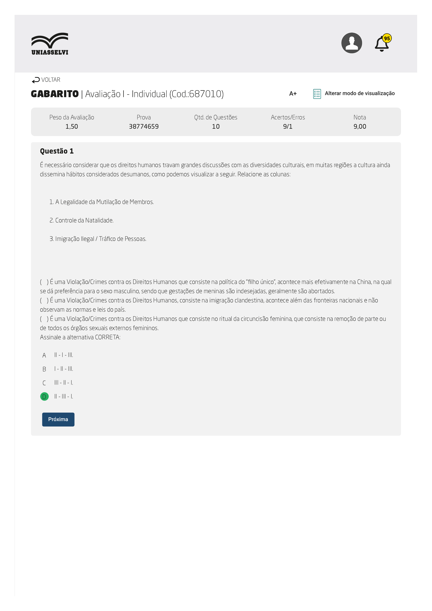 17/10/2021 14:42 AVA https://ava2.uniasselvi.com.br/subject/grades-and-tests/answer-book/eyJ0ZXN0Ijp7InRlc3RDb2RlIjoiNjg3MDEwIiwiZGVzY3JpcHRpb24iOiJBdmFsaWHDp8OjbyBJIC0gSW5kaXZpZHVhbCIsInBhcmFtZXRlciI6NTQ1L… 1/1 GABARITO | Avaliação I - Individual (Cod.:687010) Peso da Avaliação 1,50 Prova 38774659 Qtd. de Questões 10 Acertos/Erros 9/1 Nota 9,00 Questão 1 É necessário considerar que os direitos humanos travam grandes discussões com as diversidades culturais, em muitas regiões a cultura ainda dissemina hábitos considerados desumanos, como podemos visualizar a seguir. Relacione as colunas: 1. A Legalidade da Mutilação de Membros. 2. Controle da Natalidade. 3. Imigração Ilegal / Tráfico de Pessoas. ( ) É uma Violação/Crimes contra os Direitos Humanos que consiste na política do “filho único”, acontece mais efetivamente na China, na qual se dá preferência para o sexo masculino, sendo que gestações de meninas são indesejadas, geralmente são abortados. ( ) É uma Violação/Crimes contra os Direitos Humanos, consiste na imigração clandestina, acontece além das fronteiras nacionais e não observam as normas e leis do país. ( ) É uma Violação/Crimes contra os Direitos Humanos que consiste no ritual da circuncisão feminina, que consiste na remoção de parte ou de todos os órgãos sexuais externos femininos. Assinale a alternativa CORRETA: A II - I - III. B I - II - III. C III - II - I. D II - III - I. VOLTAR A+ Alterar modo de visualização Próxima 95 17/10/2021 14:42 AVA https://ava2.uniasselvi.com.br/subject/grades-and-tests/answer-book/eyJ0ZXN0Ijp7InRlc3RDb2RlIjoiNjg3MDEwIiwiZGVzY3JpcHRpb24iOiJBdmFsaWHDp8OjbyBJIC0gSW5kaXZpZHVhbCIsInBhcmFtZXRlciI6NTQ1L… 1/1 GABARITO | Avaliação I - Individual (Cod.:687010) Peso da Avaliação 1,50 Prova 38774659 Qtd. de Questões 10 Acertos/Erros 9/1 Nota 9,00 Questão 2 Outra grande conquista para os direitos humanos foi a criação de mecanismos específicos destinados à promoção, defesa, reparação e monitoramento. Quais são esses mecanismos? A Estatuto da pessoa com deficiência; Conselho Tutelar; Conselho do Idoso; Estatuto da Criança e Adolescente. B Juizados Especiais Civis e Criminais; Secretarias de Direitos Humanos; Conselhos de Direitos Humanos; Comissões de Direitos Humanos. C Estatuto da Criança e do Adolescente; Estatuto do Idoso; Estatuto da Pessoa com Deficiência; Lei de Defesa do Consumidor, entre outros. D Juizados Especiais Civis e Criminais; Secretarias de Direitos Humanos; Conselhos de Direitos Humanos; Lei de Defesa do Consumidor, entre outros. VOLTAR A+ Alterar modo de visualização Anterior Próxima 95 17/10/2021 14:42 AVA https://ava2.uniasselvi.com.br/subject/grades-and-tests/answer-book/eyJ0ZXN0Ijp7InRlc3RDb2RlIjoiNjg3MDEwIiwiZGVzY3JpcHRpb24iOiJBdmFsaWHDp8OjbyBJIC0gSW5kaXZpZHVhbCIsInBhcmFtZXRlciI6NTQ1L… 1/1 GABARITO | Avaliação I - Individual (Cod.:687010) Peso da Avaliação 1,50 Prova 38774659 Qtd. de Questões 10 Acertos/Erros 9/1 Nota 9,00 Questão 3 Os direitos humanos são normas que reconhecem e protegem a dignidade de todos os seres humanos. Os direitos humanos regem o modo como os seres humanos individualmente vivem em sociedade e entre si, bem como sua relação com o Estado e as obrigações que o Estado tem em relação a eles. Sobre quais documentos não apresentam direitos humanos, assinale a alternativa CORRETA: A Tratado de Tordesilhas. B A Petição de Direito. C Carta Magna. D Constituição dos Estados Unidos. VOLTAR A+ Alterar modo de visualização Anterior Próxima 95 17/10/2021 14:42 AVA https://ava2.uniasselvi.com.br/subject/grades-and-tests/answer-book/eyJ0ZXN0Ijp7InRlc3RDb2RlIjoiNjg3MDEwIiwiZGVzY3JpcHRpb24iOiJBdmFsaWHDp8OjbyBJIC0gSW5kaXZpZHVhbCIsInBhcmFtZXRlciI6NTQ1L… 1/1 GABARITO | Avaliação I - Individual (Cod.:687010) Peso da Avaliação 1,50 Prova 38774659 Qtd. de Questões 10 Acertos/Erros 9/1 Nota 9,00 Questão 4 A Guerra dos Farrapos ou Revolução Farroupilha foi a mais longa rebelião do período regencial do Brasil. Ocorreu no Rio Grande do Sul e durou dez anos, de 1835 até 1845, época que compreende a regência de Feijó e o Segundo Reinado. O termo “farrapo” se referia aos trajes maltrapilhos que o exército rebelde usava. Sobre a Revolta Farroupilha, assinale a alternativa CORRETA: A Esta revolta foi comandada pelos ricos da época, pela classe que dominava a sociedade gaúcha, a classe dominante liderada pelos fazendeiros ricos se aproveitou dos pobres da época para escudo da revolução. B Neste período de 1896 a 1897 houve o conflito que com a participação da população e o exército da República, teve como fator preponderante causas sociais e religiosas, período da queda na Monarquia e a implantação da República. C Teve a participação principal da população, na Província do Grão-Pará, no Norte do Brasil, Esta revolta teve esse nome por ter sido formada pelos pobres que residiam em cabanas próximas dos rios da região. D Esta rebelião se deu por motivo de descontentamento das atitudes do governo da época, que aumentava os preços de algumas mercadorias, isso causava grande descontentamento na população, dando origem a um grupo. VOLTAR A+ Alterar modo de visualização Anterior Próxima 95 17/10/2021 14:42 AVA https://ava2.uniasselvi.com.br/subject/grades-and-tests/answer-book/eyJ0ZXN0Ijp7InRlc3RDb2RlIjoiNjg3MDEwIiwiZGVzY3JpcHRpb24iOiJBdmFsaWHDp8OjbyBJIC0gSW5kaXZpZHVhbCIsInBhcmFtZXRlciI6NTQ1L… 1/1 GABARITO | Avaliação I - Individual (Cod.:687010) Peso da Avaliação 1,50 Prova 38774659 Qtd. de Questões 10 Acertos/Erros 9/1 Nota 9,00 Questão 5 A Carta Magna de 1215 também ficou conhecida como a “Grande Carta”, foi assinada pelo rei da Inglaterra. Essa carta regulamentava algumas situações administrativas da época, que mais tarde foram denominadas de direitos humanos. A Carta Magna foi reconhecida como um dos documentos legais mais importantes no desenvolvimento da democracia moderna, um p