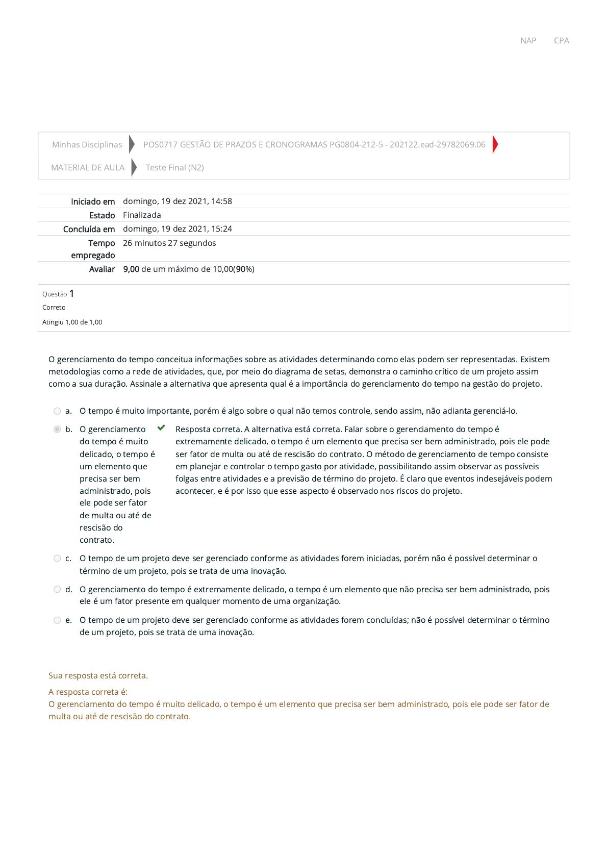 19/12/2021 15:25 Teste Final (N2): Revisão da tentativa https://ambienteacademico.com.br/mod/quiz/review.php?attempt=3412&cmid=3916 1/8 Minhas Disciplinas POS0717 GESTÃO DE PRAZOS E CRONOGRAMAS PG0804-212-5 - 202122.ead-29782069.06 MATERIAL DE AULA Teste Final (N2) Iniciado em domingo, 19 dez 2021, 14:58 Estado Finalizada Concluída em domingo, 19 dez 2021, 15:24 Tempo empregado 26 minutos 27 segundos Avaliar 9,00 de um máximo de 10,00(90%) Questão 1 Correto Atingiu 1,00 de 1,00 O gerenciamento do tempo conceitua informações sobre as atividades determinando como elas podem ser representadas. Existem metodologias como a rede de atividades, que, por meio do diagrama de setas, demonstra o caminho crítico de um projeto assim como a sua duração. Assinale a alternativa que apresenta qual é a importância do gerenciamento do tempo na gestão do projeto. a. O tempo é muito importante, porém é algo sobre o qual não temos controle, sendo assim, não adianta gerenciá-lo. b. O gerenciamento do tempo é muito delicado, o tempo é um elemento que precisa ser bem administrado, pois ele pode ser fator de multa ou até de rescisão do contrato. Resposta correta. A alternativa está correta. Falar sobre o gerenciamento do tempo é extremamente delicado, o tempo é um elemento que precisa ser bem administrado, pois ele pode ser fator de multa ou até de rescisão do contrato. O método de gerenciamento de tempo consiste em planejar e controlar o tempo gasto por atividade, possibilitando assim observar as possíveis folgas entre atividades e a previsão de término do projeto. É claro que eventos indesejáveis podem acontecer, e é por isso que esse aspecto é observado nos riscos do projeto. c. O tempo de um projeto deve ser gerenciado conforme as atividades forem iniciadas, porém não é possível determinar o término de um projeto, pois se trata de uma inovação. d. O gerenciamento do tempo é extremamente delicado, o tempo é um elemento que não precisa ser bem administrado, pois ele é um fator presente em qualquer momento de uma organização. e. O tempo de um projeto deve ser gerenciado conforme as atividades forem concluídas; não é possível determinar o término de um projeto, pois se trata de uma inovação. Sua resposta está correta. A resposta correta é: O gerenciamento do tempo é muito delicado, o tempo é um elemento que precisa ser bem administrado, pois ele pode ser fator de multa ou até de rescisão do contrato. NAP CPA https://ambienteacademico.com.br/my/ https://ambienteacademico.com.br/course/view.php?id=178 https://ambienteacademico.com.br/course/view.php?id=178§ion=2 https://ambienteacademico.com.br/mod/quiz/view.php?id=3916 https://codely-fmu-content.s3.amazonaws.com/Moodle/NAP/inicial/nap/fmu/index.html https://codely-fmu-content.s3.amazonaws.com/Moodle/CPA/landing_CPA/index.html 19/12/2021 15:25 Teste Final (N2): Revisão da tentativa https://ambienteacademico.com.br/mod/quiz/review.php?attempt=3412&cmid=3916 2/8 Questão 2 Correto Atingiu 1,00 de 1,00 O grá�co apresentado tem o objetivo de demonstrar a relação entre o tempo e o nível de atividade de cada fase do projeto. A fase da execução exige o maior nível de atividade, enquanto o planejamento tem um nível de atividade menor que a execução, porém maior que o controle. Esta é uma importante fase que acontece durante todo tempo do projeto. Analise o grá�co a seguir: Fonte: Adaptado de Menezes (2018). MENEZES, L. C. de M. Gestão de projetos. São Paulo: Atlas, 2018. Baseado na numeração de cada ciclo, assinale a alternativa correta. a. O ciclo 3 é o planejamento, o 4 a execução e o 5 é o fechamento. b. O ciclo 2 é o planejamento, o 3 é a execução e o 4 é o controle. Resposta correta. A alternativa está correta, pois cabe a observação sobre a fase de controle que apesar do nível baixo de atividade aparece a todo tempo no projeto. A fase da execução estabelece o mais elevado nível e é aquela que permeia por mais tempo no projeto. O planejamento apresenta um nível de atividades inferior que a execução, porém superior a fase de controle. c. O ciclo 1 é a execução, o 2 é o controle e 3 é o fechamento. d. O ciclo 2 é a execução, o 3 é controle e 5 é o fechamento. e. O ciclo 1 é a execução, o 3 é controle e 4 é o fechamento. Sua resposta está correta. A resposta correta é: O ciclo 2 é o planejamento, o 3 é a execução e o 4 é o controle. NAP CPA https://codely-fmu-content.s3.amazonaws.com/Moodle/NAP/inicial/nap/fmu/index.html https://codely-fmu-content.s3.amazonaws.com/Moodle/CPA/landing_CPA/index.html 19/12/2021 15:25 Teste Final (N2): Revisão da tentativa https://ambienteacademico.com.br/mod/quiz/review.php?attempt=3412&cmid=3916 3/8 Questão 3 Correto Atingiu 1,00 de 1,00 Questão 4 Incorreto Atingiu 0,00 de 1,00 O termo de abertura de um projeto é o documento em que se encontram os objetivos gerais e a descrição dos produtos do projeto, observando como as atividades serão realizadas, fatores estes importantes para entender as exigências das partes interessadas. Assinale a alternativa que apresente a �nalidade do project charter: a. Tem como objetivo marcar a informalidade do início do projeto e é realizado na fase de planejamento do projeto b. Tem como �nalidade fazer com que os interessados no projeto re�itam sobre questões como o objetivo, prazo, a equipe básica, o orçamento, restrições e premissas. Resposta correta. A alternativa está correta. O termo de abertura do projeto é um documento formal, tipicamente curto, que descreve o seu projeto na íntegra - incluindo quais são os objetivos, como será realizado e quais são as partes interessadas. É um ingrediente crucial no planejamento, porque é usado durante todo o ciclo de vida do projeto. c. Tem como �nalidade apresentar o objetivo, escopo, orçamento estimado e a expectativa da administração d. Tem como �nalidade fazer com que todos os interessados no projeto 