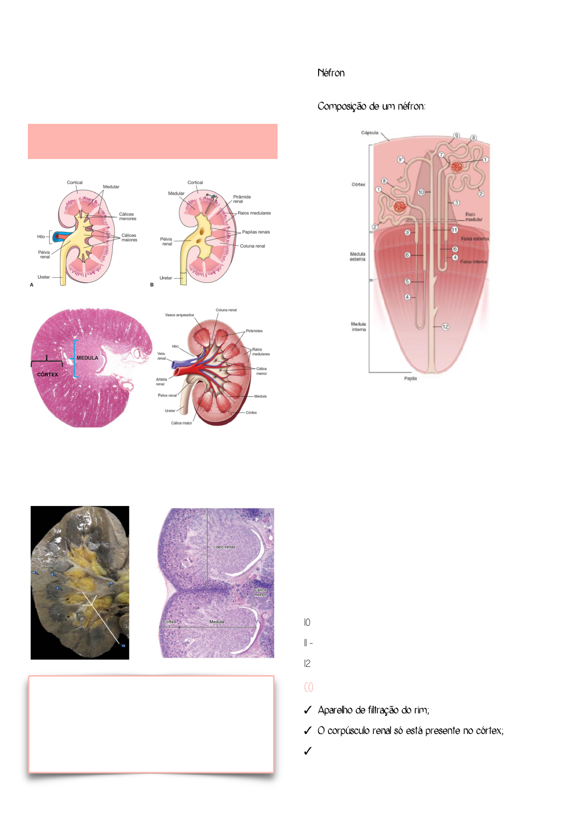 Universidade Nove de Julho Maria Lívia Histologia Renal Organização Geral do Rim: Lobos renais: ✓ O número de lobos em um rim é igual ao número de pirâmides medulares. Organização geral do néfron: ✓ Néfron - unidade funcional do rim, localizado na porção cortical e medular; ✓ Composição de um néfron: 1 - corpúsculo renal, incluindo o glomérulo e a cápsula de Bowman; 2 - túbulo contorcido proximal; 3 - túbulo reto proximal; 4 - ramo delgado descendente; 5 - ramo delgado ascendente; 6 - ramo ascendente espesso (túbulo renal distal); 7 - mácula densa localizada na porção final do túbulo renal distal; 8 - túbulo contorcido distal; 9 - túbulo conector -> do néfron justamedular que forma um arco (túbulo conector arqueado); 10 - ducto coletor cortical; 11 - ducto coletor medular externo; 12 - ducto coletor medular interno. Corpúsculo renal: ✓ Aparelho de filtração do rim; ✓ O corpúsculo renal só está presente no córtex; ✓ Porção dilatada do néfron - composta por capsula + glomérulo (grupo de capilares fenestrados); • Entrada por arteríola aferente e saída por eferente. A região medular é muito mais osmótica -> maior concentração de ureia e sódio comparado ao córtex isso ajuda a conduzir o filtrado medular. Universidade Nove de Julho Maria Lívia ✓ O corpúsculo renal contém o aparelho de filtração do rim, que consiste no endotélio glomerular, na membrana basal glomerular subjacente e na camada visceral da cápsula de Bowman; ✓ Cápsula de Bowman - formada por 2 folhetos: • Parietal - epitélio simples pavimentoso; • Visceral - células modificaras (podócitos). ✓ Espaço Urinário ou de Bowman - região entre os dois folhetos. ✓ Pedicelos: • Folheto visceral da cápsula do néfron; • “Pés” que se originam a partir dos prolongamentos secundários dos podócitos; • Entre os pedicelos se formam fendas de filtração glomerular. Componentes histológicos da filtração glomerular: ✓ Substâncias passam pelas lâminas basais e pelos podócitos e vão até o espaço glomerular —> filtração glomerular; ✓ Algumas proteínas (alto peso molecular) e hemácias não conseguem atravessar essa barreira física; ✓ Barreira de Filtração Glomerular - capilar + membrana basal + podócitos. Dois fatores definem se uma molécula vai ou não passar pela barreira de filtração glomerular - o tamanho e sua carga eletrolítica; Quanto menor e mais positiva, mais fácil sua passagem - glicose. Existem proteínas entre os pedicelos, na fenda de filtração, que são responsáveis por conferir carga negativa a região glomerular. Universidade Nove de Julho Maria Lívia Células mesangiais: ✓ Funções: • Possuem receptor de angiotensina II e agem como células contráteis dos capilares glomerulares e aumento PA; • Possuem receptor de hormônio natriurétco (células musculares do átrio do coração) e relaxam os capilares glomerulares; • Sustentam os capilares glomerulares; fagocita substâncias e complexos antígeno-anticorpo; • Produz endotelina - contração das artérias aferente e eferente. Hiologia Tuubular: Função geral dos túbulos renais: ✓ Certas substâncias contidas no ultrafiltrado são reabsorvidas, algumas parcialmente (água, sódio e bicarbonato) e outras inteiramente (glicose); ✓ Outras substâncias (creatinina e ácidos e bases orgânicos) são adicionadas no ultrafiltrado (urina primária) pela atividade secretora das células tubulares. Túbulo contorcido proximal: ✓ Constitui o local inicial e principal de reabsorção; ✓ Principais Características: • Complexo juncional; • Pregas ou dobras localizadas nas superfícies laterais das células - orla em escova; • Extensas interdigitações dos prolongamentos basais das células adjacentes - bomba de sódio; • Mitocôndrias - produção de ATP —> alta reabsorção. Universidade Nove de Julho Maria Lívia Alça de Henê - ramos delgados: ✓ Segmento Delgado Descendente - permeável à água; ✓ Segmento Ascendente Inteiro - impermeável à água; ✓ Segmento Espesso Ascendente - NaCl é transportado ativamente para fora da alça (25% de reabsorção), a fim de estabelecer o gradiente medular; • Local de ação dos diuréticos de alça - tratamento de edema Túbulo contorcido distal: ✓ Existe uma troca iônica, desde que haja quantidade suficiente de aldosterona circulante; ✓ Secreta íons de hidrogênio e amônia para a urina - atividade essencial para o equilíbrio ácido-base do sangue; ✓ Aparelho Justaglomerular: • Células justaglomerulares (glanulares) + mácula densa; • Um dos componentes do mecanismo de feedback túbulo-glomerular envolvido na auto-regulação do fluxo sanguíneo renal e da filtração glomerular; • Próximo a arteríola aferente - polo vascular; • Células Justaglomerulares - secretam renina; • A mácula densa é sensível a mudanças na concentração de NaCl e afeta a liberação de renina pelas células JG; • A renina é secretada quando a [NaCl] ou a pressão sanguínea caem. Túbulo coletor e ducto coletor: ✓ Não fazem parte da estrutura do néfron; Tip de Néfrons: Néfrons Corticais - seus corpúsculos renais localizados na porção externa do córtex. Apresentam alça de Henle curtas; Néfrons Justamedulares - corpúsculos reais situam-se próximo à base de uma pirâmide medular. Contém alças de Henle longas. Essas características estruturais são essenciais para o mecanismo de concentração da urina. Universidade Nove de Julho Maria Lívia ✓ Recolhem o produto final do metabolismo dos néfrons; ✓ Os tubos e ductos se unem na zona medular, formando tubos mais calibrosos Interstício renal: ✓ Células Intersticiais - produz eritropoetina; • Estimula produção de hemácias. Circulação sanguínea: ✓ As veias estreladas próximas da cápsula drenam para a rede capsular, enquanto o plexo cortical peritubular drena tanto para as veias interlobulares qu