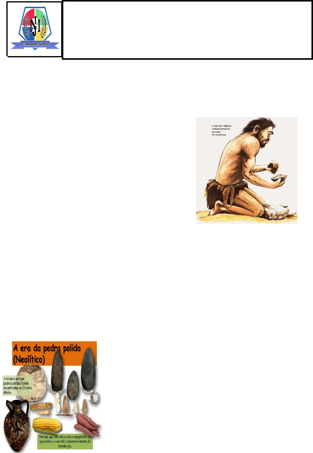 ECI EEM MONSENHOR JOSÉ BORGES – SÃO SEBASTIÃO DE LAGOA DE ROÇA-PB DISCIPLINA: História PROFESSOR (A): Maria Gorete Serie: 1º TURMA:__________ TURNO:________ DATA: 16/04/2021 ALUNO (A):______________________________________________________ 4ª atividade de História 1º Bimestre Período Paleolítico ou Idade da Pedra Lascada *Período com maior extensão da Pré-História; *Surgiu a 4,4 milhões de anos até 8000 a.C.; *Homens viviam em bandos, caçavam, pescavam e coletavam frutos, raízes e ovos; *Homens possuíam característica nômade, se abrigavam em cavernas e construíam casas com galhos de árvores e outros materiais; *Osso, madeira, lascas de pedra e marfim eram alguns dos materiais utilizados para a fabricação de ferramentas, como machados, facas e instrumentos pontiagudos, cortantes; *Domínio do fogo a partir de 500 mil anos; *Em 30000 a.C, o Homo sapiens especializou-se na caça e na pesca, criando ferramentas como o arco e a flecha, além de desenvolver a arte da pintura. Período Neolítico ou Idade da Pedra Polida *Houve mudanças climáticas e na vegetação; *A caça passou a ser dificultada e então passaram a viver nas margens dos rios aprimorando as habilidades da agricultura, por meio da plantação do trigo, cevada e aveia; *Domesticação de animais e criação de gado; *Início da aglomeração de população no intuito de ter mais proteção; *Aprimoramento de habilidades, como a criação de ferramentas mais acabadas, com polimento; *Desenvolvimento da cerâmica, fiação e tecelagem; *Surgiram os primeiros trabalhos com metais pouco duros; *Houve uma organização social, chamada comunidade primitiva, que era composta por pessoas que tinham laços sanguíneos, idiomas e costumes semelhantes; *Ao final do período houve uma desintegração do sistema de comunidade primitiva e surgiram os Estados que se dividiam em diferentes camadas sociais. Idade dos Metais -Desenvolvimento das habilidades de fundição de metais; -Primeiro metal fundido foi o cobre e depois o estanho, que juntos formaram o bronze, que era mais duro e resistente, possibilitando a fabricação de espadas, lanças e outros instrumentos melhores; -Supremacia dos povos que especializaram as suas habilidades. https://beduka.com/blog//historia-/textos-sobre-a-pre-historia/ Após a leitura dos textos responda as questões: 1-Complete o parágrafo abaixo, com informações corretas: *A Pré-História se divide em dois períodos marcantes: Idade da __________________________ e Idade dos___________________________. A Idade da Pedra onde surgiram os primeiros hominídeos, também é separado em _________________ ou Pedra Lascada e neolítico ou ____________________________. Na Idade dos ______________________, o surgimento da escrita, foi o acontecimento marcante. 2- A qual período ou idade, está relacionada cada uma destas afirmativas abaixo? A) Surgiram os primeiros trabalhos com metais pouco duros. ____________________________________________________________________________________ B) Período com maior extensão da Pré-História. ____________________________________________________________________________________ C) Início da aglomeração de população no intuito de ter mais proteção. _____________________________________________________________________________________ D) Supremacia dos povos que especializaram as suas habilidades. ______________________________________________________________________________________ E) Domínio do fogo a partir de 500 mil anos. ______________________________________________________________________________________ F) Desenvolvimento das habilidades de fundição de metais. ______________________________________________________________________________________ 3- No Período Paleolítico os grupos humanos começaram a utilizar utensílios de chifres de animais ou de rochas para desenvolverem a caça e se protegerem de outros grupos nômades, formando objetos pontudos - ou lascas por isso esse período era também chamado de Idade da _____________________________.