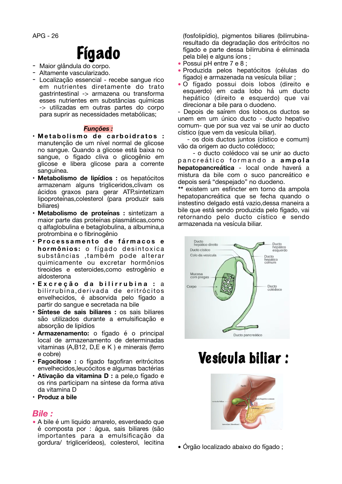 APG - 26 Fígado - Maior glândula do corpo. - Altamente vascularizado. - Localização essencial - recebe sangue rico em nutrientes diretamente do trato gastrintestinal -> armazena ou transforma esses nutrientes em substâncias químicas -> utilizadas em outras partes do corpo para suprir as necessidades metabólicas; Funções : • M e t a b o l i s m o d e c a r b o i d r a t o s : manutenção de um nível normal de glicose no sangue. Quando a glicose está baixa no sangue, o fígado cliva o glicogênio em glicose e libera glicose para a corrente sanguínea. • Metabolismo de lipídios : os hepatócitos armazenam alguns trigliceridos,clivam os ácidos graxos para gerar ATP,sintetizam lipoproteínas,colesterol (para produzir sais biliares) • Metabolismo de proteínas : sintetizam a maior parte das proteínas plasmáticas,como q alfaglobulina e betaglobulina, a albumina,a protrombina e o fibrinogênio • P r o c e s s a m e n t o d e f á r m a c o s e h o r m ô n i o s : o f í g a d o d e s i n t o x i c a substânc ias , também pode a l te ra r quimicamente ou excretar hormônios tireoides e esteroides,como estrogênio e aldosterona • E x c r e ç ã o d a b i l i r r u b i n a : a b i l i r r u b i n a , d e r i v a d a d e e r i t r ó c i t o s envelhecidos, é absorvida pelo fígado a partir do sangue e secretada na bile • Síntese de sais biliares : os sais biliares são utilizados durante a emulsificação e absorção de lipídios • Armazenamento: o fígado é o principal local de armazenamento de determinadas vitaminas (A,B12, D,E e K ) e minerais (ferro e cobre) • Fagocitose : o fígado fagofiran eritrócitos envelhecidos,leucócitos e algumas bactérias • Ativação da vitamina D : a pele,o fígado e os rins participam na síntese da forma ativa da vitamina D • Produz a bile Bile : • A bile é um liquido amarelo, esverdeado que é composta por : água, sais biliares (são importantes para a emulsificação da gordura/ triglicerídeos), colesterol, lecitina (fosfolipídio), pigmentos biliares (bilirrubina- resultado da degradação dos eritrócitos no fígado e parte dessa bilirrubina é eliminada pela bile) e alguns íons ; • Possui pH entre 7 e 8 ; • Produzida pelos hepatócitos (células do fígado) e armazenada na vesícula biliar ; • O fígado possui dois lobos (direito e esquerdo) em cada lobo há um ducto hepático (direito e esquerdo) que vai direcionar a bile para o duodeno. - Depois de saírem dos lobos,os ductos se unem em um único ducto - ducto hepativo comum- que por sua vez vai se unir ao ducto cístico (que vem da vesícula biliar). - os dois ductos juntos (cístico e comum) vão da origem ao ducto colédoco; - o ducto colédoco vai se unir ao ducto p a n c r e á t i c o f o r m a n d o a a m p o l a hepatopancreática - local onde haverá a mistura da bile com o suco pancreático e depois será “despejado” no duodeno. ** existem um esfíncter em torno da ampola hepatopancreática que se fecha quando o instestino delgado está vazio,dessa maneira a bile que está sendo produzida pelo fígado, vai retornando pelo ducto cístico e sendo armazenada na vesícula biliar. Vesícula biliar : • Órgão localizado abaixo do fígado ; • O ducto que conduz a bile para fora da vesícula biliar é chamado de ducto cístico. • O fígado produz 1L de bile por dia,mas uma parte é armazenada na vesícula biliar ( cerca de 400ml ) • Além de armazenar, ela também muda concentração da bile > Os ductos possuem muitos capilares,devido a isso a vesícula consegue drenar uma boa parte da água e dos ácidos biliares presente na bile, isso faz com que a b i l e fi q u e m a i s c o n c e n t r a d a e , consequentemente , ma is e fe t i va na emulsificação. Retirada da vesícula (colecistectomia ) - Quando há a retirada da vesícula biliar, o paciente continuará produzindo a bile no fígado, mas a bile agora não para na vesícula para ser concentrada,portanto,ela tem um efeito menor, uma menor função no processo de digestão. - Neste processo, é comum que o paciente apresente diarreia quando ele consumir alimentos com gordura,pois a bile agora não é tão efetiva no processo de emulsificação. - Diante dessa situação,o corpo produz um mecanismo de adaptação : Os ductos vão sofrer um processo de adaptação, aonde vão diminuir a sua capacidade de contração e com isso irão aumentar o seu diâmetro para que eles possam armazenar um pouco de bile e com esse armazenamento a bile passa a ter uma melhoria na sua concentração,como se estivesse ficado dentro da vesícula biliar. Lipídios - Lipídios são insolúveis em água e solúveis em solventes orgânicos ; - É um composto orgânico (possuem carbono), portanto é possível extrair energia dos lipídios Funções : • Isolantes térmicos : todos os animais e n d o t é r m i c o ( q u e c o n t ro l a m s u a temperatura internamente) precisam de uma camada de lipídios revestindo o seu corpo. • Reserva de energia : a nossa energia é armazenada nos adipócitos . • Constituintes da membrana plasmática : tanto nos fosfolipídios quanto no colesterol presente na membrana plasmática e em todas as células. • Função hormonal : tes tos te rona , progesterona e estrógeno. Classificação : • Glicerídeos (triglicerídeo) : - São com os glicerídeos que as planetas e os animais armazenam energia . - São os óleos e as gorduras; Óleos : São de origem vegetal ; São líquidos na temperatura ambiente ; Ácidos graxos insaturados. ** estimulam a produção do HDL Gorduras : Origem animal ; São sólidas na temperatura ambiente; Ácidos graxos saturados. ** Gordura saturada é pior que insaturada ! Pois vai estimular uma doença chamada aterosclerose. ** estimulam a produção do LDL . Gordura trans : Feita pela indústria,na qual pega uma gordura vegetal faz um processo de hidrogenação, modificando a formação dos ácidos graxos tornando eles mais retos, conseq