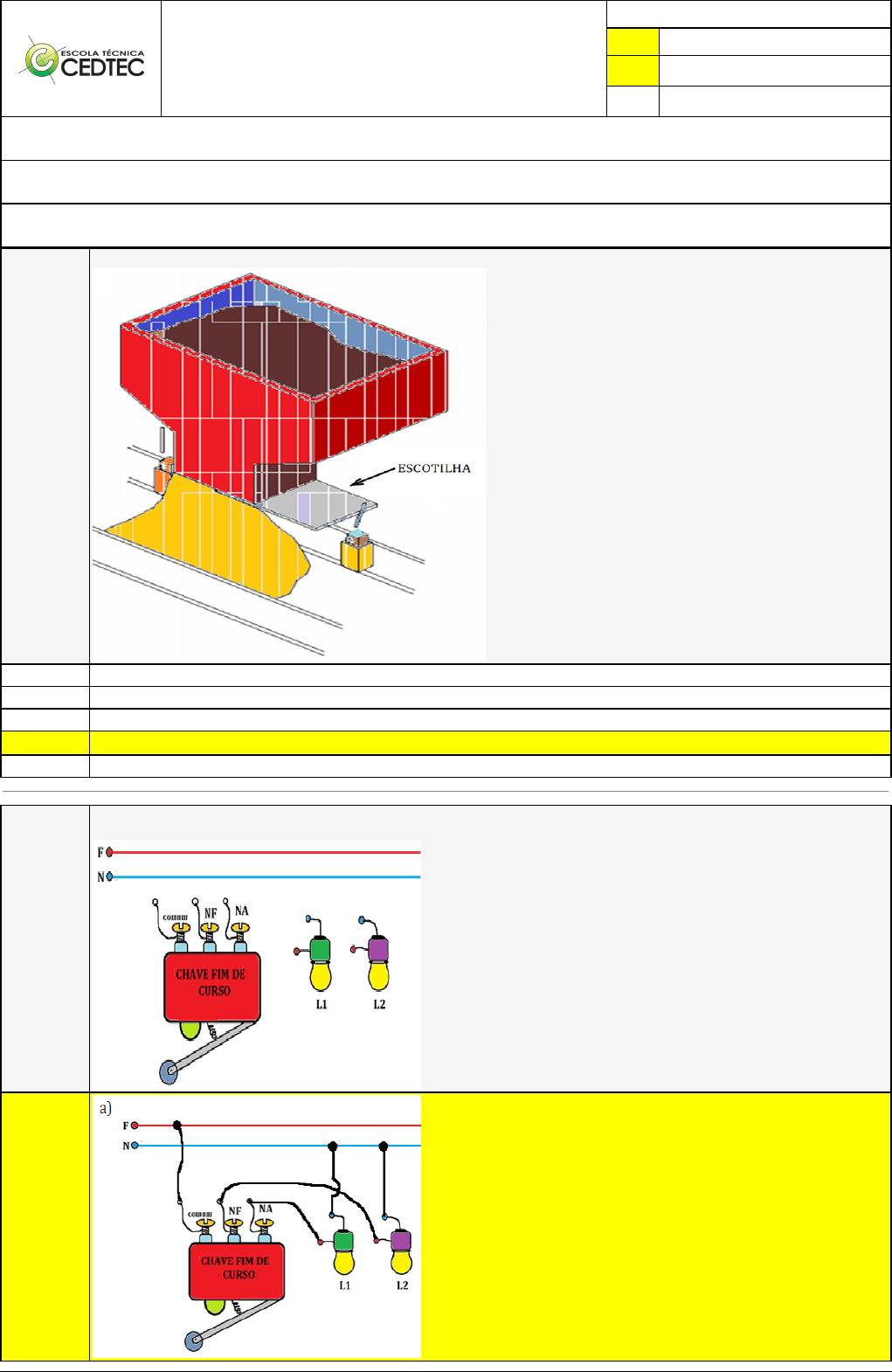Pincel Atômico - 22/02/2022 09:58:21 1/2 Exercício Caminho do Conhecimento - Etapa 16 (13639) Atividade finalizada em 24/01/2022 09:45:44 (tentativa: 1) LEGENDA Resposta correta na questão # Resposta correta - Questão Anulada X Resposta selecionada pelo Aluno Disciplina: COMANDOS ELÉTRICOS [capítulos - 106] - Avaliação com 4 questões, com o peso total de 3,25 pontos Turma: Curso Técnico: Eletrotécnica - Grupo: EAD - MARÇO/21 - EAD ELE [21881] Aluno(a): 91203681 - JULIO CESAR GUIMARAES MENDONCA - Respondeu 4 questões corretas, obtendo um total de 3,25 pontos como nota Questão 001 O desenho abaixo ilustra a aplicação de uma chave fim de curso. Que função é essa? Nada do que foi considerado esta verdadeiro Verificar se o contator esta operando normalmente Verificar se as correias ligadas aos motores estão funcionando X Verificar se a escotilha estará aberta ou fechada Verificar se o relé esta funcionando bem Questão 002 Abaixo é dado o desenho de um circuito contendo uma chave fim de curso e duas lâmpadas. Deseja-se controlar essas lâmpadas através dessa chave de maneira que as lâmpadas L1 e L2 só acendam alternadamente. Faça as ligações necessárias. X Pincel Atômico - 22/02/2022 09:58:21 2/2 Todas as ligações feitas estão corretas Todas as ligações feitas estão erradas Questão 003 A chave fim de curso é muito utilizado em máquinas industriais e também em portões automáticos. Na robótica, tem como aplicação, identificar degraus, paredes, ou até mesmo como medida de segurança impedindo que o sistema force o motor. Em resumo, a função principal é avisar que o comando ou determinada situação foi completada. Umas das aplicações mais comuns da chave fim de curso são: 1)Inversão de Polaridade; Circuito de tempo 2)Mudança de estado ou função; Acionamento biestável 3)Acionamento de contatores 2 e 3 estão corretas Somente 3 alternativa a esta correta X Só as alternativas 1 e 2 são corretas 1, 2 e 3 estão correstas Somente 1 alternativa a esta correta Questão 004 Uma chave fim de curso é um dispositivo eletromecânico que consiste de um atuador mecanicamente conectado a um conjunto de contatos. Elas podem determinar a presença ou ausência, passagem, posicionamento e término do curso de um objeto, por isso o nome de "chave fim de curso". São classificadas como vantagens desse tipo de equipamento: 1)Fácil utilização ; Operação visível simples 2)Invólucro duradouro ; Boa vedação para operação de segurança 3)Alta resistência para diferentes condições de ambiente encontradas nos segmentos industriais; Alta repetibilidade As alternativas 2 e 3 estão incorretas As alternativas 1 e 3 estão incorretas Todas as alternativas estão incorretas X As alternativas 1, 2 e 3 estão corretas. As alternativas 1 e 3 estão corretas