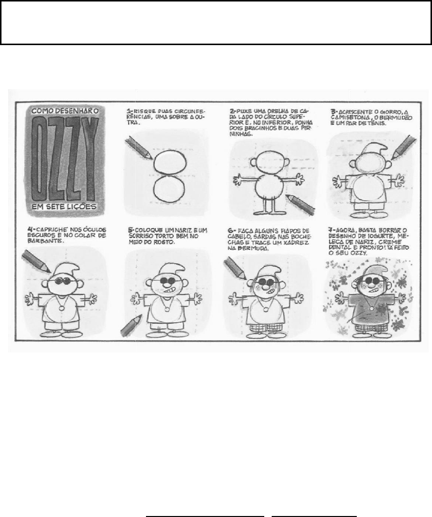 AVALIAÇÃO DIAGNÓSTICA DE LÍNGUA PORTUGUESA 9º ANO ALUNO PROFESSOR ESCOLA DATA__/__/ 1)Leia o texto a seguir Na tirinha de Angeli, é descrito, passo a passo, como desenhar o Ozzy em sete lições. Analise as informações numeradas e IDENTIFIQUE que tipo de texto é utilizado nesses sete itens. a) publicitário. b) jornalístico. c) literário. d) instrucional. 2) Leia a frase abaixo e responda. “Havia uma mesa arrumada embaixo de uma árvore, em frente à casa, e a Lebre de Março e o Chapeleiro estavam tomando chá...” Os trechos em destaque cumprem sintaticamente a função de adjuntos adverbiais e expressam a circunstância de: a) tempo. b) lugar. c) modo. d) dúvida. e) causa. 3)Observe o texto abaixo. O texto acima pertence a qual gênero a)Cartaz b) Capa de revista c) Receita d) Notícia 4) Leia o texto abaixo. Texto 1 Mapa Da Devastação A organização não-governamental SOS Mata Atlântica e o Instituto Nacional de Pesquisas Espaciais terminaram mais uma etapa do mapeamento da Mata Atlântica (www.sosmataatlantica.org.br). O estudo iniciado em 1990 usa imagens de satélite para apontar o que restou da floresta que já ocupou 1,3 milhões de km2, ou 15% do território brasileiro. O atlas mostra que o Rio de Janeiro continua o campeão da motosserra. Nos últimos 15 anos, sua média anual de desmatamento mais do que dobrou. Revista Isto É – nº 1648 – 02-05-2001 São Paulo – Ed. Três. Texto 2 Há qualquer coisa no ar do Rio, além de favelas Nem só as favelas brotam nos morros cariocas. As encostas cada vez mais povoadas no Rio de Janeiro disfarçam o avanço do reflorestamento na crista das serras, que espalha cerca de 2 milhões de mudas nativas da Mata Atlântica em espaço equivalente a 1.800 gramados do Maracanã. O replantio começou há 13 anos, para conter vertentes ameaçadas de desmoronamento. Fez mais do que isso. Mudou a paisagem. Vista do alto, ângulo que não faz parte do cotidiano de seus habitantes, a cidade aninha-se agora em colinas coroadas por labirintos verdes, formando desenhos em curva de nível, como cafezais. Revista Época – nº 83. 20-12-1999. Rio de Janeiro – Ed. Globo. p. 9. Uma declaração do segundo texto que CONTRADIZ o primeiro é: a) as encostas cariocas estão cada vez mais povoadas. b) a mata atlântica está sendo recuperada no Rio de Janeiro. c) as favelas continuam surgindo nos morros cariocas. d) o replantio segura encostas ameaçadas de desabamento. 5)Leia a tirinha abaixo O verbo ser refere-se a a) psicossomáticos. b) problemas. c) saúde. d) cabeça. 6) Leia o texto abaixo. AO APAGAR DAS LUZES Ele tinha decidido, sem nada avisar, sem combinação nenhuma, que naquela noite haveria o grande desvendamento. Ele ia-se revelar, pronunciar a dura verdade, abrir o peito, rasgar as vestes da postura comida, e abrir as pernas e parir a si mesmo e suas verdades na cara dos demais, Eram uma família normal, uma gente cotidiana, que trabalhava para pagar suas contas, que mantinha um tipo de fidelidade devida antes ao cansaço e à resignação que à lealdade e ao amor. Pais e filhos, uns casados, outros solteiros, reuniam-se cada domingo assim, para atenderem ao desejo da mãe, à ordem do pai, e à sua própria resignação. O pai era um homem normal, cumpridor metódico de seus deveres, prazeres poucos, e ao cabo de tantos anos já não sabia direito o que eram seus desejos, se tinha sonhos, se tudo se fundia tia realidade tediosa... (O Estado de S. Paulo, 10/04/2002) No fragmento acima quem conta a história a) O pai b) A mulher c) O narrador d) Os filhos 7)Leia o texto abaixo. Amor à primeira vista Papel, plástico, alumínio. Modernas embalagens industrializadas são essencialmente confeccionadas com essas três matérias-primas. Mas o resultado está longe de ser monótono. Desde que os especialistas em vendas descobriram que a embalagem é um dos primeiros fatores que influenciam a escola do consumidor, ela passou a ser estudada com mais atenção. Atualmente, estampa cores forte, letras garrafais e formatos curiosos na tentativa de chamar atenção nas prateleiras dos supermercados. Produtos infantis, por exemplo, apelam para desenhos animados, ou super-heróis da moda para derrubar a concorrência. Provavelmente é o caso do achocolatado que você toma de manhã, do queijinho suíço do meio da tarde e até mesmo da sopinha da noite. Essas embalagens despertam o interesse dos consumidores de tal forma que, muitas vezes eles levam o produto para casa mais porque gostaram de sua roupagem do que pelo fato de apreciarem um conteúdo.[...] Um argumento que sustenta a tese de que “a embalagem agora é uma forma de conquistar o consumidor” é que a) a embalagem passou a ser mais bem cuidada. b) a embalagem tem formatos muito curiosos. c) a embalagem objetiva vestir bem os produtos. d) os consumidores são atraídos pela embalagem 8) Leia o texto abaixo. Animais no Espaço Vários animais viajaram pelo espaço como astronautas. Os russos já usaram cachorros em suas experiências. Eles têm o sistema cardíaco parecido com o dos seres humanos. Estudando o que acontece em eles, os cientistas descobrem quais problemas podem acontecer com as pessoas. A cadela Laika, tripulante da Sputnik-2, foi o primeiro ser vivo a ir ao espaço, em novembro de 1957, quatro anos antes do primeiro homem, o astronauta Gagarin. Os norte-americanos gostam de fazer experiências científicas espaciais com macacos, pois o corpo deles se parece com o humano. O chimpanzé é o preferido porque é inteligente e convive melhor com o homem do que as outras espécies de macacos. Ele aprende a comer alimentos sintéticos e não se incomoda com a roupa espacial. Além disso, os macacos são treinados e podem fazer tarefas a bordo, como acionar os comandos das naves, quando as luzes coloridas acendem no painel, por exemplo. Enos foi o mais famoso macaco a viajar para o espaço, em novembro de 1961, a bordo da nave Mercury/Atlas 5. A nave de Enos teve