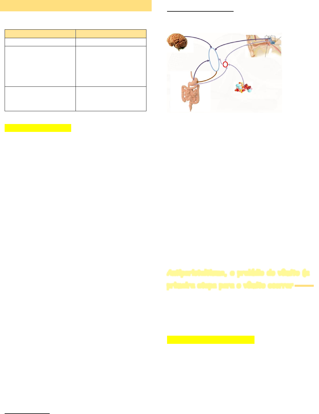 Diferenças entre náusea e vômito: NÁUSEA VÔMITO Sintoma. Sinal. Geralmente associado à iminência de vomitar. Corresponde tanto ao ato em si de ejetar material pela boca, quanto pelo próprio material ejetado. Subjetivo. É um reflexo com muitas aferências e uma eferência. O QUE É O VÔMITO? É o meio que o trato gastrointestinal superior libera seu conteúdo (é uma reação de defesa do SN autônomo). A liberação desse conteúdo ocorre quando há irritação excessiva, hiperdistensão ou hiperexcitação em qualquer parte do trato digestivo superior. Geralmente ele ocorre como uma forma de eliminar agentes nocivos do organismo, como consequência da ingestão excessiva de álcool ou devido à ingestão de um alimento com a toxina de alguma bactéria, por exemplo. O corpo reconhece isso e evoca a eliminação. Alimentos tóxicos. Muito álcool. Alimentação excessiva. Ansiedade. Mas ele pode ocorrer também como consequência do efeito adverso de alguns medicamentos ou devido a alguma condição patológica, como a uremia. Medicamentos citotóxicos (usados no tratamento do câncer, por exemplo). Entram com facilidade no SN, pois não precisam atravessar a barreira hematoencefálica. Esses elementos geralmente atuam estimulando receptores que irão provocar o vômito. REFLEXO DO VÔMITO Relés do vômito: local de encontro entre a aferência e a eferência do vômito (centro do vômito; fica no bulbo). Principais aferências: corrente sanguínea, gastrointestinal, sistema nervos e sistema vestibular. Os sinais sensoriais que iniciam o vômito advêm principalmente da faringe, do esôfago, do estômago e da porção inicial do intestino delgado. Uma vez que esses sinais sensoriais são ativados, eles propiciam o envio de impulsos nervosos, através de fibras nervosas aferentes vagais e simpáticas para o centro do vômito (que fica no bulbo). Feito isso, o centro do vômito envia impulsos motores para: O TGI superior, através dos nervos cranianos (5º, 7º, 9º, 10º e 12º). A região mais distal do TGI, por meio dos nervos vagais e simpáticos. O diafragma e os músculos abdominais, por meio dos nervos espinais. Antiperistaltismo, o prelúdio do vômito (a primeira etapa para o vômito ocorrer A primeira etapa para que o vômito ocorra é o antiperistaltismo, o qual começa a ocorrer à medida que o TGI é irritado excessivamente ou hiperdistendido e antecede em minutos o vômito. O que é antiperistaltismo? É o movimento peristáltico ocorrendo em seu sentido contrário, ou seja, em direção à cavidade bucal (para cima). o O antiperistaltismo geralmente se inicia no íleo e essa onda antiperistáltica percorre uma velocidade de 2 a 3 cm/s em direção à cavidade oral. o Esse processo do conteúdo saindo do intestino delgado em direção ao estômago dura de 3 a 5 minutos para acontecer. o À medida que essas partes superiores do TGI vão sendo hiperdistendidas, essa distensão é o Mecanismo de reflexo do vômito fator excitatório que irá propiciar a ocorrência do vômito em si. o No início do vômito: o Tanto o duodeno quanto o estômago são contraídos fortemente. o E o esfíncter esofagogástrico é relaxado parcialmente, permitindo que o vômito passe do estômago para o esôfago. Ato do vômito Quando o centro do vômito é suficientemente estimulado, os primeiros efeitos que ocorrem no organismo são: Respiração profunda. Elevação do osso hioide e da laringe para a abertura do esfíncter esofágico superior. Fechamento da glote para que o vômito não vá para o sistema respiratório (pulmões). Elevação do palato mole para fechar as narinas posteriores. Além disso, em seguida ocorre a contração do diafragma e dos músculos abdominais, fazendo com que o estômago seja comprimido e, consequentemente, tenha sua pressão aumentada. Dessa forma, o esfíncter esofágico inferior se relaxa completamente, permitindo que o conteúdo gástrico a ser eliminado seja expelido para o esôfago. Vômitos por fármacos ou por cinetose Além dos estímulos do próprio TGI, os vômitos também podem ser causados por sinais nervosos, iniciados na zona de disparo de quimiorreceptores, no bulbo. Isso pode ocorrer devido à estimulação elétrica dessa região ou devido a administração de determinados fármacos, como a apomorfina, que estimulam diretamente a zona de disparo de quimiorreceptores. A destruição dessa área bloqueia esse tipo de vômito, mas não é capaz de bloquear os estímulos irritativos do TGI. Outro fator que pode provocar o vômito são as mudanças repentinas na direção ou nos movimentos corporais. Isso ocorre porque o movimento irá estimular receptores no labirinto vestibular do ouvido interno, que irá transmitir impulsos para o cerebelo, o qual irá direcioná-los para a zona de disparo dos quimiorreceptores, que, por fim, chegará ao centro do vômito, provocando-o.