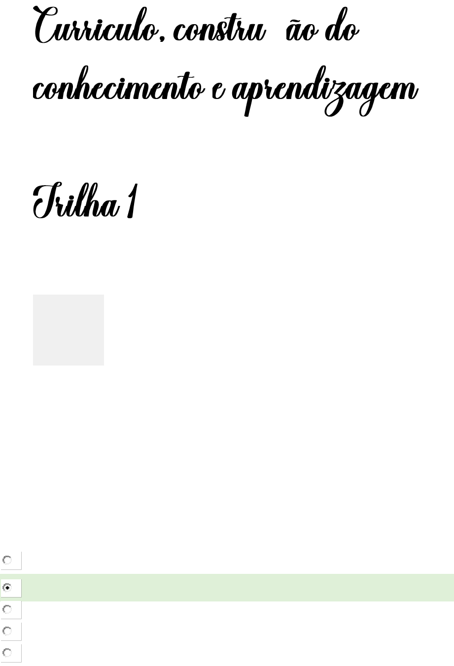 ç Questão 1 Correto Vale 1 ponto(s). Marcar questão Texto da questão Escolha a alternativa que traduz o que é a seleção de determinados conhecimentos e práticas produzidos em determinados contextos para garantir aprendizagens consideradas necessárias para formação de uma geração. Escolha uma opção: Avaliação Currículo Estratégia Objetivos Conteúdo Feedback Sua resposta está correta. Questão 2 Correto Vale 1 ponto(s). Marcar questão Texto da questão Analise as proposições abaixo: • Refletem-se em aprendizagens dos alunos; • Afetam a socialização dos professores; • Projetam-se no ambiente social e familiar etc. Elas se referem a: Escolha uma opção: Tradução do currículo. Objetivos do currículo. Consequências do currículo. Elementos do currículo. Validade do currículo. Feedback Sua resposta está correta. Questão 3 Correto Vale 1 ponto(s). Marcar questão Texto da questão Ao psicopedagogo na trama curricular cabe: Escolha uma opção: ensinar os conteúdos curriculares. obter resultados acadêmicos. analisar as relações transferenciais. encaminhar para especialistas de aprendizagem. fazer a verificação da aprendizagem. Feedback Sua resposta está correta. Questão 4 Correto Vale 1 ponto(s). Marcar questão Texto da questão Ao indagar sobre o que ensinar, estamos nos referindo: Escolha uma opção: Aos objetos de conhecimento. Aos objetivos. À organização da etapa em que o objeto é abordado. Aos recursos para ensinar. À avaliação. Feedback Sua resposta está correta. Questão 5 Correto Vale 1 ponto(s). Marcar questão Texto da questão Qual é o currículo que foca os resultados da aprendizagem? Escolha uma opção: Oculto Moldado pelos professores Prescrito Apresentado aos professores Avaliado Feedback Sua resposta está correta. Parte superior do formulário Questão 1 Correto Vale 1,00 ponto(s). Marcar questão Texto da questão Embora tenhamos um currículo comum carregado da cultura hegemônica que afeta a todos, independente do contexto de vivência, este currículo: Escolha uma opção: também vai ser influenciado pelas forças políticas hegemônicas. também vai ser influenciado pelas identidades sociais inclinadas para a manutenção de regimes políticos vigentes. também vai ser influenciado pelas diversas culturas que compõem a sociedade. também vai ser influenciado pelas agendas políticas que fazem contrapor um discurso democratizante a uma prática destituída de vontades e engajamentos. também vai ser influenciado pelas condições que geram desigualdades e inspiram a luta pública e ampla pelo aprofundamento radical da democracia. Feedback Sua resposta está correta. Questão 2 Correto Vale 1,00 ponto(s). Marcar questão Texto da questão Em que século a cultura estava ligada a cultivo da terra e criação de animais? Escolha uma opção: Século XV Século XVII Século XVIII Século XVI Século XX Feedback Sua resposta está correta. Questão 3 Correto Vale 1,00 ponto(s). Marcar questão Texto da questão Ao articularmos todas as funções da escola, vemos que ela agrega uma função socioeducativa, sendo espaço da constituição dos sujeitos. Portanto, o currículo é um importante recurso para articular os diferentes conhecimentos e saberes acadêmicos que se juntam às referências culturais e sociais, com vista a uma formação consistente, em que se possa garantir o passaporte que permita uma aprendizagem significativa. Por isso o psicopedagogo precisa olhar para este cenário e reconhecê-lo como o contexto formativo que atua sobre a possibilidade de aprendizagem de cada um dos aprendentes, pois a Psicopedagogia: Escolha uma opção: foi construindo-se ao longo dos tempos numa tríade funcional, em que assumia a primazia, em cada momento, a função epistêmica, a função socializante e a função profissionalizante. é uma formação geral, com base numa formação cultural e científica básica, que envolve um conjunto de competências, habilidades e valores que devem fazer parte da experiência daqueles que passam pelo processo de escolarização. é uma formação comum, a qual garante que todos possam ter acesso aos conhecimentos de ciência, cultura e arte construídos pela humanidade, além de igualdade de condições para que todos se desenvolvam plenamente. trabalha com um sujeito contextualizado, a quem deve considerar em suas ações. se coloca como um espaço educativo, mas também é espaço de socialização. Feedback Sua resposta está correta. Questão 4 Correto Vale 1,00 ponto(s). Marcar questão Texto da questão A BNCC trata do currículo como a “ferramenta” que articula as experiências vivenciadas pela criança em torno da maior autonomia e interações com múltiplos elementos, entre os quais as linguagens, o espaço natural e social, a afirmação identitária, os sistemas de representação, os conceitos científicos, a comunicação, mobilizando os diferentes recursos, em especial os cognitivos, que se articulam com a expressão e comunicação. BNCC significa: Escolha uma opção: Base Não Comum Curricular Base Nacional Curricular Comum Base Nacional Comum Curricular Base Natural Comum Curricular Base Nacionalista do Currículo Comum Feedback Sua resposta está correta. Questão 5 Correto Vale 1,00 ponto(s). Marcar questão Texto da questão Qual conceito se refere à visão antropológica de cultura do final do século XX? Escolha uma opção: Cultivo da terra Culturas Criação de animais Currículo Currículos Feedback Sua resposta está correta. Parte inferior do formulário Questão 1 Correto Vale 1,00 ponto(s). Marcar questão Texto da questão Assinale a alternativa que indica o tempo da Abstração. Escolha uma opção: As estratégias têm como propósito proporcionar uma compreensão do erro e das concepções superadas e objetiva à passagem de conceitos menos elaborados para conceitos mais elaborados e somente para efeitos de análise teórica pode ser separada