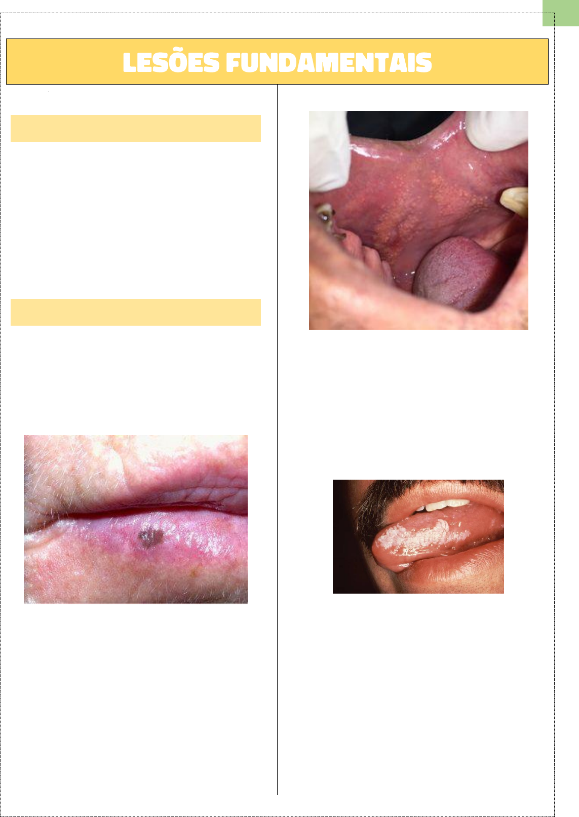 Patologia Bucal Página 1 de 3 1 Odontologia- P4 Introdução As lesões fundamentais são como letras de um alfabeto, indispensáveis para se conhecer o idioma. (David Grispan.) A definição da lesão fundamental favorece a formulação das hipóteses diagnósticas, que possibilitará a solicitação de exame complementar específico, quando necessário, para chegar ao diagnóstico e, consequentemente, à adequada terapêutica. Diante será aborda as principais lesões fundamentais. Tipos de lesões Mancha ou mácula É considerada uma alteração na cor da mucosa bucal, sem apresenta elevações ou depressões.. Essa modificação pode ter origem endógena ou exógena Pápula É uma elevada circunscrita de tamanho inferior a 5 mm, podendo ser séssil, como nos grânulos de fordyce; ou pediculados em papilomas.. Podem apresenta superfície lisa, rugosa, verrucosa, arredondas ou ovais Placa Elevação da superfície da mucosa, no qual sua altura (é quase insignificante) é de tamanho inferior a seu comprimento/base que pode ser de vários cm. É geralmente observada em quadros de leucoplasia. Nódulo Elevação de tamanho superior a 5 mm, podendo ser superficial ou profundo, dependendo de sua origem. Patologia Bucal Página 2 de 3 2 Odontologia- P4 Essas são lesões de formações sólidas que consistem no aumento do volume da superfície da mucosa. Vesícula Elevação circunscrita com tamanho inferior a 3mm, habitualmente observada em quadros de infecções virais: ex..; herpes, varicela etc. Bolha Elevação circunscrita com tamanho superior a 3 mm, sendo comum em doenças autoimunes. Essas são lesões de formações liquidas, que consistem no aumento do volume da superfície da mucosa, sem diferencias, apenas pelo seu tamanho Erosão Perda parcial do epitélio oral sem atingir o tecido conjuntivo Úlcera ou Ulceração Perda de substância do epitélio tendo como consequência a exposição do tecido conjuntivo subjacente. Sendo variada de acordo com a sua profundidade, quando crônica se denomina de úlcera, já quando aguda é ulceração. Essas lesões são de perdas teciduais que consistem na diminuição do volume da superfície da mucosa Patologia Bucal Página 3 de 3 3 Odontologia- P4 Introdução Serão apresentadas algumas alterações morfológicas das lesões fundamentadas Púrpura - Alteração da lesão de mancha Definição: São algumas ‘’manchas’’ pontuais a vermelhadas, é resultante de algum extravasamento sanguíneo que não desaparece sob pressão. Crosta - Alteração da lesão bolha Definição – As crostas aparecem apenas em superfície secas como lábios e pele, geralmente ocorre quando a bolha perde sua proteção (ela explode). Inserção Como a alteração está inserida na mucosa, pode ser de duas formas 1- Séssil – É quando a base da alteração está inserida na mucosa 2- Pediculada – É quando ela apresenta apenas uma parte da sua base inserida na mucosa. Estruturas da boca