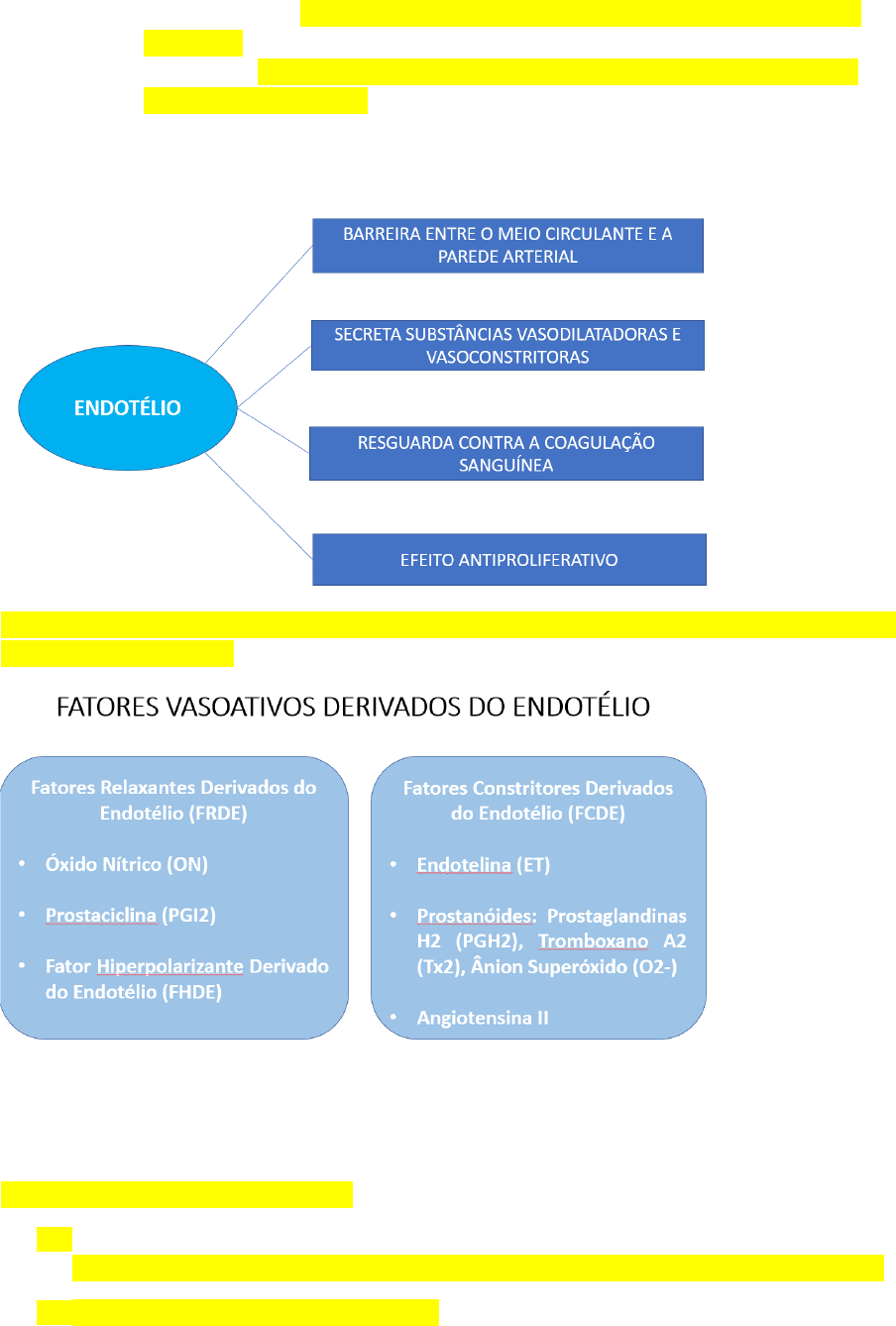 ENDOTÉLIO E ATEROSCLEROSE · ENDOTÉLIO · Consiste em uma fina camada de células que cobre a superfície interna dos vasos sanguíneos, com função endócrina ativa em resposta a estímulos humorais, neurais e mecânicos – liberando substâncias vasoativas que modulam o fluxo sanguíneo, o tônus e o calibre vascular. De acordo com esses estímulos eles vão secretar substancias vasoativas seja para vasodilatação, vasoconstrição e regulando a reatividade vascular Tem atividade, através do oxido nítrico e das prostaciclinas, anticoagulante que tenta evitar a adesão e a agregação plaquetaria FHDE tem papel na hiperpolarização das células musculares lisas da camada media dos vasos, principalmente regulando a entrada de cálcio. ÓXIDO NÍTRICO Principal Fator Relaxante do Endotélio. · Medeia ativamente muitas das funções protetoras exercidas pelo endotélio intacto e associado à Prostaciclina (PGI2), exerce potente efeito antiaterogênico e trombo resistente. · Previne adesão e agregação plaquetárias. Principal fator relaxante vai exercer potente efeito anti-ateroma (tromboresistente)e a adesão e agregação plaquetaria Na célula endotelial, seja por estímulos humorais ou por aumento da disponibilidade da arginina por complementação e suplementação, seja pelas forças de cisalhamento, vai acontecer a reação entre o oxigênio e a arginina no meio da oxidonitricosintetase (enzimas importantes, vários fatores atuam sobre ela) no meio dessa reação é produzido o oxido nítrico e a citrulina. O oxido nítrico vai mediar a transformação do GMPc, que tem atuação importante na vasodilatação, no relaxamento dessa musculatura. Prostacicilina vai atuar sobre o AMPc. Sobre a oxidonitricosintetase, alguns fatores podem ativa-la como IFN-y, fatores que podem inibi-la como TNF-a, IL-1, IL-6. De acordo com esses fatores ela pode estar em maior ou menor atividade. O oxido nítrico tem origem endotelial, mas também pode ser produzido por outras células (células do SNC, macrófagos), por isso ele tem outras atuações (papel inflamatório, no SNC) VASOCONSTRIÇÃO Destacando a endotelina que possui dois receptores na musculatura lisa (A e B) Receptor A tem maior destaque pois estimula a síntese de angiotensina II, vira ciclo vicioso, a produção de angiotensina II estimula a produção de endotelina, a produção de endotelina estimula a produção de angiotensina II efeito vasoconstritor importante Endotelina e a angiotensina II tem intenso papel hiperproliferativo nas células musculares lisas ATUAM NO ENDOTELIO E MEDIAM SUA FUNÇAO: AÇÕES FISIOLÓGICAS DO ÓXIDO NÍTRICO 1. Manutenção de superfície luminal não trombótica 2. Desempenho como uma barreira seletivamente permeável 3. Manutenção do tônus vascular 4. Produção e Secreção de moléculas reguladoras e citocinas 5. Habilidade para modificar (oxidar) lipoproteínas assim que são transportadas para parede arterial. SISTEMA RENINA-ANGIOTENSINA-ALDOSTERONA Elemento importante envolvido na disfunção endotelial, contribuindo para a rigidez arterial. Inabilidade do endotélio de exercer sua função, seja por lesão própria da estrutura endotelial, seja por hipofunçao. Disfunção endotelial é base de varias doenças, primeira etapa para formação das placas, vem de forma precoce. · Estimulacão do SRAA Vascular: maior produção de angiotensina II (AII) e ativação do receptor AT1 da Angiotensina, causando aumento do estresse oxidativo e inflamação no tecido vascular. · Angiotensina + Aldosterona: modulação da resistência à insulina, diminuição da biodisponibilidade do ON disfunção endotelial e rigidez arterial. Aumentando a expressão de IL-6: presente em varias doenças crônicas, um dos principais atuantes na anemia de doenças crônicas. Estimula a produção das proteínas que atraem os monócito para a superfície endotelial Isso atuando no endotélio a médio e longo prazo leva a HAS e a aterosclerose DISFUNÇÃO ENDOTELIAL PERDA DA INTEGRIDADE DO ENDOTÉLIO OU ALTERAÇÕES DE SEU FUNCIONAMENTO 1. Desequilíbrio provocado pela redução de ON e aumento de ET1. 2. Desequilíbrio coagulação/fibrinólise gerado por todos os seguintes fatores de risco: DIABETES MELLITUS HIPERTENSÃO ARTERIAL DISLIPIDEMIA SEDENTARISMO TABAGISMO ENVELHECIMENTO · Incapacidade em regular a vasodilatação arterial mediada pelo fluxo sanguíneo (DMF). A disfunção endotelial é um marcador de ATEROSCLEROSE. · Precede manifestações clínicas, presente em adolescentes e em fumantes tanto ativos como passivos. FORMAÇÃO PLACAS ATEROSCLERÓTICAS · Disfunção Endotelial · Penetração de LDL e leucócitos circulantes na região subendotelial · Oxidação do LDL · Formação das células espumosas · Migração e proliferação das células musculares lisas (CMLV) · Síntese da matriz extracelular · Lesão estrutural do endotélio, com deposição de plaquetas e trombos. No espaço subendotelial acontece as modificações oxidativas e enzimáticas que levam a alterações no endotélio, produção de citocinas, produção das moléculas de quimiotaxia, moléculas de adesão, puxando os monócitos por conseguinte os macrófagos por conseguinte os leucócitos. Monócito é a célula inicial se adere a parede endotelial faz diapedese e passa para dentro da camada subendotelial. Na camada intima da inicio a todo o processo de formação da placa. Monócitos se diferenciam em macrófagos e terão duas vias: uma é a produção de mediadores inflamatórios estimulando as moléculas de adesão (PCR, CD40/CD40L- importante nas células ligadas a aterosclerose-, TNF-a, IL-1, IL-6) quando elas chegam ao endotélio epitelial elas potencializam a ligação dos monócitos para entrar no subendotelio. Fora isso os macrófagos + LDL que veio do sangue foi internalizado e sofreu a reação de oxidação vai se ligar com uma das células espumosas (base do cerne lipídico da placa aterosclerótica) 