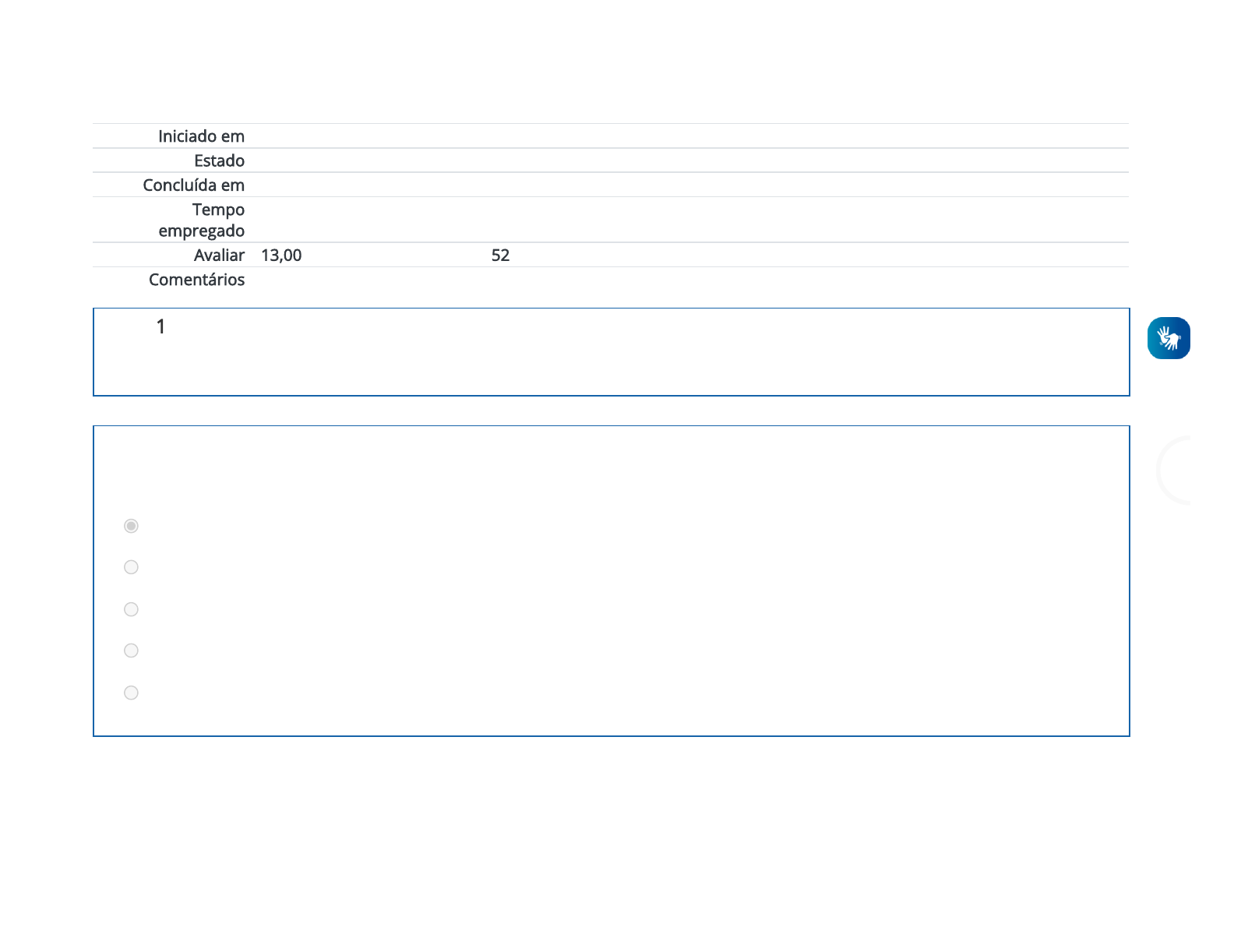 28/09/2021 23:10 Atividade Avaliativa da Unidade 3: Revisão da tentativa https://ead.educacao.mg.gov.br/mod/quiz/review.php?attempt=970000&cmid=2470 1/4 ... Iniciado em terça, 28 set 2021, 23:01 Estado Finalizada Concluída em terça, 28 set 2021, 23:10 Tempo empregado 8 minutos 26 segundos Avaliar 13,00 de um máximo de 25,00(52%) Comentários Questão 1 Correto Atingiu 7,00 de 7,00 O novo ensino médio possui uma carga horária diferente da atual. Em 2022 ela será composta por: a. 600 horas para formação geral básica e 400 horas para itinerário �exível b. 500 horas para formação geral básica e 500 horas para itinerário �exível c. 300 horas para cada uma das áreas de conhecimento d. 600 horas para formação geral básica e 400 horas horas para ensino pro�ssionalizante e. todo o ensino médio será feito a partir das escolhas dos estudantes, portanto não é possivel mensurar carga horária. Sua resposta está correta. 28/09/2021 23:10 Atividade Avaliativa da Unidade 3: Revisão da tentativa https://ead.educacao.mg.gov.br/mod/quiz/review.php?attempt=970000&cmid=2470 2/4 Questão 2 Correto Atingiu 6,00 de 6,00 Sobre competências e habilidades, podemos a�rmar que: 1. É necessário se apropriar de um certo número de habilidades para que certa competência seja alcançada. 2. Há muito mais competências do que habilidades a serem trabalhadas na formação geral básica. 3. Os professores e professoras não precisam saber quais habilidades está trabalhando se o objetivo �nal é apenas ensinar o básico. Dentre as a�rmações acima, assinale a alternativa correta: a. Apenas a a�rmação I está correta. b. Todas as a�rmações estão corretas. c. As a�rmações I e II estão corretas. d. As a�rmações I e III estão corretas. e. Todas as informações estão erradas. Sua resposta está correta. 28/09/2021 23:10 Atividade Avaliativa da Unidade 3: Revisão da tentativa https://ead.educacao.mg.gov.br/mod/quiz/review.php?attempt=970000&cmid=2470 3/4 Questão 3 Incorreto Atingiu 0,00 de 6,00 Sobre as competências, podemos a�rmar que: 1. As competências gerais da BNCC e a soma das competências especí�cas de cada área do conhecimento do CRMG são a mesma coisa 2. As competências especí�cas de cada área são diferentes entre si, com habilidades também diferentes, por mais que algumas delas se aproximem e dialoguem entre si 3. A unidade temática, decorrente de cada competência, signi�ca qual disciplina tratará o tema. Ex.: se será a biologia ou matemática, arte, história e etc. A partir das a�rmações acima, qual das alternativas abaixo está correta? a. Apenas a a�rmativa II. b. As alternativas I e III. c. Apenas a a�rmativa I. d. Apenas a a�rmativa III. e. Todas estão corretas. Sua resposta está incorreta. 28/09/2021 23:10 Atividade Avaliativa da Unidade 3: Revisão da tentativa https://ead.educacao.mg.gov.br/mod/quiz/review.php?attempt=970000&cmid=2470 4/4 Questão 4 Incorreto Atingiu 0,00 de 6,00 Tendo como exemplo o código da habilidade EM13CHS201, podemos dizer que ela se refere ao ensino médio: a. da área de Ciências Humanas e Sociais Aplicadas, competência 2, habilidade 01 b. da área de Ciências da Natureza, competência 2 c. da área de Ciências Humanas e Sociais aplicadas, habilidade 201 d. da área de Conhecimento Histórico Social, habilidade 201 e. ao código da competência geral básica, sem numeração da habilidade. Sua resposta está incorreta. https://ead.educacao.mg.gov.br/mod/resource/view.php?id=2468&forceview=1 https://ead.educacao.mg.gov.br/mod/book/view.php?id=2472&forceview=1