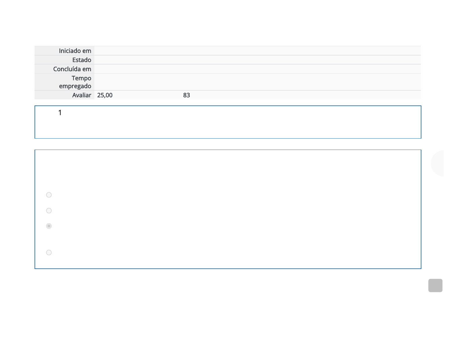 13/12/2021 09:28 Atividade de Fixação e Avaliativa da Unidade I: Revisão da tentativa https://ead.educacao.mg.gov.br/mod/quiz/review.php?attempt=1061941&cmid=3399 1/6 ... Iniciado em segunda, 13 dez 2021, 09:03 Estado Finalizada Concluída em segunda, 13 dez 2021, 09:28 Tempo empregado 25 minutos 10 segundos Avaliar 25,00 de um máximo de 30,00(83%) Questão 1 Incorreto Atingiu 0,00 de 5,00 A superação do fracasso, da distorção idade/ano e a consequente promoção de trajetórias de sucesso escolar dependem do esforço coletivo e criativo de cada sujeito envolvido, exigindo ações integradas em três níveis de gestão. Essas ações precisam estar: A. engajadas com todos os envolvidos de forma a garantir que cada jovem e cada adolescente permaneça na escola. B. presentes no cotidiano da escola, porém as ações e projetos podem ser de cada professor. C. articuladas entre as redes, a escola, a sala de aula, ou seja, do professor. D. articuladas e integradas no sentido de permitir a valorização da aprendizagem permanente dos estudantes. 13/12/2021 09:28 Atividade de Fixação e Avaliativa da Unidade I: Revisão da tentativa https://ead.educacao.mg.gov.br/mod/quiz/review.php?attempt=1061941&cmid=3399 2/6 Questão 2 Correto Atingiu 5,00 de 5,00 Sobre a Motivação Intrínseca é correto dizer que é: A. motivada em interesses coletivos. Possui como característica a autonomia coletiva. B. calculada em interesses numéricos. Possui como características quantidades de ações envolvidas. C. baseada em um interesse pessoal. Possui como características a autonomia e o autocontrole. D. baseada em interesse de grupos especí�cos. Possui como características a autonomia e o autocontrole. 13/12/2021 09:28 Atividade de Fixação e Avaliativa da Unidade I: Revisão da tentativa https://ead.educacao.mg.gov.br/mod/quiz/review.php?attempt=1061941&cmid=3399 3/6 Questão 3 Correto Atingiu 5,00 de 5,00 Podemos chamar de Competências Socioemocionais: A. as capacidades individuais que se manifestam nos modos de pensar, sentir e nos comportamentos ou atitudes para se relacionar consigo mesmo e com os outros, estabelecer objetivos, tomar decisões e enfrentar situações adversas ou novas. B. as capacidades grupais que se manifestam nos modos de pensar, sentir e nos comportamentos ou atitudes para se somente com os outros, sem objetivos traçados. C. as capacidades coletivas que se manifestam nos modos de pensar e sentir da comunidade. D. as capacidades individuais que só se manifestam nos modos de pensar, sentir e nos comportamentos ou atitudes para se relacionar consigo mesmo em detrimento do outro. 13/12/2021 09:28 Atividade de Fixação e Avaliativa da Unidade I: Revisão da tentativa https://ead.educacao.mg.gov.br/mod/quiz/review.php?attempt=1061941&cmid=3399 4/6 Questão 4 Correto Atingiu 5,00 de 5,00 Podemos citar como exemplo de Competências Socioemocionais: A. a persistência, a assertividade, a empatia, a falta de con�ança e a curiosidade para aprender. B. a persistência, a assertividade, a empatia, a autocon�ança e a não curiosidade para aprender. C. a persistência, a assertividade, a empatia, a autocon�ança e a curiosidade para aprender. D. a persistência, a assertividade, a negatividade, a autocon�ança e a curiosidade para aprender. 13/12/2021 09:28 Atividade de Fixação e Avaliativa da Unidade I: Revisão da tentativa https://ead.educacao.mg.gov.br/mod/quiz/review.php?attempt=1061941&cmid=3399 5/6 Questão 5 Correto Atingiu 5,00 de 5,00 Com relação à proporção de alunos da rede pública de Minas Gerais, a defasagem da distorção é maior entre: A. estudantes brancos de sexo feminino. B. estudantes negros do sexo feminino. C. não há diferença na distorção de sexo e cor. D. estudantes negros, independente do sexo. 13/12/2021 09:28 Atividade de Fixação e Avaliativa da Unidade I: Revisão da tentativa https://ead.educacao.mg.gov.br/mod/quiz/review.php?attempt=1061941&cmid=3399 6/6 Questão 6 Correto Atingiu 5,00 de 5,00 A Correção de Fluxo foi uma estratégia da SEE/MG para atender: A. estudantes oriundos da zona rural que não tiveram acesso à escola. B. estudantes com 3 anos ou mais de distorção idade/ano de escolaridade. C. estudantes semialfabetizados. D. estudantes com 2 anos ou mais de distorção idade/ano de escolaridade. https://ead.educacao.mg.gov.br/mod/folder/view.php?id=3397&forceview=1 https://ead.educacao.mg.gov.br/mod/page/view.php?id=3401&forceview=1
