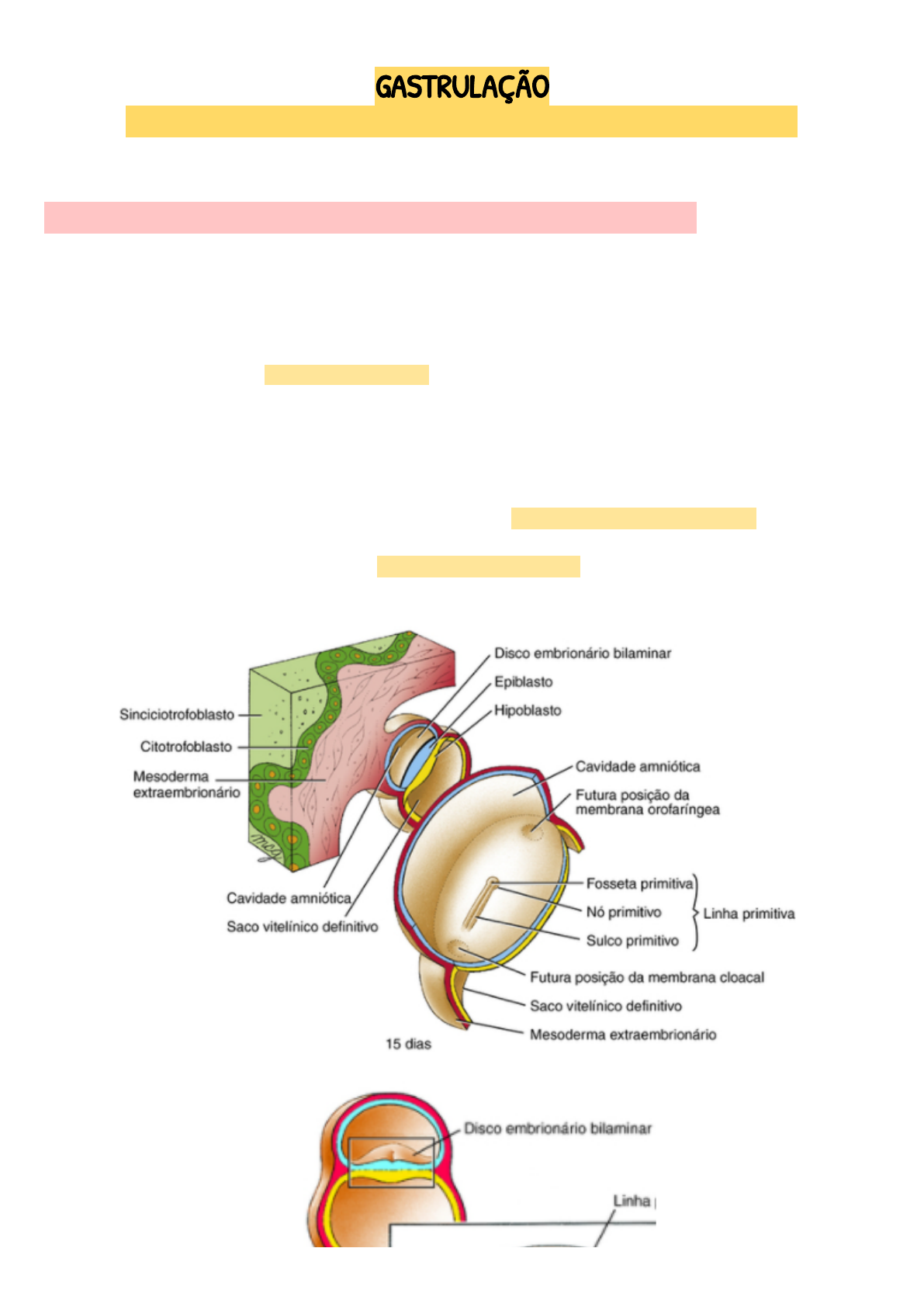 Nicole Siqueira de Arruda CB USP FMRP GASTRULAÇÃO Princípios: Formação das 3 camadas germinativas primárias e dos eixos do corpo A linha primitiva se forma no início da 3° semana e marca os 3 eixos corporais ~15° dia ● Espessamento contendo um sulco na linha mediana, que se estende ao longo do plano sagital mediano do disco embrionário Espessamento→ LINHA PRIMITIVA. ● Alongamento da linha primitiva - ocupa cerca de ½ do disco embrionário. ● SULCO PRIMITIVO se torna + profundo e + definido. ● A extremidade cranial da LP se expande→ NÓ PRIMITIVO / HENSEN. ● O nó primitivo contém uma FOSSETA PRIMITIVA, que é continua caudalmente com o sulco primitivo. 1 Nicole Siqueira de Arruda CB USP FMRP A formação da LP define os eixos corporais: I. Eixo craniocaudal ou cefalocaudal II. Eixo mediolateral III. Eixo esquerdo-direito OBS.: no momento da formação da linha primitiva, o futuro eixo dorsoventral do disco embrionário é grosseiramente equivalente ao eixo ectoderma-endoderma. Mais tarde, com o dobramento do corpo e formação do plano tubo dentro do tubo, o eixo dorsoventral se torna mais bem definido. Formação da LP⇒ início da gastrulação Na gastrulação, as células do epiblasto movem-se em direção à linha primitiva, entram nela e então migram para fora dela como células individuais. INGRESSÃO→ movimento das células através da LP e para o interior do embrião. 2 Nicole Siqueira de Arruda CB USP FMRP Estabelecimento do eixo esquerdo-direito ● Ocorre próximo à época de formação do nó primitivo, na extremidade cefálica da linha primitiva. Assimetria bilateral→ diferenças anatômicas dos lados esquerdo e direito ↳ estabelecida durante a gastrulação - interações celulares centradas no nó primitivo. O nó de Hensen e a notocorda expressam SONIC HEDGEHOG (shh) simétricamente logo após a sua formação. A expressão do receptor de ACTIVINA no lado direito restringe a expressão de shh apenas no lado esquerdo e possibilita a expressão dos genes nodal e lefty. Formação do endoderma de�nitivo No 16° dia ● Os epiblastos nas laterais da linha primitiva começam a se mover para dentro da LP e a sofrer uma Transformação Epitélio Mesenquimal (EMT)→ deslocam o hipoblasto e se inserem entre o epiblasto e hipoblasto. 3 Nicole Siqueira de Arruda CB USP FMRP Epitélio: folhas com células de formato regular (cubóides em geral) interconectadas entre si por suas superfícies laterais. Mesênquima: células com formatos muito irregulares (estreladas em geral) e frouxamente conectadas. ● Durante o EMT as células do epiblasto se alongam e assumem forma de garrafa, soltando-se das suas vizinhas à medida que estendem. Esse movimento coletivo das células para formar os 3 folhetos germinativos primários constitui a gastrulação. ● Deslocamento do hipoblasto e substituição por uma nova camada celular→ ENDODERMA DEFINITIVO (originará o tubo digestivo e derivados). 4 Nicole Siqueira de Arruda CB USP FMRP Formação do mesoderma intraembrionário As células do epiblasto migram bilateralmente a partir da LP e formam inicialmente uma camada de células frouxas entre o epiblasto e o endoderma. ● A camada se reorganiza para formar as 4 subdivisões principais do mesoderma intraembrionário: I. Mesoderma cardiogênico II. Mesoderma paraxial III. Mesoderma intermediário (nefrótomo) IV. Mesoderma da placa lateral ● 5° subdivisão - migração cranialmente do nó primitivo para formar um tubo de paredes espessas na linha média→ PROCESSO NOTOCORDAL. Durante a 3° semana, 2 depressões sutis se formam no ectoderma: 1. Membrana orofaríngea: na extremidade cranial do embrião, sobrejacente à placa pré cordal. 2. Membrana cloacal: na extremidade caudal, atrás da linha primitiva. 5 Nicole Siqueira de Arruda CB USP FMRP Ao fim da 3° semana, o ectoderma dessa região se fusiona com o endoderma, formando membranas bilaminares. Essas membranas passam a ser extremidades cegas no tubo intestinal. A membrana orofaríngea se rompe na 4° semana para formar a abertura da cavidade oral e a cloacal se desintegra na 7° semana para formar as aberturas do ânus e tratos urogenitais. Formação do ectoderma Completada a formação do endoderma definitivo e do mesoderma intra embrionário, as células do epiblasto não se movimentam mais. ● ECTODERMA→ epiblasto remanescente. ● O ectoderma se diferencia em PLACA NEURAL na região central do disco embrionário e em ECTODERMA CUTÂNEO na região periférica. ● Desenvolvimento craniocaudal Epiblastos não estarão mais presentes na região cranial quando houver epiblastos na região caudal sofrendo ingressão. >>> Gastrulação se completa <<< Nesse momento, a formação das 3 camadas germinativas definitivas do disco embrionário trilaminar estará completa em todo o disco. Ectoderma: folheto embrionário + externo; gera epiderme, sistema nervoso central e derivados da crista neural. 6 Nicole Siqueira de Arruda CB USP FMRP Endoderma: folheto + interno; gera revestimento interno do trato intestinal e participa de órgãos anexos, pulmão, fígado e pâncreas. Mesoderma: folheto intermediário; gera esqueleto cartilaginoso e ósseo, musculatura, tecidos conjuntivos, sistema cardiovascular e urogenital. ⇒ As 3 camadas derivam do epiblasto no processo de gastrulação. Especi�cidades da gastrulação: a movimentação de células para novos locais e a formação dos rudimentos dos órgãos com interações indutivas O destino das células do epiblasto depende do seu local de origem ● Mapas de destino esperado mostram que as células são parcialmente segregadas umas das outras no epiblasto e na linha primitiva, embora haja sobreposição entre grupos de células adjacentes. ● Maioria das células do epiblasto e da LP são pluripotentes e seus destinos são especificados por interações celulares (na migração ou no destino final). 7 Nicole Siqueira de Arruda CB USP FMRP A - endo