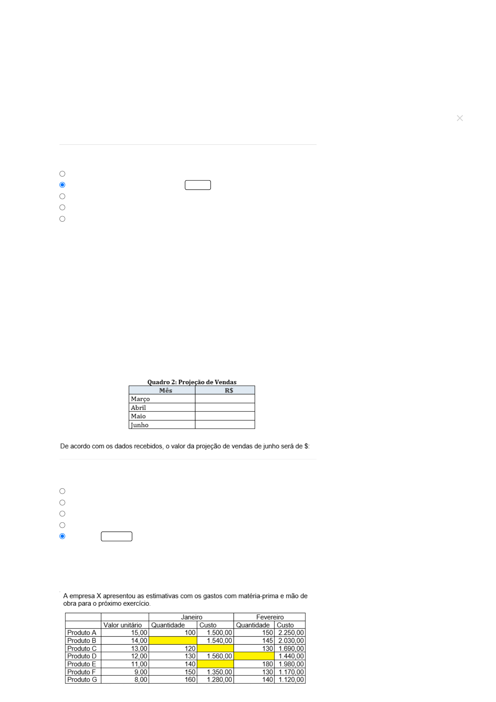 27/02/2022 11:54 Cosmos · Cosmos https://kroton.platosedu.io/lms/m/aluno/disciplina/index/2429586/3138932 1/5 Planejamento estratégico orçamentário Professor(a): Lucineide Bispo dos Reis Luz (Mestrado acadêmico) 1) 2) 3) Prepare-se! Chegou a hora de você testar o conhecimento adquirido nesta disciplina. A Avaliação Virtual (AV) é composta por questões objetivas e corresponde a 100% da média final. Você tem até cinco tentativas para “Enviar” as questões, que são automaticamente corrigidas. Você pode responder as questões consultando o material de estudos, mas lembre-se de cumprir o prazo estabelecido. Boa prova! A empresa, ao pensar no cálculo do lucro operacional orçado de determinado produto que fabrica, deve considerar na sua composição: Alternativas: Código da questão: 35322 A empresa do Sr. Antônio pede para que você faça a projeção de vendas para o próximo exercício, de acordo com os dados abaixo: Março, no valor de $ 15.000,00. Abril, com base no valor de março, projete um aumento de 25%. Maio, com base no valor de abril, projete uma redução de 10%. Junho, com base no valor de maio, projete um aumento de 32%. Utilize o quadro para realizar os cálculos. Alternativas: Código da questão: 35353 Deve considerar as receitas e somente os custos de produção. As receitas e os gastos variáveis e fixos. CORRETO Somente a receita que irá obter. Somente despesas. Somente custos e despesas. 22.500,00. 22.275,00. 16.875.00. 18.750,00. 27.225,00. INCORRETO Avaliação enviada com sucessoc h e c k 27/02/2022 11:54 Cosmos · Cosmos https://kroton.platosedu.io/lms/m/aluno/disciplina/index/2429586/3138932 2/5 4) 5) Alternativas: Código da questão: 51227 Atualmente, a empresa adota o recebimento parcelado da seguinte forma: 30% à vista e 70 % no mês seguinte. Se a empresa no mês de janeiro vendeu $ 10.000,00 e em fevereiro $ 15.000,00, quanto ela irá receber em março? Utilize o quadro para realizar os cálculos: Alternativas: Código da questão: 35354 O quadro abaixo apresenta a previsão de receitas de determinada empresa. Quadro 1 - Previsão de Receitas no ano 1 da empresa PeríodosBudget Variação Forecast Mês 1 5.000,00 100,00 5.100,00 Mês 2 5.000,00 (500,00) 4.500,00 Mês 3 5.000,00 300,00 5.300,00 Mês 4 5.000,00 ( 1.650,00) 3.350,00 Mês 5 5.000,00 500,00 5.500,00 Mês 6 5.000,00 600,00 5.600,00 Mês 7 5.000,00 ( 1.200,00) 3.800,00 Produto B: Janeiro quantidade de 1.540 unidades; Produto C: Janeiro $ 1.560,00 de custos; Produto D: Fevereiro quantidade de 120 unidades; Produto E: Janeiro $ 1.000,00 de custos. Produto B: Janeiro quantidade de 120 unidades; Produto C: Janeiro $ 1.540,00 de custos; Produto D: Fevereiro quantidade de 120 unidades; Produto E: Janeiro $ 1.560,00 de custos. Produto B: Janeiro quantidade de 110 unidades; Produto C: Janeiro $ 1.560,00 de custos; Produto D: Fevereiro quantidade de 120 unidades; Produto E: Janeiro $ 1.540,00 de custos. CORRETO Produto B: Janeiro quantidade de 110 unidades; Produto C: Janeiro $ 1.540,00 de custos; Produto D: Fevereiro quantidade de 100 unidades; Produto E: Janeiro $ 1.540,00 de custos. Produto B: Janeiro quantidade de 110 unidades; Produto C: Janeiro $ 1.560,00 de custos; Produto D: Fevereiro quantidade de 140 unidades; Produto E: Janeiro $ 1.540,00 de custos. 4.500,00. 3.000,00. 10.500,00. CORRETO 7.000,00. 10.000,00. Avaliação enviada com sucessoc h e c k 27/02/2022 11:54 Cosmos · Cosmos https://kroton.platosedu.io/lms/m/aluno/disciplina/index/2429586/3138932 3/5 6) 7) ês 5.000,00 ( . 00,00) 3.800,00 Mês 8 5.000,00 400,00 5.400,00 Mês 9 5.000,00 1.000,00 6.000,00 Mês 10 5.000,00 ( 1.000,00) 4.000,00 Mês 11 5.000,00 ( 700,00) 4.300,00 Mês 12 5.000,00 900,00 5.900,00 Após observá-lo, e com base na teoria do modelo de orçamento forecast, podemos apurar: Alternativas: Código da questão: 35325 A empresa do Sr. Pedro acaba de contratar novos financiamentos (no período 1), no valor total de $ 100.000,00. Os juros negociados foram de 0,50% ao mês e o IOF foi de 0,10%, ao mês também. Utilize o quadro para auxiliá-lo (a) nos cálculos: Períodos 1 2 Saldo inicial Novos financiamentos Juros IOF Total Despesas financeiras Pagamento Saldo final Sabendo que não houve quitação de nenhuma parcela do financiamento e considerando os porcentuais negociados em contrato a partir do mês de contratação (a partir do período 1), aponte a alternativa que apresenta o valor das despesas financeiras totais no período 1 e no período 2: Alternativas: Código da questão: 35344 Analise as afirmativas abaixo: I - ______________: Esta forma de pensar os resultados estabelece maior autonomia para os gestores cuidarem de seus gastos e priorizarem, ou seja, escolherem, seus próprios indicadores Nos meses 2, 4 e 5, as variações foram negativas. Nos meses 9 e 12, segundo o forecast, foram os meses que a empresa teve maiores receitas realizadas. CORRETO Nos meses 8, 9 e 11 as variações foram positivas. Os meses que apresentaram maiores variações foram 4, 7 e 11. Nos meses 9 e 12, segundo o forecast, foram os meses em que a empresa teve menores receitas realizadas. $ 603,60 e $ 600,00. $ 600,00 e $ 703,60. $ 600,00 e $ 603,60. CORRETO $ 603,60 e $ 603,60. $ 600,00 e $ 600,00. Avaliação enviada com sucessoc h e c k 27/02/2022 11:54 Cosmos · Cosmos https://kroton.platosedu.io/lms/m/aluno/disciplina/index/2429586/3138932 4/5 8) 9) indicadores. II - ______________: O modelo propõe acompanhar o gerenciamento estratégico da empresa, por meio das seguintes perspectivas: financeiras, clientes, processos internos de negócios, aprendizado e crescimento. III - ______________: Tem como três de seus princípios, a autonomia, foco no cliente e organização. Assinale a alternativa que contém as palavras adequadas as colunas: Alternativas: Código da questão: 35331 Em relação aos questionamentos que a empresa deve abordar para realizar seu orçamento de vendas, considere as afirmações abaixo