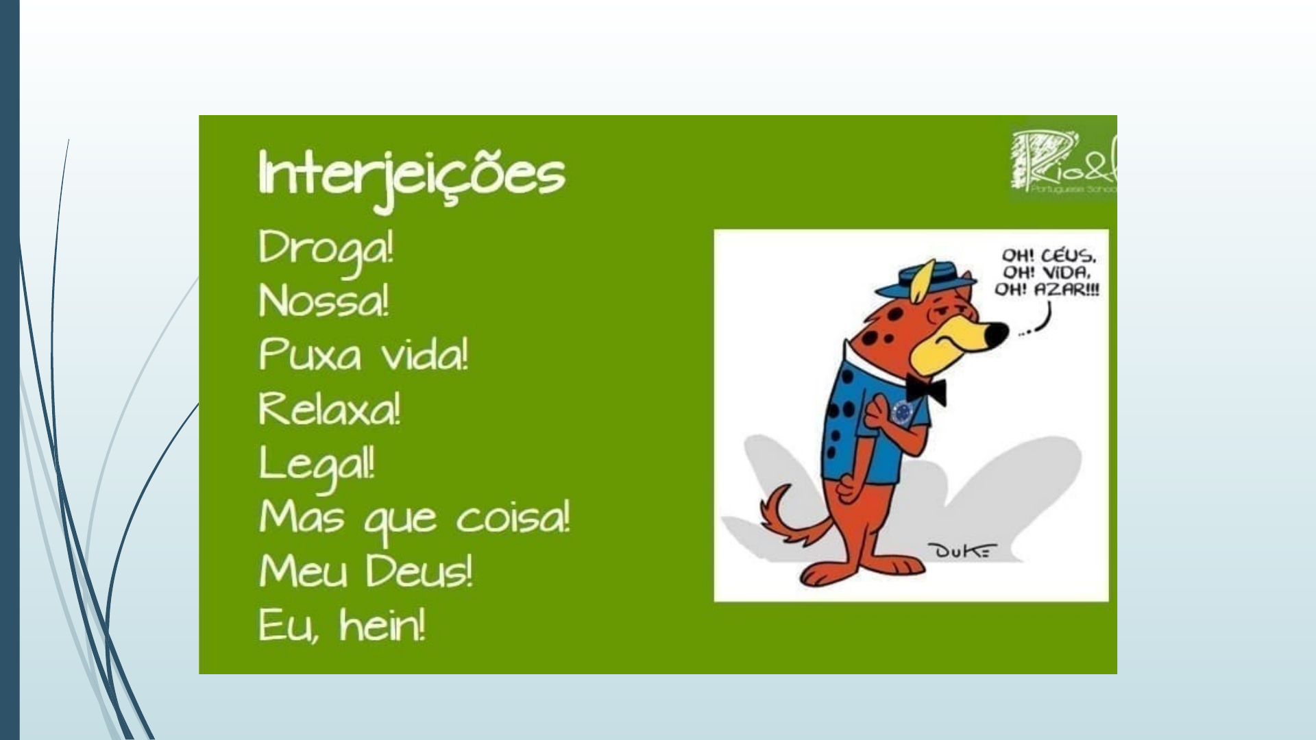 INTERJEIÇÃO !!!!!!!!!!!!!! DIÁLOGO 1 Dorinha: Droga! Marcos: O que foi, Dorinha? Dorinha: Está chovendo de novo! Não posso ir para a praia. Marcos: Ah, relaxa, Dorinha. Você sabe que, no Rio, a chuva sempre vem e vai. Você é carioca e nunca aprende. Eu, hein! Dorinha: Você tem razão, Marcos. Vamos esperar a chuva acabar e sair. Marcos: Legal! DIÁLOGO 2 Filho: Mãe Você viu minhas meias? Mãe: Não! Filho: Puxa! Mas, eu as deixei dentro dos meus sapatos ontem. Mãe: Mas que coisa! Você nunca sabe onde deixa as suas coisas, José. Meu Deus! Filho: Achei, mãe. Estavam dentro da minha gaveta de camisas. Mãe: Nossa! Isso é lugar de deixar meias sujas? Filho: Puxa vida, mãe! Eu sempre sou esquecido. A senhora sabe disso. CONCEITO As interjeições são palavras invariáveis que exprimem estados emocionais, ou mais abrangentemente: sensações e estados de espírito; ou até mesmo serve como auxiliador expressivo para o interlocutor, já que permite a adoção de um comportamento que pode dispensar estruturas linguísticas mais elaboradas. Alegria: Oba!, Eba!, Viva!, Oh!, Ah!, Que bom!, Iupi! Saudação: Oi!, Olá!, Salve!, Alô! Alívio: Ufa!, Uf!, Ainda bem!, Animação, estímulo: Coragem!, Firme!, Vamos! Aprovação, aplauso: Bravo!, Viva!, Muito bem! Desejo: Tomara!,Queira Deus!, Quem me dera! Dor: Ai! Ui! Espanto, surpresa, admiração: Oh!, Uh!, Ué!, Puxa!, Uau!, Caramba!, Caraca!, Putz!, Gente!, Nossa! Impaciência: Hum!, Diabo!, Puxa!, Pô!, Cacete, Droga! Invocação, chamamento, apelo: Alô!, Olá!, Psiu!, Socorro!, Ei!, Eh!, Ô! Medo,terror: Credo!, Cruzes! Socorro! Outros exemplos que não representam emoções: Ordem: Silêncio! Alto! Basta! Chega! Quietos! Derivados do inglês: Yes! Ok! DESPEDIDA: adeus!, até logo!, bai-bai!, tchau! DÚVIDA: hum! O que! Silêncio: psiu!, Silêncio!, Calada!, SUSPENÇÃO: alto!, Alto lá! Para lá!, Pera aí! Puxa! Puxa! Ganhei o maior prêmio do sorteio! puxa: interjeição tom da fala: euforia Puxa! Hoje não foi meu dia de sorte! puxa: interjeição tom da fala: decepção 6) Na linguagem afetiva, certas interjeições, originadas de palavras de outras classes, podem aparecer flexionadas no diminutivo ou no superlativo. Por exemplo: Calminha! Adeusinho! Obrigadinho!Tudinho! AS MAIS USADAS Afff… – Muitas pessoas usam para expressar desaprovação, insatisfação ou impaciência. Nossa! – Uma das mais populares interjeições do português, ela pode indicar espanto ou surpresa. Vixe Maria! – Originalmente vinda da expressão religiosa Virgem Maria. As pessoas usam para expressar surpresa. Meu Deus! – Usada para expressar surpresa ou medo. Huuuuum! – Indica dúvida, descrença para alguma coisa ou alguém. Ué! – Muito informal, mas muitas pessoas a usam para mostrar surpresa ou questionamento. LEIAM!! Então… – Usada quando não há nada para dizer, quando alguém quer mudar o tópico da conversa ou começar outra. Porra! – Usada em diferentes formas, expressa surpresa, espanto, incômodo, felicidade e até mesmo animação. Essa expressão é usada em contextos informais. Os brasileiros só a usam com amigos. Droga! – Tem o uso similar do porra, mas possui um impacto mais leve. Puxa vida! – Na maioria das vezes usada em um contexto negativo, é usada para expressar raiva e desapontamento. Relaxa! – Essa é uma palavra muito carioca, cariocas a usam para acalmar pessoas quando estão preocupadas ou com raiva. Legal! – Usada para dizer se alguma coisa, algum lugar até mesmo alguém é bom. Mas que coisa! – Expressão comum usada para indicar insatisfação, reprovação e surpresa. Eu, hein! – Essa expressão é comum quando as pessoas reagem a uma situação/coisa exótica ou estranha. Eita! – Expressa surpresa ou medo. Ai! – Use essa interjeição para expressar dor. Ufa! – Usada para mostra alívio. Oba! / eba! – com esta interjeição demonstramos animação. Credo! – usamos esta interjeição quando vemos algo estranho ou nojento. MAIS EXEMPLOS
