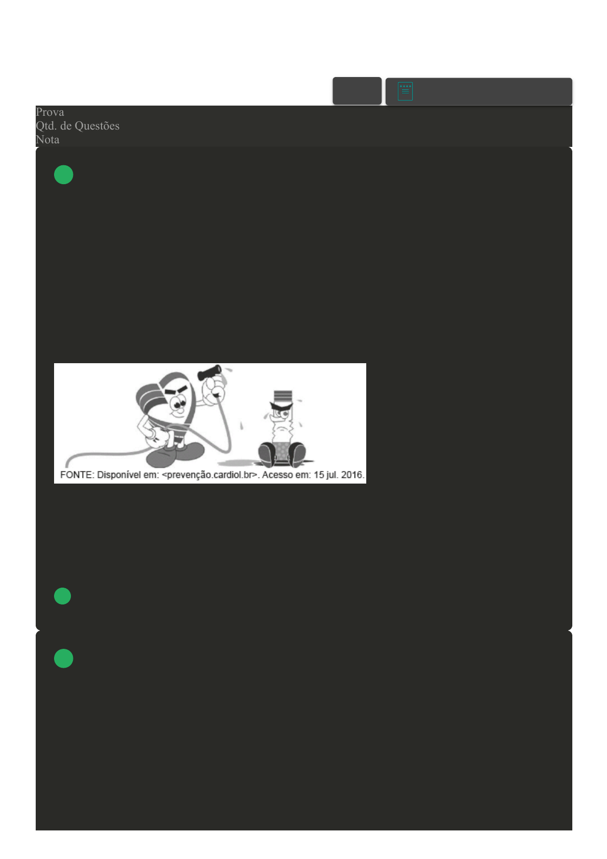 25/02/2022 16:41 Autoatividades Webaula 2 1/4 Prova Impressa GABARITO | Autoatividades Webaula 2 (Cod.:60) Prova 730895 Qtd. de Questões 5 Nota 0,20 A saúde humana depende de muitos fatores, especialmente relacionados à alimentação e ao hábito de vida. Neste sentido, o marketing social apresentou um impacto positivo importante sobre aspectos sociais na esfera da saúde pública, da segurança, do meio ambiente e do desenvolvimento comunitário. Observe a figura a seguir e classifique V para as sentenças verdadeiras e F para as falsas: ( ) O desenho apresentado possui o significado de alertar para a importância da economia de água. ( ) A figura alerta para a questão de que não devemos jogar as xepas (bitucas) de cigarro no chão. ( ) Pode-se entender que a figura alerta para a importância de não fumar para preservar a saúde cardíaca. ( ) A figura transmite a ideia de que, ao parar de fumar, beneficia a saúde do coração. Este abandono de comportamento é incentivado através desta campanha de marketing social. Assinale a alternativa que apresenta a sequência CORRETA: A V - F - V - V. B F - V - V - F. C F - F - F - V. D F - F - V - V. O Ecodesenvolvimento pressupõe uma solidariedade tanto com a geração atual quanto com as gerações futuras, no sentido de garantir as necessidades fundamentais da maioria da população e garantir a economia de recursos naturais para o desenvolvimento atual e futuro. Trata-se, portanto, do Ecodesenvolvimento, de um projeto de civilização, o qual aborda cinco dimensões da sustentabilidade. Sobre essas dimensões, associe os itens, utilizando o código a seguir: I- Sustentabilidade social. II- Sustentabilidade econômica. III- Sustentabilidade ecológica. IV- Sustentabilidade espacial. V- Sustentabilidade cultural. VOLTAR A+ Alterar modo de visualização 1 2 25/02/2022 16:41 Autoatividades Webaula 2 2/4 ( ) Baseada num processo de desenvolvimento que considera o bem-estar da sociedade. ( ) Tem como pano de fundo o equilíbrio na utilização dos recursos naturais, com a respectiva redução na produção de seus resíduos. ( ) Visa possibilitar uma gestão mais harmônica dos fluxos financeiros, não sendo enfocado somente na capacidade de lucro empresarial. ( ) Traduz-se na adoção de soluções que respeitam as especificidades de cada ecossistema. ( ) É uma das mais novas e equilibradas configurações da ocupação do solo. Assinale a alternativa que apresenta a sequência CORRETA: A I - III - V - II - IV. B I - III - II - V - IV. C III - I - II - IV - V. D I - II - III - IV - V. Muitas empresas investem em serviços e benefícios sociais organizados e implementam, dessa forma, o programa de responsabilidade social corporativa. Assim, requisitam profissionais, técnicos qualificados na área social para intervir nas relações entre capital, trabalho, qualidade de vida e sociedade. A responsabilidade social tem sido objeto de atenção de diversas profissões, tais como do Serviço Social, da Administração, da Psicologia, do Meio Ambiente, do Marketing, da Contabilidade, entre outras, visto que existem muitos aspectos que devem ser abordados e considerados quando se quer investir na área social. Sobre essa temática, analise as afirmativas a seguir: I- Sustentabilidade significa o sustento que a empresa deve fazer em projetos sociais, ambientais, éticos, educacionais de integração e inclusão social. II- A problemática socioambiental tem sido também um tema de preocupação do mundo corporativo. Assim, existem muitos investimentos na educação ambiental para propostas pedagógicas centradas na conscientização e mudança de comportamento. III- Quando se pensa em responsabilidade social, consequentemente, deve existir uma indissociável relação entre crescimento econômico, inclusão social e justiça ambiental. IV- O Balanço Social é um demonstrativo publicado anualmente pela empresa, reunindo um conjunto de informações sobre os projetos, os benefícios e as ações sociais. Assinale a alternativa CORRETA: A As afirmativas II, III e IV estão corretas. B As afirmativas I, II e IV estão corretas. C As afirmativas I e III estão corretas. D Somente a afirmativa IV está correta. Pesquisa realizada pelo Instituto de Pesquisa Econômica e Aplicada - IPEA -, demonstrou um crescimento significativo entre os anos 2000 e 2004 com relação à proporção de corporações privadas que realizaram ações sociais em prol comunitário no Brasil, passando de 59% para 69%. Observe a tabela anexa e, de acordo com os dados, assinale a alternativa CORRETA que apresenta as principais ações sociais dos empresários do Brasil: 3 4 25/02/2022 16:41 Autoatividades Webaula 2 3/4 FONTE DA IMAGEM: IPEA. A iniciativa privada e o espírito público: a evolução da ação social das empresas privadas no Brasil. Brasília, 2006. Disponível em: <http://www.ipea.gov.br/acaosocial/IMG/pdf/doc-44.pdf>. Acesso em: 31 maio 2017. A Os empresários do Brasil conferem grande ênfase nas ações destinadas ao problema alimentar. B Os empresários do Brasil conferem grande ênfase nas ações destinadas à cultura. C Os empresários do Brasil conferem grande ênfase nas ações destinadas ao meio ambiente. D Os empresários do Brasil conferem grande ênfase nas ações destinadas ao problema da segurança. As pressões da sociedade, com relação às atitudes socialmente responsáveis das empresas, resultaram em iniciativas referentes à normalização dos modos de gestão relacionados ao meio ambiente, saúde e segurança dos funcionários e à responsabilidade social como um todo. Com base nisso, associe os itens, utilizando o código a seguir: I- Norma AA 1000. II- Norma SA 8000. III- Norma GRI (Global Reposting Iniciative). ( ) Essa norma tem o objetivo de assegurar a avaliação do desempenho ético e social, o envolvimento e o comportamento do público envolvido, os valores e administração corporativa, os impactos dos produtos e serviços e 
