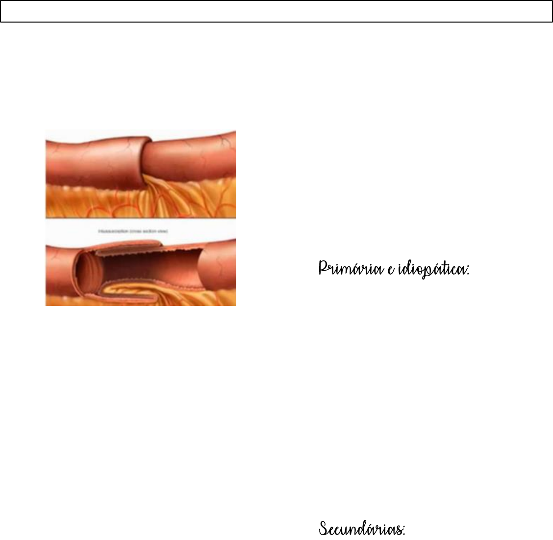 Invaginação Intestinal (Intussuscepção) Introdução • Ocorre quando um segmento proximal de alça intestinal (intussussceptum) penetra num segmento distal (intussuscipiens), com compressão vascular mesenterial, com consequente edema, congestão ve- nosa, isquemia, necrose, perfuração e pe- ritonite; • Resulta de diferenças de peristalse ou de calibre, com entrada da intussussceptum na intussuscipiens; • Apresenta um pico de incidência entre 5-9 meses (60-65%), de forma que, apenas 10- 25% ocorrem em >2 anos; • Pode ocorrer em qualquer idade, neonatal e idosos; • 60-70% em meninos; • Em geral, ocorre em crianças bem nutri- das e sem doenças prévias; • Maior incidência em épocas do ano com maior índice de infecções respiratórias e di- gestivas, principalmente por adenovírus, por uma resposta inflamatória do organismo e aumento dos gânglios intestinais, que se tornam obstáculos (durante a peristalse) e facilitam a invaginação; • Mais de 80% são na região ileocecal (íleo ceco cólica), resultando da desproporção dos calibres íleo terminal e ceco; • Outras regiões podem ser menos acome- tidas, em ordem: íleo-ileal, ceco-cólica, je- juno-jejunal; • Em geral, inicia-se no íleo terminal, avan- çando em direção ao ceco; • Pode haver progressão por todo cólon e prolapso de via retal. Causas → • Cerca de 90% apresentam causa primá- ria e idiopática; • A parede do íleo terminal é rica em tecido linfoide e, muitas vezes, observa-se hiper- plasia linfoide (HP); • A hiperplasia linfóide pode servir como ponto de apoio (“cabeça”) para invagina- ção; • Frequente a presença de adenite mesenté- ria e hiperplasia linfoide na vigência de in- fecções respiratórias e gastrointestinais (adenovírus); • Frequente a presença de adenite após invaginação. → • Cerca de 10% são secundárias; • Vacinação por rotavirus: foi observado um aumento de casos após vacinação (não confirmado por estudos); • Podem ter causas: - Doenças do TGI; - Doenças sistêmicas; - Divertículos de Meckel, Pólipos, Cistos e Tumores (linfoma), servindo como obstá- culo e favorecendo a ocorrência de invagi- nação intestinal; - Outras menos comuns; • Maioria após 2 anos. Marianne Barone (15A) Cirurgia Pediátrica – Prof. Danilo Faria Invaginação pós-operatória: • 1-2% dos casos; • 90% limitada ao delgado; • Cirurgias abdominais e extra-abdominais; • Em geral, pela dismotilidade intestinal pós-operatória, ou seja, retorno da motili- dade intestinal pós-anestésica e manipula- ção da cavidade abdominal; • Retorno de motilidade: a diferença de re- torno de motilidade pode levar a invagina- ção por regiões que já obtiveram sua moti- lidade enquanto outras ainda estão imóveis ou sem motilidade adequada, com diferença de calibres; - Intestino delgado: após 24h; - Estômago: até 24-28horas; - Cólon: 48-72 horas. Quadro clínico → • Quadro clássico típico em lactentes bem nutridos, entre 4-9 meses de idade, sem do- enças prévias; • Sinais e sintomas: - Dor abdominal aguda intensa e intermi- tente; - Palidez cutânea e contração dos membros inferiores; - Criança bem e evacuação presente; - Novos surtos de dor, com sudorese, vô- mitos e irritabilidade; - Evacuação em geleia de morango (san- gue e muco), por descamação das camadas epiteliais associadas a edema; - Caso não haja resolução, há sintomas obstrutivos e peritonite + sepse (perfuração). → • Simulando uma gastroenterocolite aguda (GECA); • Invaginação indolor com sintomas pobres e diagnóstico tardio (10-20%); • Sintomas obstrutivos precoces em caso de invaginação alta; • Púrpura de Henoch-Schoenlein tem quadro semelhantes a invaginação por he- matomas na parede das alças. → • Forma intermitente, em crianças maiores de 2 anos; • Dor abdominal recorrente, vômitos, ano- rexia, alteração do hábito intestinal, perda de peso; • Geralmente, associado a aparecimento de doença associada (linfoma ou divertículo de Meckel); • O organismo reduz espontaneamente a in- vaginação, podendo ser percebido no exame físico uma massa palpável intermitente (cilíndrica/chouriço), denominada de tu- mor fantasma, em qualquer região do ab- dome, principalmente na região do colo di- reito ascendente (região íleo-ceco-cólica); • Obstrução incompleta, sem isquemia ou necrose, pela resolução espontânea do qua- dro (ainda que seja intermitente e tenha re- cidiva); • Sinal de Dance: fossa ilíaca direita vazia, por haver entrada das alças em direção ao colo transverso; • Evacuação em geléia de morango; • Em geral, não há distensão abdominal, exceto nas fases tardias, por haver um diag- nóstico precoce na maioria dos casos. Diagnóstico • Quadro clínico + palpação de massa e ge- leia de morango são suficientes para fechar diagnóstico; • Exames complementares: - Raio-X: escassez de ar em fossa ilíaca direita e lateralização do íleo, com dilatação do mesmo, indicando sinais de obstrução intestinal (ruídos hidroaéreos, distensões); - USG: é o exame de escolha para diag- nóstico e tratamento, apresentando: ▷ Imagem em “ALVO”: transversal, com camadas concêntricas de ecogenicida- des diferentes; ▷ Imagem em “pseudo rim”: longitu- dinal; - TC: pode ter imagem em alvo ou pseudo rim; - Enema opaco: usado em diagnóstico e tratamento, com administração de contraste via retal que atinge a área de obstrução e podendo apresentar imagem em “casca de cebola” ou “taça”, apresentando como des- vantagens a irradiação e possíveis compli- cações. Tratamento → • Deve ser feito apenas com respaldo cirúr- gico, monitorado por ultrassom ou fluoros- copia, apresentando sucesso de 70-90%, menor em crianças <3 meses; • Pode ser feita por intermédio de US, TC ou enema opaco, com administração de enema baritado, radiação gasosa ou redução de solu