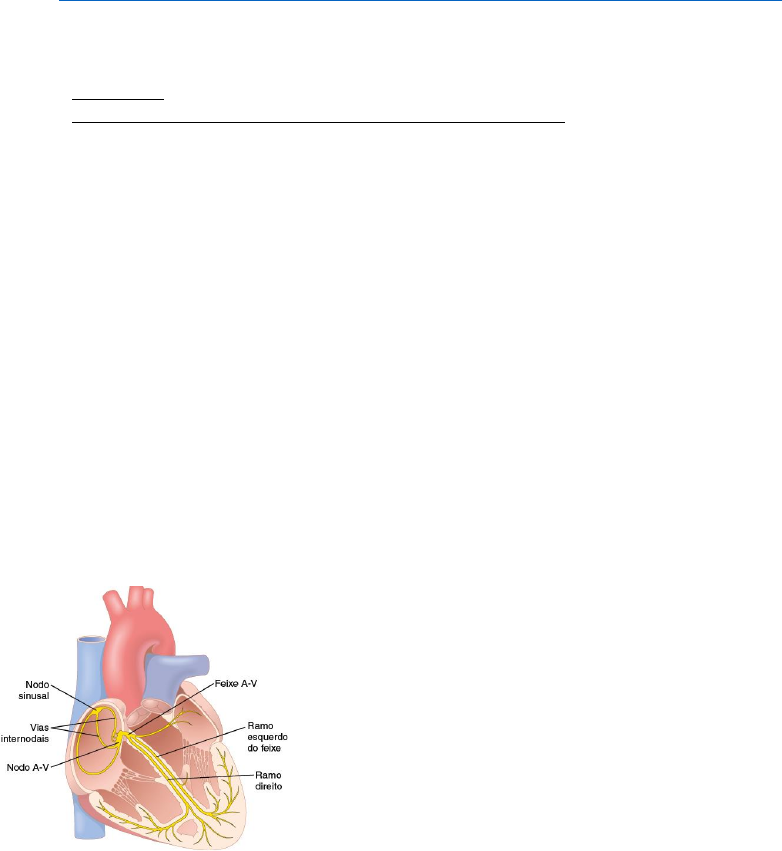 Camila Rizzo – T4 M1 2P XXV TUTORIA 4 - BLOQUEIO NERVOSO Extras: http://rca.fmrp.usp.br/wp-content/uploads/sites/176/2017/06/Fisiologia-Cardiovascular. FONTE: Tratado de Fisiologia Médica (GUYTON) • Objetivos: 1. Explicar o sistema excitação-condução rítmica do coração - O sistema: (1) gera impulsos elétricos rítmicos para iniciar contrações rítmicas do miocárdio; (2) conduz esses impulsos rapidamente por todo o coração. - átrios se contraem antes da contração ventricular, o que permite o enchimento dos ventrículos, antes de bombearem o sangue para os pulmões e para a circulação periférica - ele faz com que as diferentes porções do ventrículo se contraiam quase simultaneamente, o que é essencial para gerar pressão, com o máximo de eficiência, nas câmaras ventriculares. O SISTEMA EXCITATÓRIO E CONDUTOR ESPECIALIZADO DO CORAÇÃO - o sistema especializado condutor e excitatório do coração que controla as contrações. - nodo sinusal (também chamado de nodo sinoatrial ou nodo S-A), no qual são gerados os impulsos rítmicos normais; - as vias internodais que conduzem os impulsos do nodo sinusal ao nodo atrioventricular (nodo A-V); o próprio nodo A-V, no qual os impulsos vindos dos átrios são retardados antes de passar para os ventrículos; - feixe A-V, que conduz os impulsos dos átrios para os ventrículos, e os ramos direito e esquerdo do feixe de fibras de Purkinje, que conduzem os impulsos cardíacos para todas as partes dos ventrículos. NODO SINUSAL (SINOATRIAL) - nodo sinusal: é uma faixa pequena, achatada e elipsoide, de músculo cardíaco especializado. - Está situado na parede posterolateral superior do átrio direito, imediatamente abaixo e pouco lateral à abertura da veia cava superior. - As fibras desse nodo quase não têm filamentos musculares contráteis, e tem cada uma apenas 3 a 5 micrômetros de diâmetro, diferindo dos 10 a 15 micrômetros de diâmetro das fibras atriais musculares que as circundam. - as fibras do nodo sinusal se conectam diretamente às fibras musculares atriais, de modo que qualquer potencial de ação que se inicie no nodo sinusal se difunde de imediato para a parede do músculo atrial. • Ritmicidade Elétrica Automática das Fibras Sinusais - Algumas fibras cardíacas têm a capacidade de autoexcitação, processo que pode causar descarga automática rítmica e, consequentemente, contrações rítmicas. Essa capacidade é de modo especial válida para as fibras do sistema condutor especializado cardíaco, incluindo as fibras do nodo sinusal. - nodo sinusal controla normalmente a frequência dos batimentos de todo o coração • Mecanismos da Ritmicidade do Nodo Sinusal - entre as descargas o “potencial de repouso da membrana” da fibra sinusal tem negatividade de aproximadamente −55 a −60 milivolts, comparada com −85 a −90 milivolts da fibra muscular ventricular. http://rca.fmrp.usp.br/wp-content/uploads/sites/176/2017/06/Fisiologia-Cardiovascular Camila Rizzo – T4 M1 2P XXV - explicação para essa menor negatividade ventricular é que as membranas celulares das fibras sinusais são por natureza mais permeáveis ao -cálcio- e ao sódio, e as cargas positivas desses íons, que cruzam a membrana, neutralizam boa parte da negatividade -intracelular.- - miocárdio apresenta três tipos de canais iônicos nas suas membranas que desempenham papéis importantes para deflagrar as variações da voltagem do potencial de ação. Eles são: (1) canais rápidos de sódio; (2) canais de cálcio do tipo L (canais lentos de sódio-cálcio); (3) canais de potássio. - A abertura dos canais rápidos de sódio é responsável pelo potencial em ponta rápido do potencial de ação, observado no músculo ventricular por causa da entrada rápida de íons sódio positivos para a fibra. - Em seguida, o “platô” do potencial de ação ventricular é originado, em sua grande parte, pela abertura mais vagarosa dos canais de sódio-cálcio lentos. - Por fim, a abertura dos canais de potássio permite a difusão de grandes quantidades de íons positivos de potássio para o exterior da fibra muscular, trazendo o potencial de membrana de volta a seu nível de repouso. - Entretanto, existe uma diferença no funcionamento desses canais nas fibras do nodo sinusal, pois o seu valor “de repouso” é bem menos negativo — apenas −55 milivolts na fibra nodal, em lugar dos −90 milivolts na fibra muscular ventricular. - Nesse valor de −55 milivolts, os canais rápidos de sódio já foram em sua maioria “inativados”, o que significa que ficaram bloqueados. - a qualquer momento em que o potencial da membrana esteja menos negativo que os −55 milivolts, por mais do que poucos milissegundos, as comportas de inativação na membrana celular que fecham os canais de sódio se fecham e assim se mantêm. Dessa maneira, só os canais lentos de sódio-cálcio podem se abrir (isto é, serem “ativados”) e assim deflagrar o potencial de ação. - Como resultado, o potencial de ação nodal atrial ocorre mais lentamente que o potencial de ação do músculo ventricular. - depois de ocorrer o potencial de ação, a volta do potencial para seu estado negativo ocorre lentamente, diferentemente do retorno abrupto nas fibras ventriculares. • Autoexcitação das Fibras do Nodo Sinusal. - Em virtude da alta concentração de íons sódio no líquido extracelular por fora da fibra nodal, além do número razoável de canais de sódio já abertos, os íons positivos de sódio tendem a vazar para o interior dessas células. É por isso que, entre os batimentos cardíacos, o influxo de sódio positivamente carregado provoca lento aumento do potencial de membrana de repouso em direção aos valores positivos. - o potencial “de repouso” gradualmente aumenta e fica menos negativo entre dois batimentos cardíacos. Quando o potencial atinge o limiar de voltagem de cerca de −40 milivolts, os canais de cálcio do tipo L são 