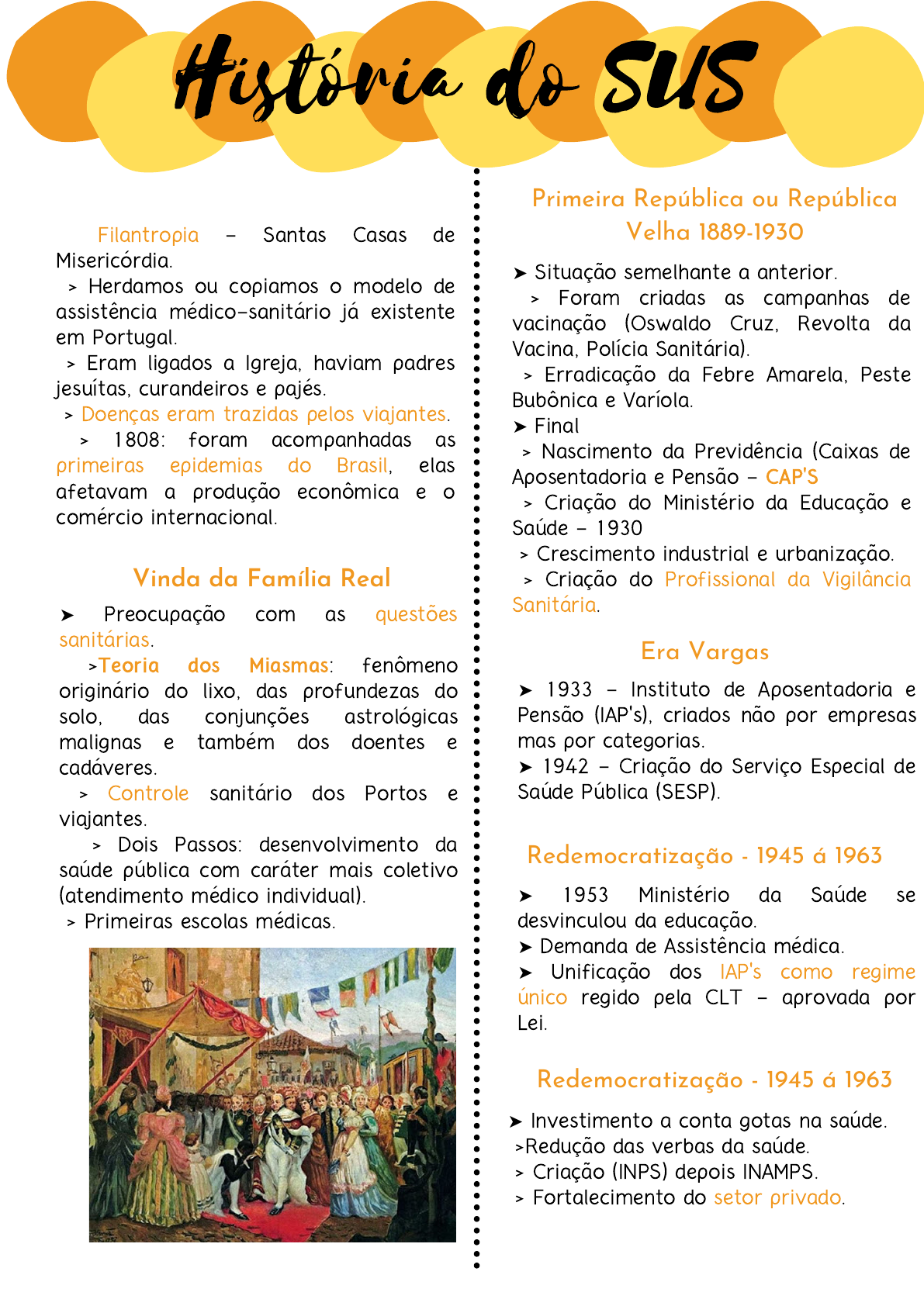 Brasil Colônia ➤ Filantropia - Santas Casas de Misericórdia. > Herdamos ou copiamos o modelo de assistência médico-sanitário já existente em Portugal. > Eram ligados a Igreja, haviam padres jesuítas, curandeiros e pajés. > Doenças eram trazidas pelos viajantes. > 1808: foram acompanhadas as primeiras epidemias do Brasil, elas afetavam a produção econômica e o comércio internacional. Primeira República ou República Velha 1889-1930 Vinda da Família Real ➤ Preocupação com as questões sanitárias. >Teoria dos Miasmas: fenômeno originário do lixo, das profundezas do solo, das conjunções astrológicas malignas e também dos doentes e cadáveres. > Controle sanitário dos Portos e viajantes. > Dois Passos: desenvolvimento da saúde pública com caráter mais coletivo (atendimento médico individual). > Primeiras escolas médicas. ➤ Situação semelhante a anterior. > Foram criadas as campanhas de vacinação (Oswaldo Cruz, Revolta da Vacina, Polícia Sanitária). > Erradicação da Febre Amarela, Peste Bubônica e Varíola. ➤ Final > Nascimento da Previdência (Caixas de Aposentadoria e Pensão - CAP'S > Criação do Ministério da Educação e Saúde - 1930 > Crescimento industrial e urbanização. > Criação do Profissional da Vigilância Sanitária. Era Vargas ➤ 1933 - Instituto de Aposentadoria e Pensão (IAP's), criados não por empresas mas por categorias. ➤ 1942 - Criação do Serviço Especial de Saúde Pública (SESP). História do SUS Redemocratização - 1945 á 1963 ➤ 1953 Ministério da Saúde se desvinculou da educação. ➤ Demanda de Assistência médica. ➤ Unificação dos IAP's como regime único regido pela CLT - aprovada por Lei. Redemocratização - 1945 á 1963 ➤ Investimento a conta gotas na saúde. >Redução das verbas da saúde. > Criação (INPS) depois INAMPS. > Fortalecimento do setor privado. Nova República - 1985 á 1988 Governo responsável pelo gerenciamento á saúde. ➤ Conquista do direito á cidadania. > VIII Conferência Nacional de Saúde (participação popular). > Criação do SUPS (intermédio para o SUS).